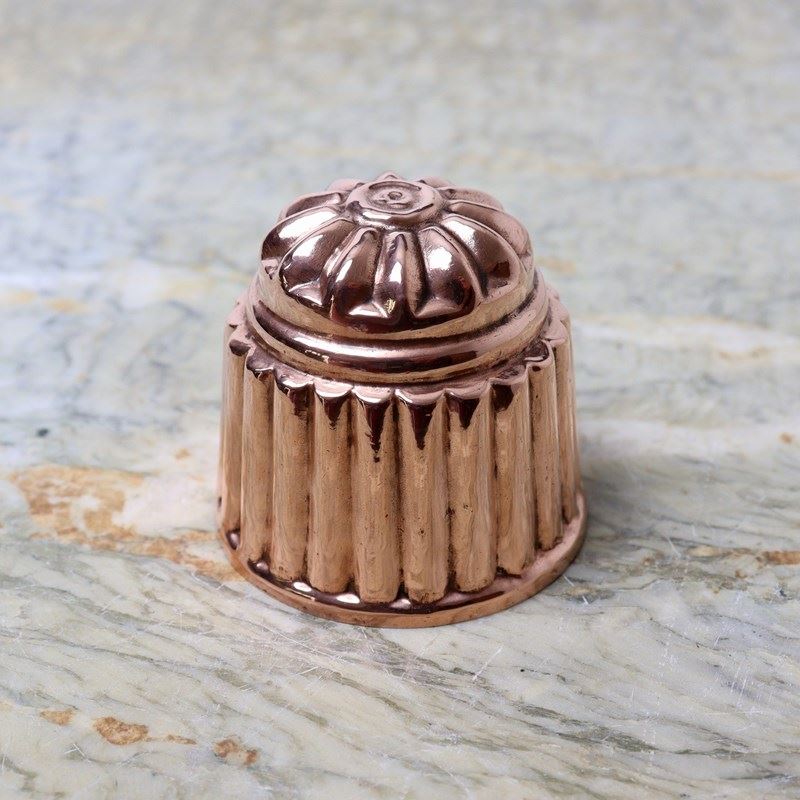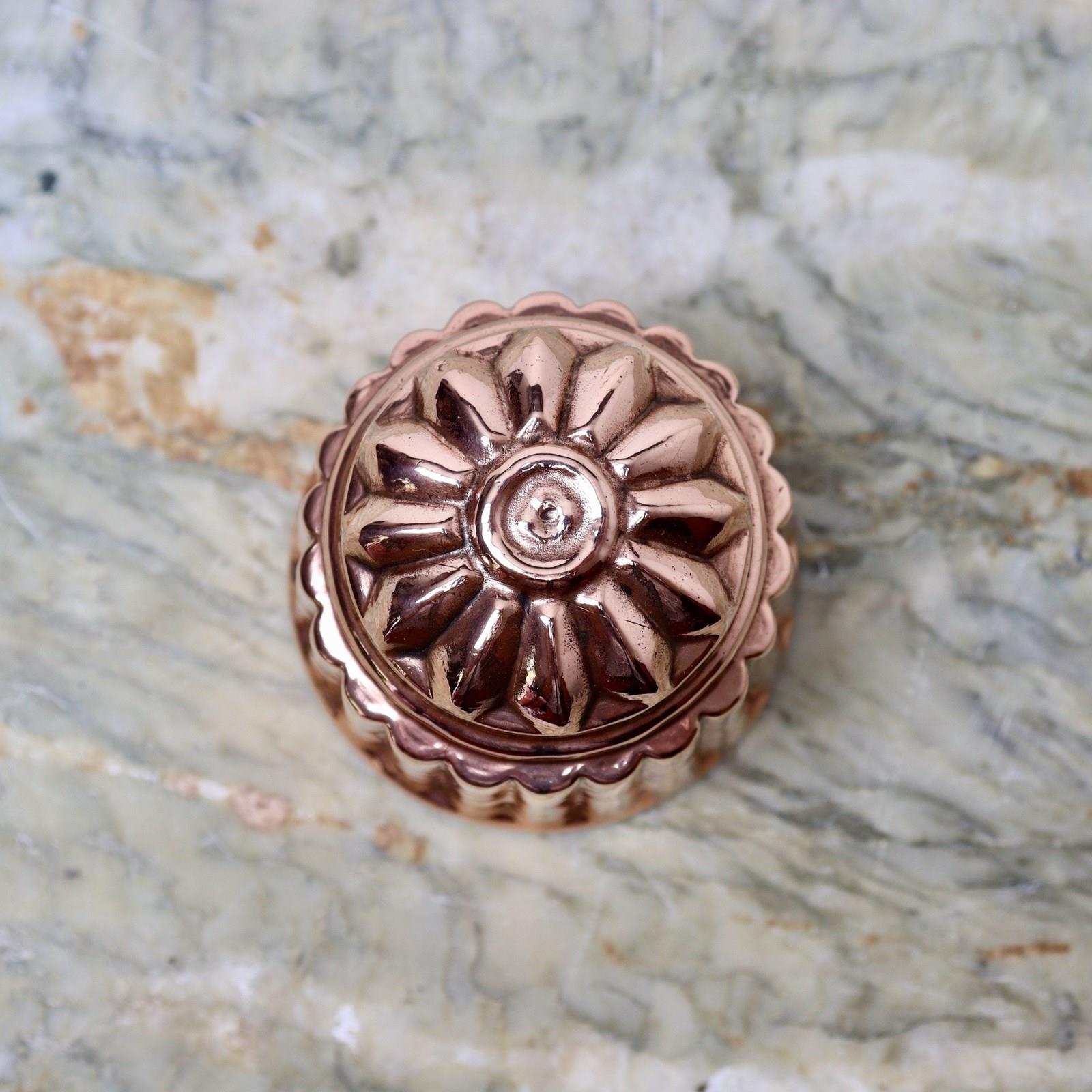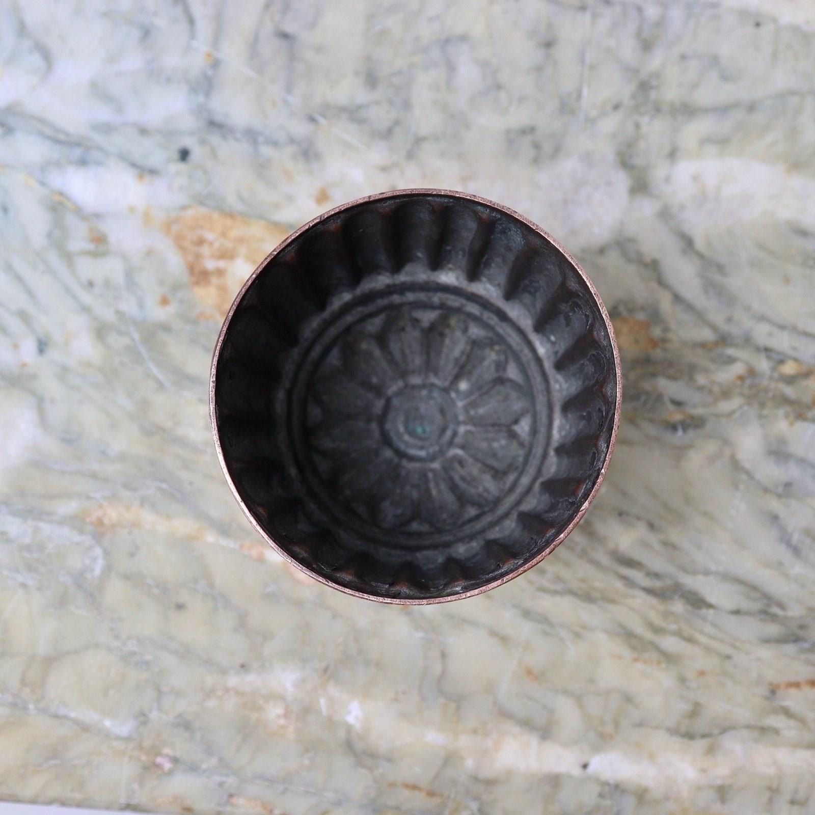 An unusual, 19th century, miniature copper mould. This is English and it dates from c.1880. It is well made, from a heavy gauge of copper. It has a stylised flower design to the top above narrow, fluted sides. It is in very good condition but the tinning, to the interior, is worn.