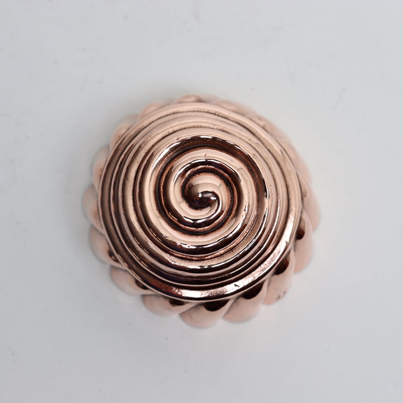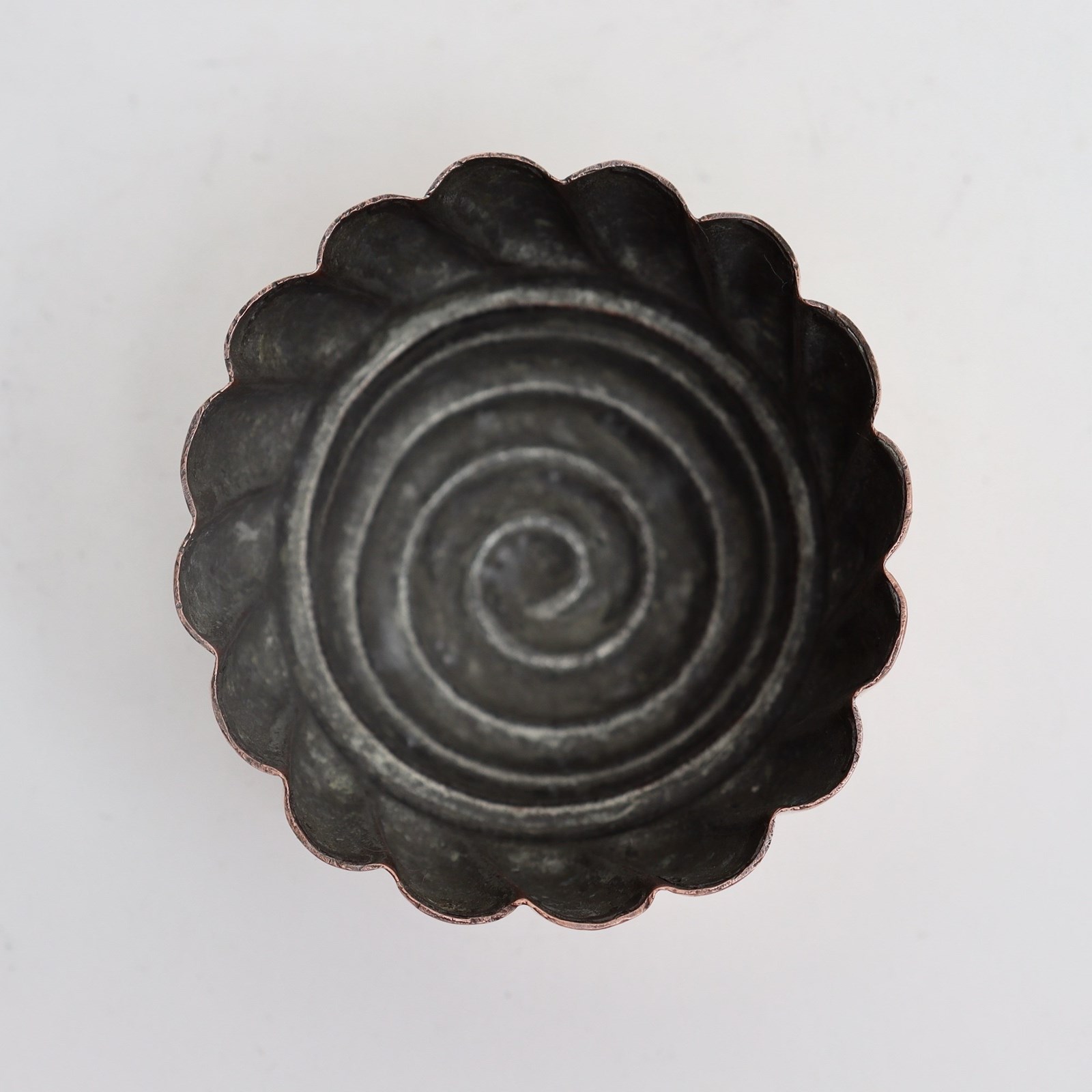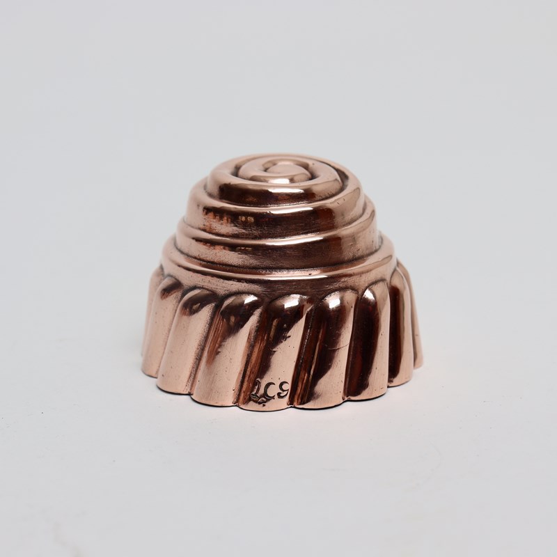 A nineteenth century, miniature copper mould with a spiral top above wrythen fluted sides. This is made from quite a heavy gauge of copper and it dates from c.1890. It is stamped with a pattern number “109” and it is in very good condition. The tinning, to the interior, is worn but the mould could still be used occasionally.