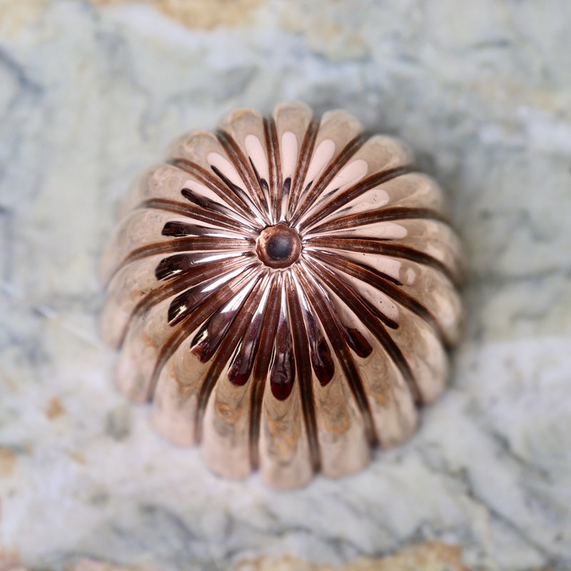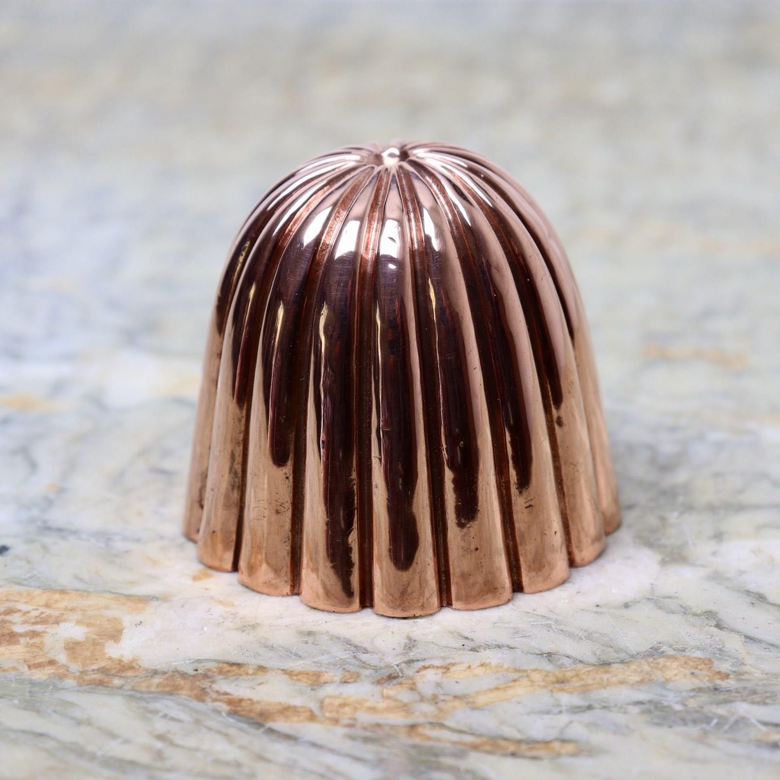 A small, dome shaped, copper mould. This is English and it dates from c.1890. It is well made, from a substantial gauge of copper, and has narrow fluting. It is in very good condition but the tinning, to the interior, is worn.