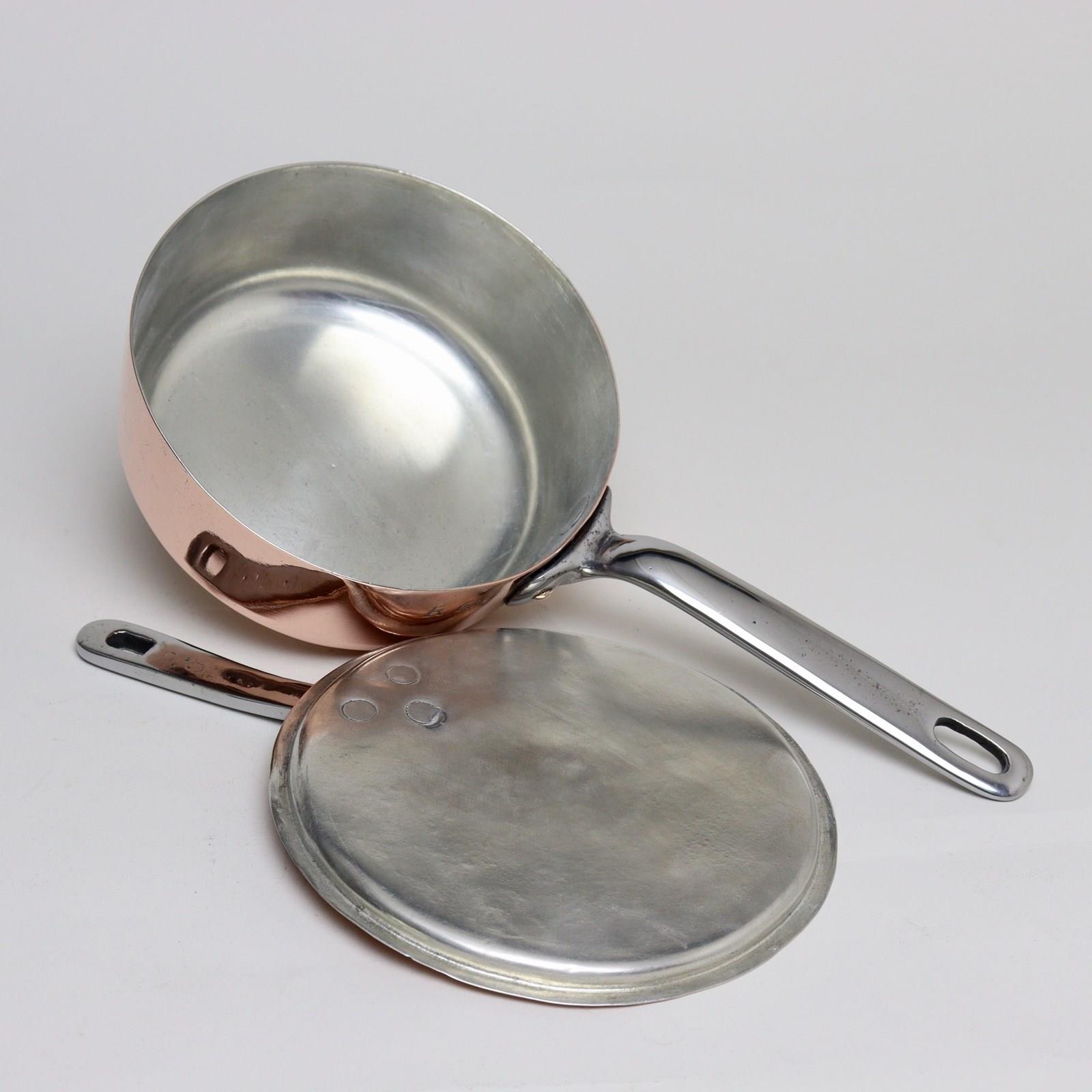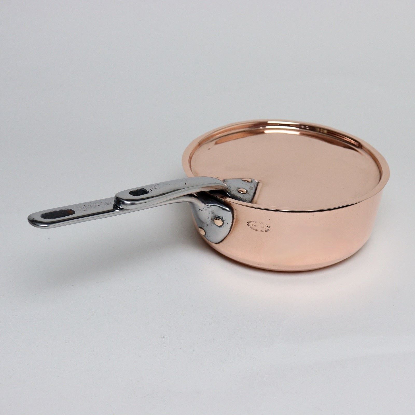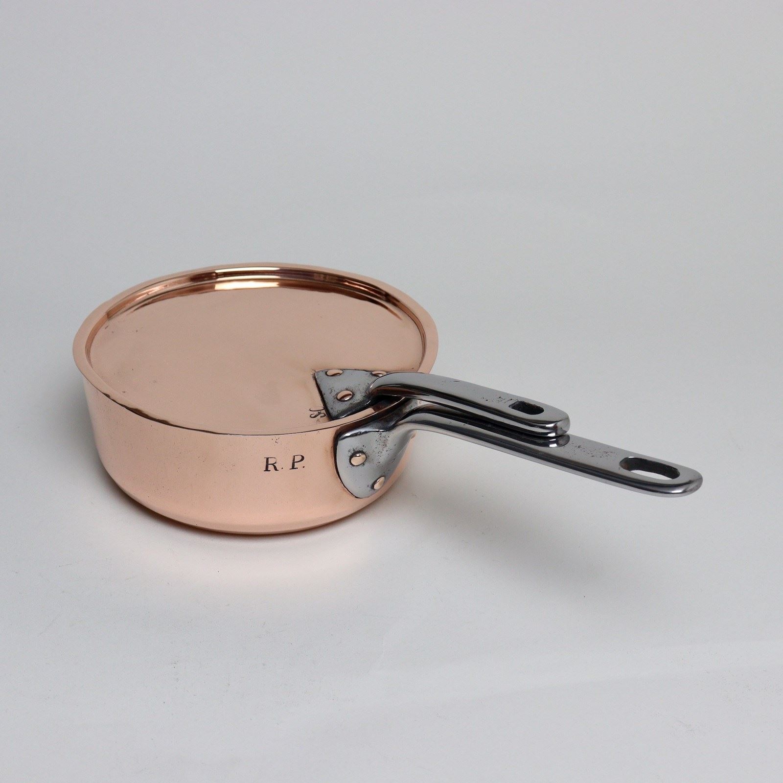 A small, 19th century, English copper deep saute pan and cover. The pan is marked ”SMITH & MATTHEWS. 5 HIGH ST. BLOOMSBURY W.C.” and it dates from c.1870. It is also engraved with the initials “R.P” and the lid is engraved “S.O”. It is made from an exceptionally heavy gauge of copper and it is in excellent condition. The interior has been re-tinned so that it can be used.