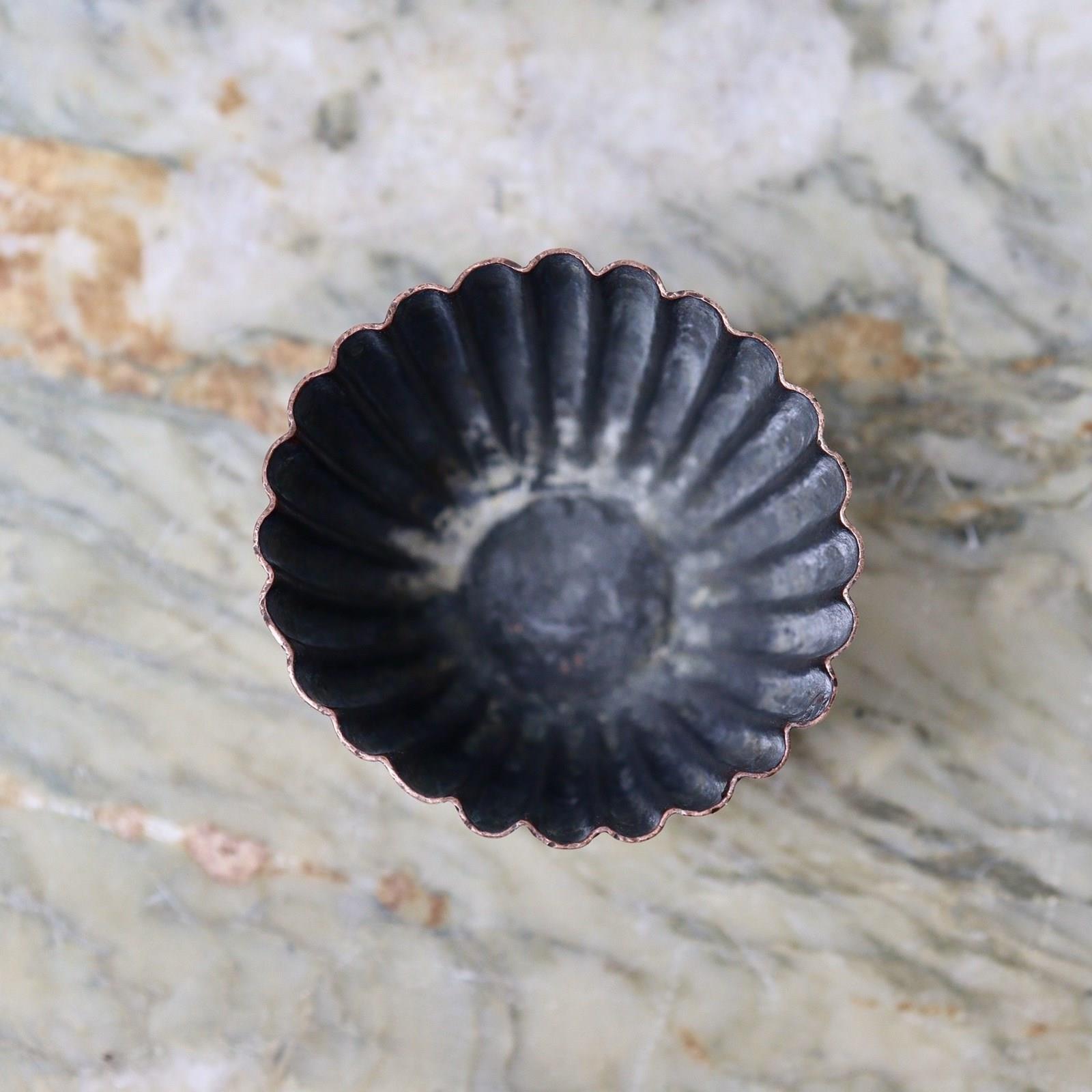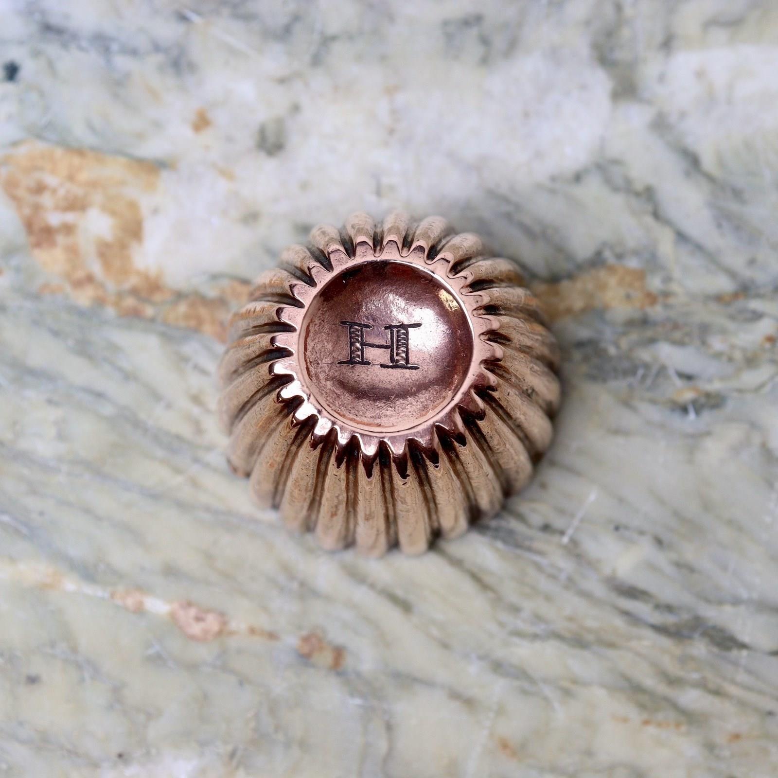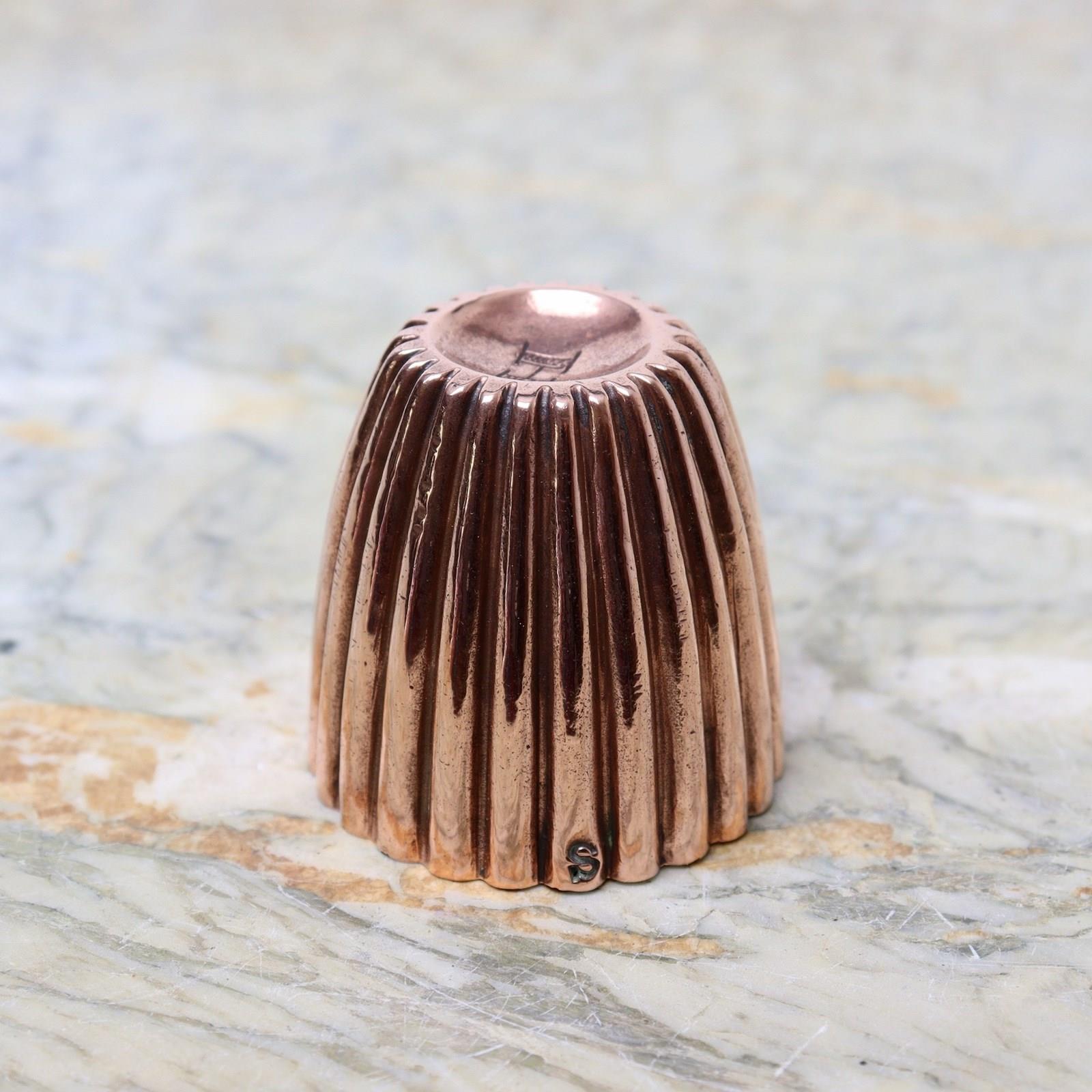 A 19th century, miniature copper mould with fluted sides and a sunken top. This is well made, from a heavy gauge of copper. It is English and it dates from c.1880. The side of the mould is stamped with a small “S” and the top is nicely engraved with the letter “H” which would be the initial of the original owner. It is in excellent condition but the tinning, to the interior, is worn.