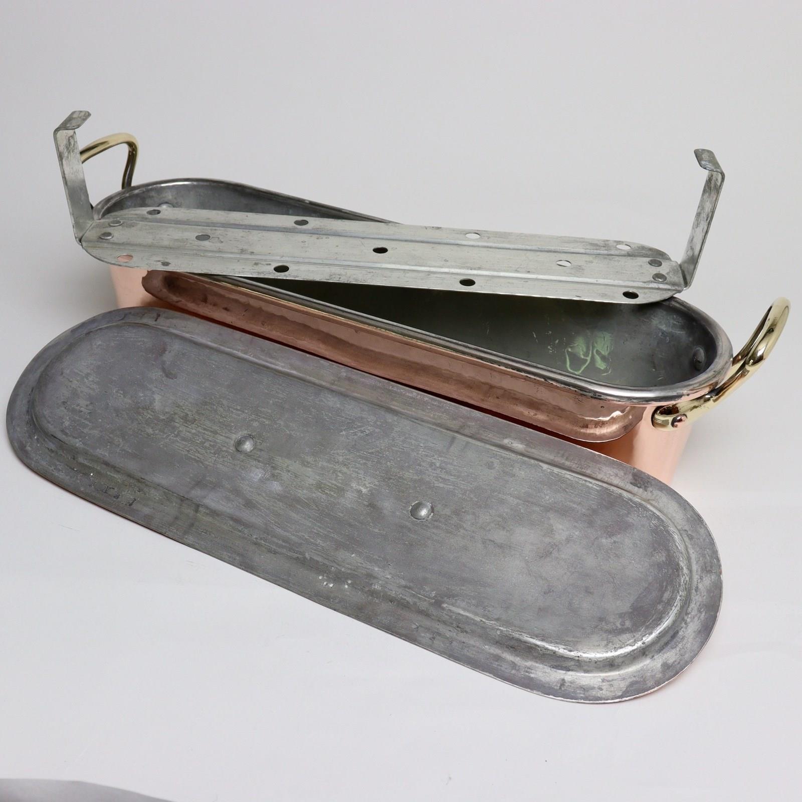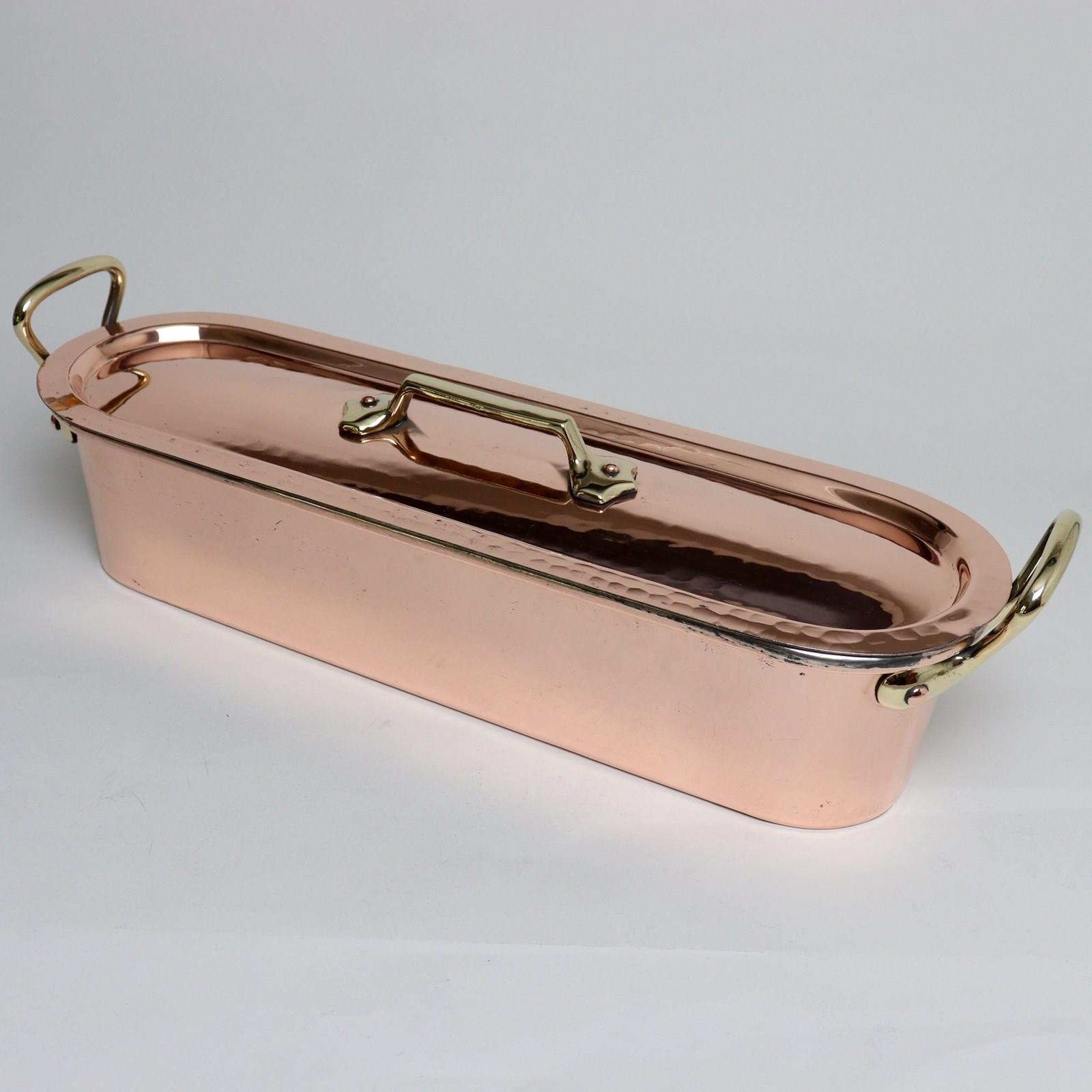 A small, French copper salmon kettle complete with drainer. This is well made, from a heavy gauge of copper, and the copper has a planished finish. The brass handles are a typical French shape and the piece dates from c.1900. It is in excellent condition and although we haven’t had it re-tinned, the tinning is still in very good, usable condition.