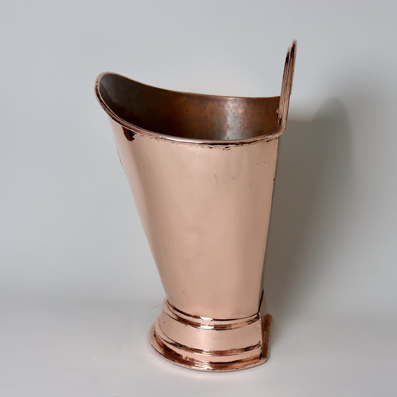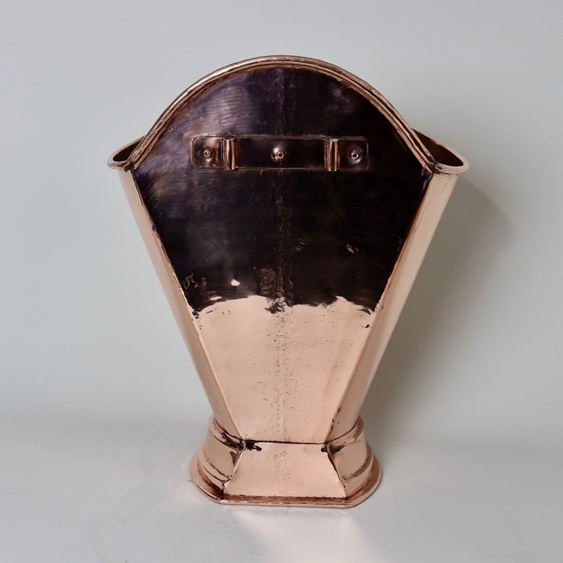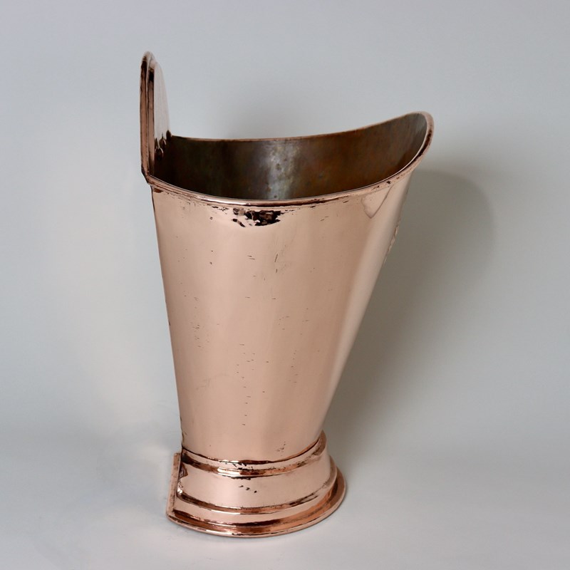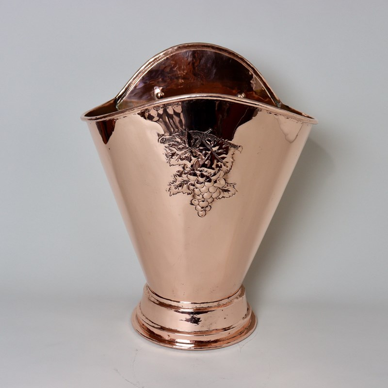 A small, 19th century, French copper grape hod. This would have been used for collecting grapes when picking from the vines. It would have been strapped onto the back of the picker and the grapes were thrown over the shoulder and into the hod. It still has its original fittings through which the leathers straps were attached. he front of the hod is embossed with a bunch of grapes. It is well made, from quite a heavy gauge of copper, and it dates from c.1890. It is in excellent condition. This is a small example and now would be ideal for use as a waste bin or for a large display of flowers.