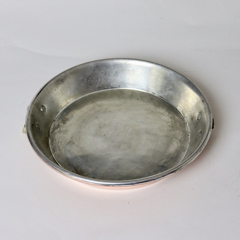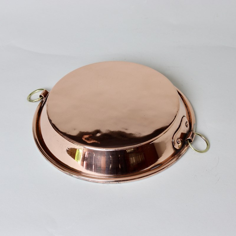 A small, 19th century, French copper gratin dish. This is made from a substantial gauge of copper, it has a rolled rim and two small, brass ring handles which are attached by simple copper fittings. It dates from c.1890 and is in excellent condition. The interior has been re-tinned so that it can be used.