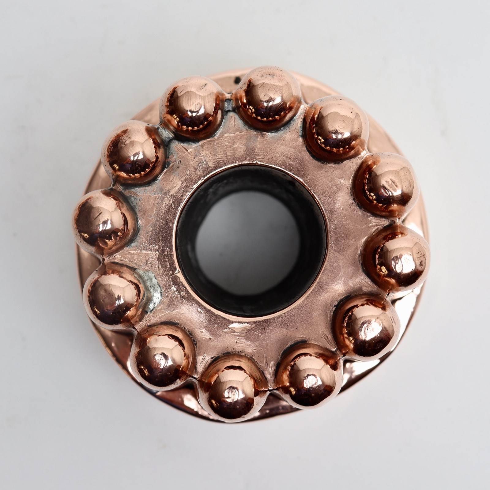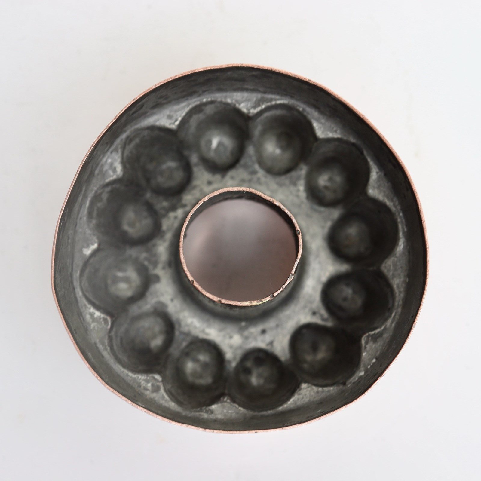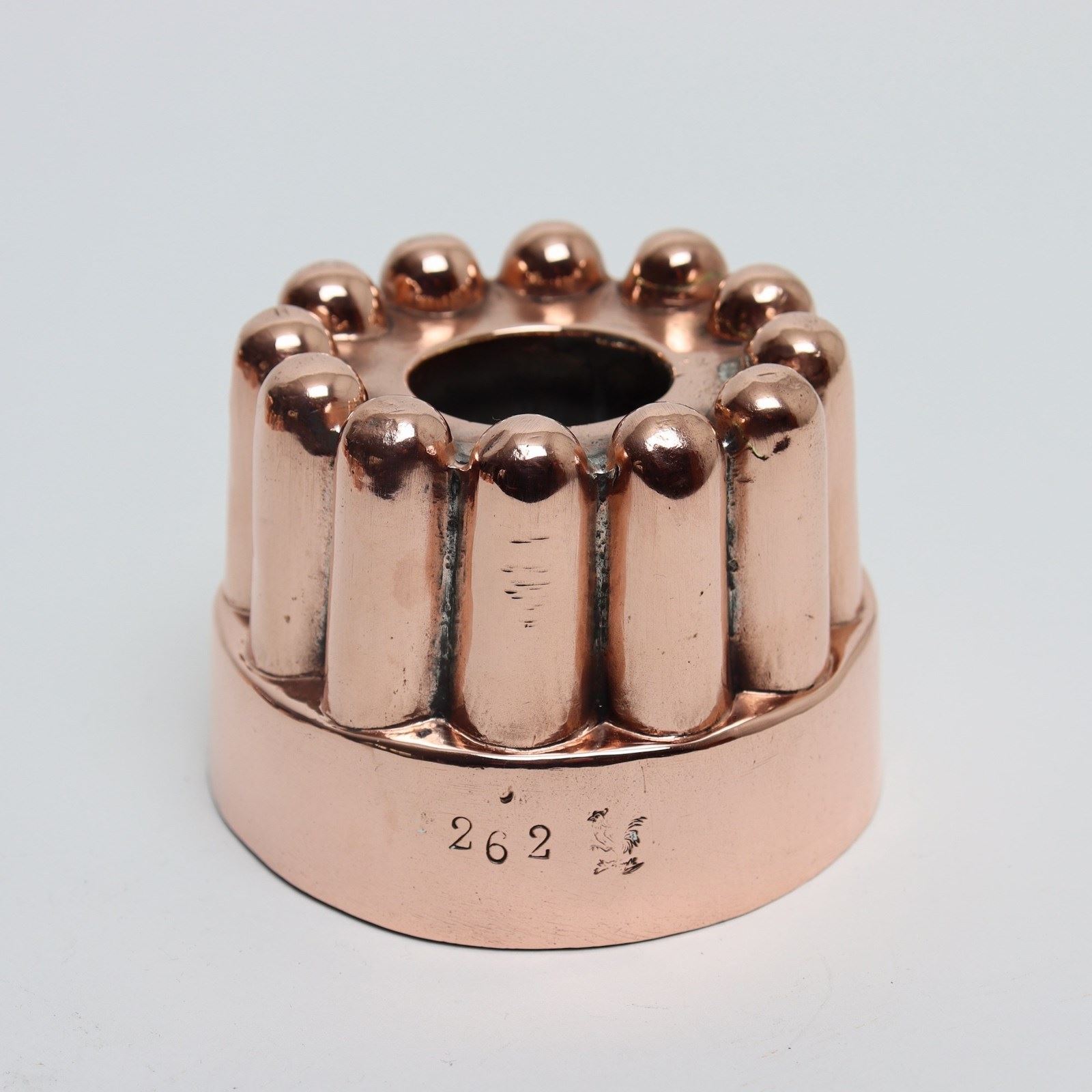 A small, 19th century, French copper mould. This is stamped with a cockerel, which is the mark of Letang, and it also bears the pattern number “262”. It dates from c.1890. The simple design consists of twelve, dome top columns around a central pipe. There is a small, soldered repair to the top and there is very minor denting to the sides.