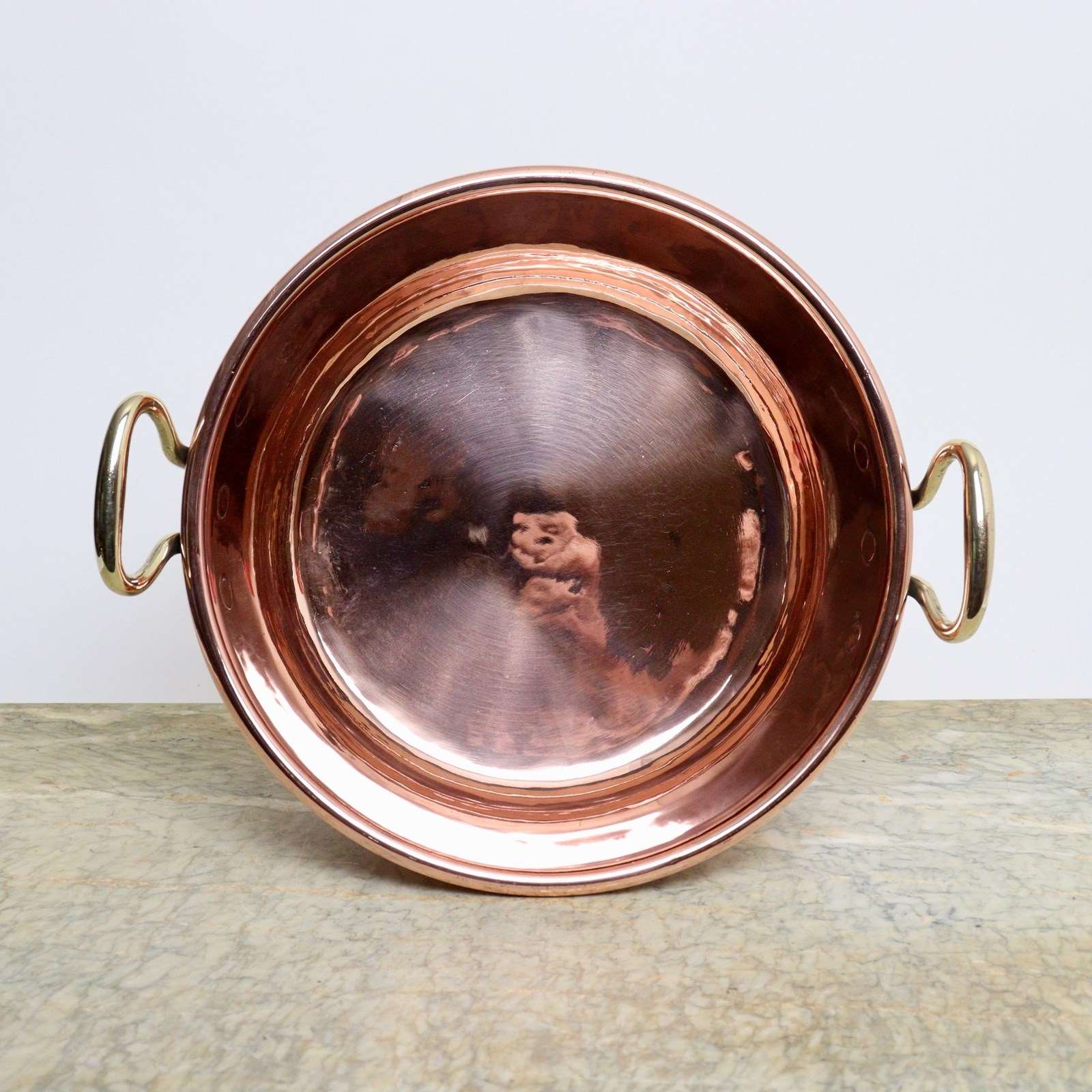 A good quality, small, nineteenth century, French copper preserve pan. This is made from a heavy gauge of copper and it dates from c.1880. It has the typical French shape of brass handles to either side and a rolled rim. It is in excellent condition.