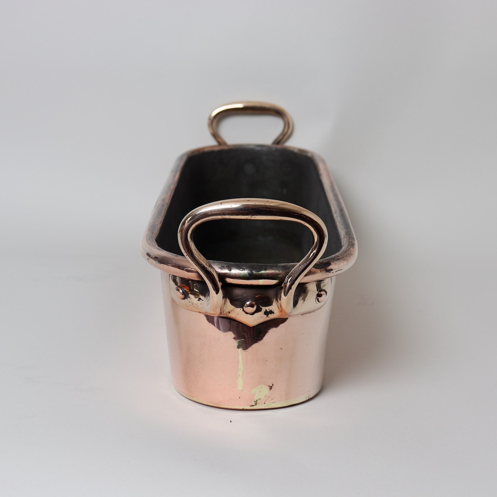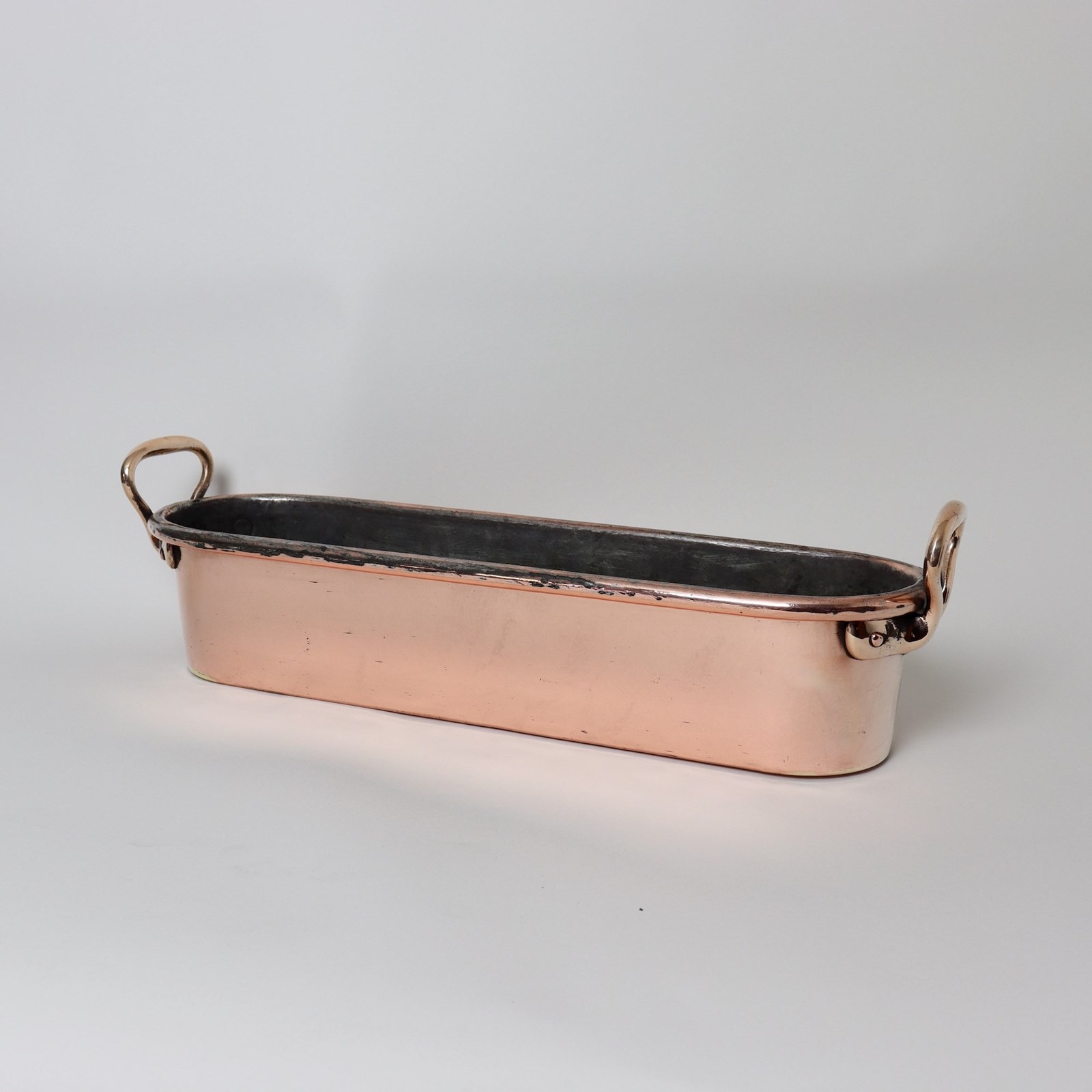 A fairly small, 19th century, French copper salmon kettle. This is made from a very heavy gauge of copper and it dates from c.1880. It has castellated seams around the base and up one end, a rolled rim, and the typical French style of brass handles to either end. It is in very good condition but the tinning, to the interior, is worn so it is no longer good for cooking in. However, this shape makes a super jardiniere for pots of herbs on a kitchen windowsill or for a flower display on a table.