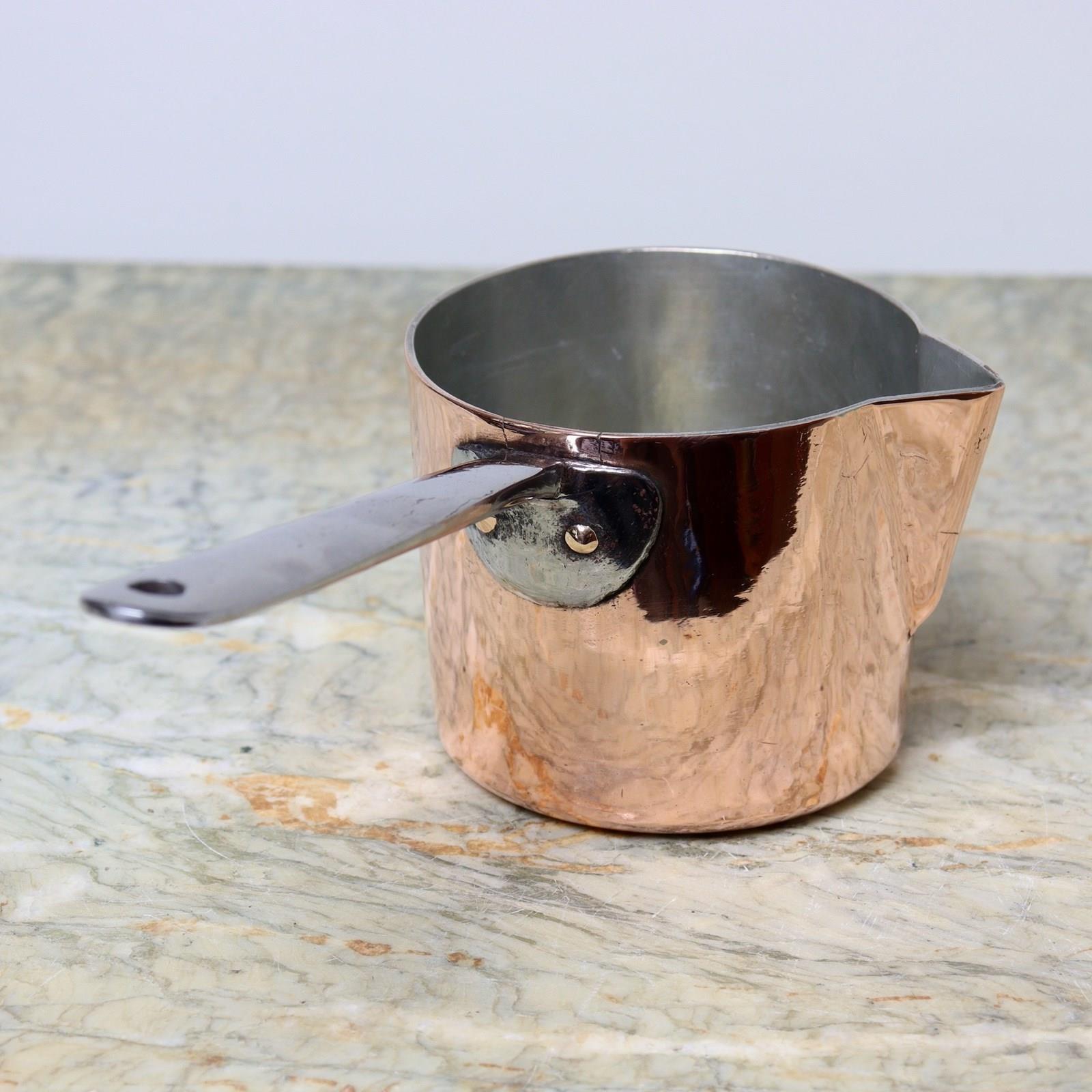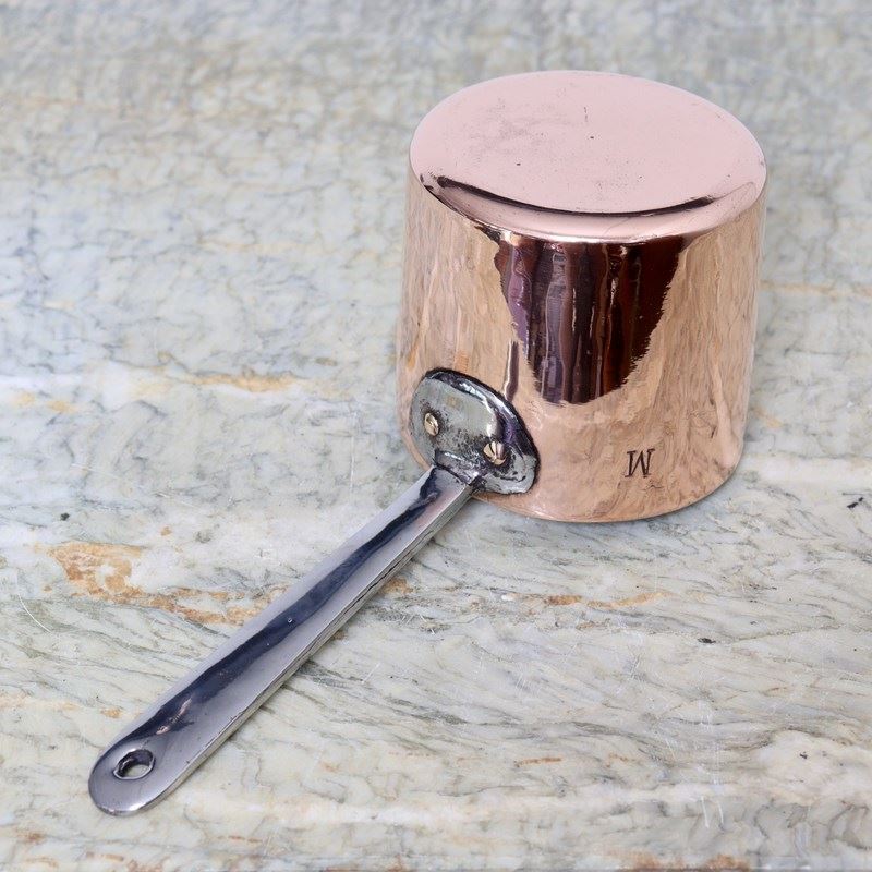 A small, 19th century, French copper saucepan with a pouring spout. This is a good quality pan, made from a heavy gauge of copper, and it dates from c.1890. It is engraved with a large letter “M”, which would be the initial of a previous owner, but there are no manufacturers marks. It has a simple form of steel handle and a wide pouring spout. There is very slight pitting to the steel handle, from use, but otherwise it is in very good condition. The interior has been re-tinned so that it can be used.