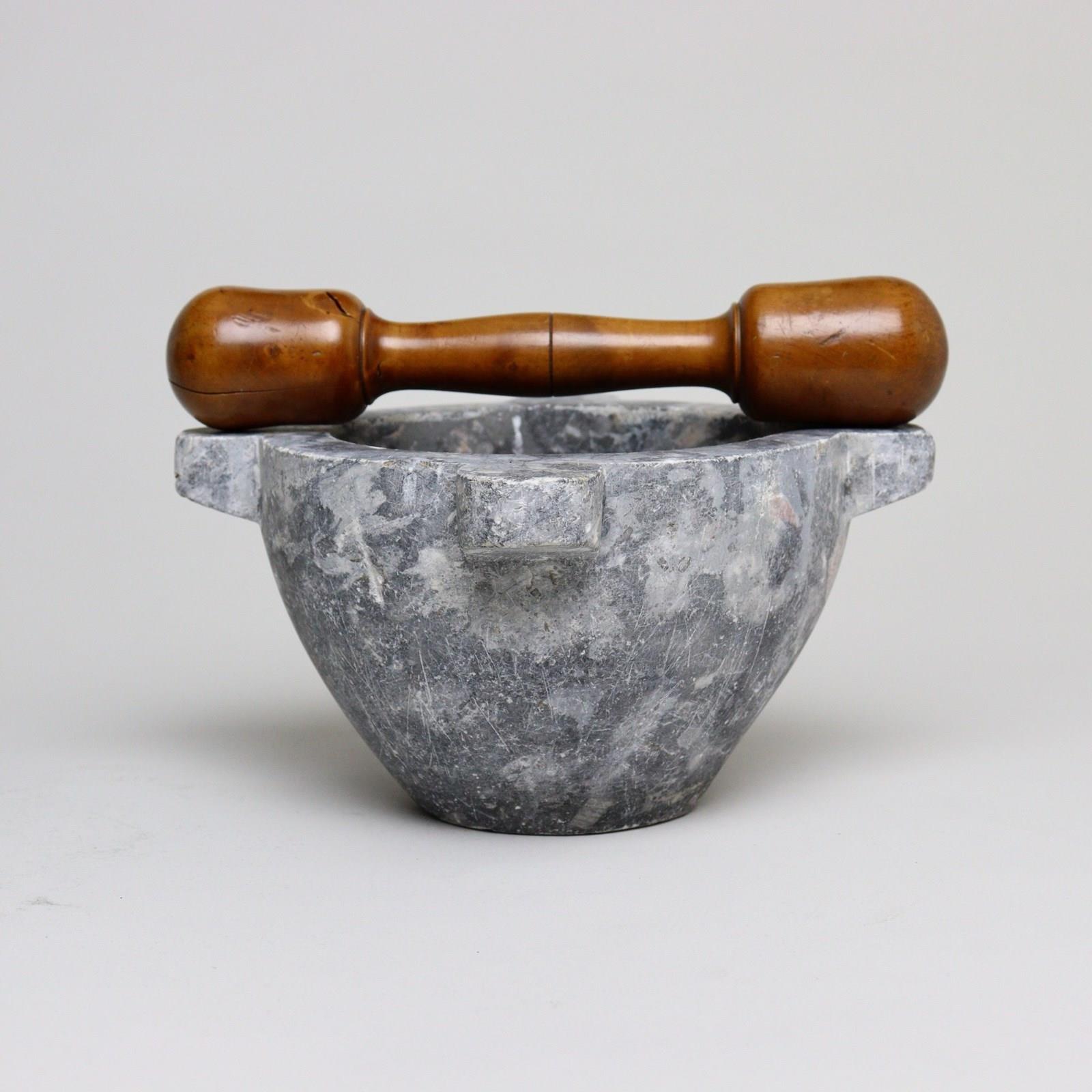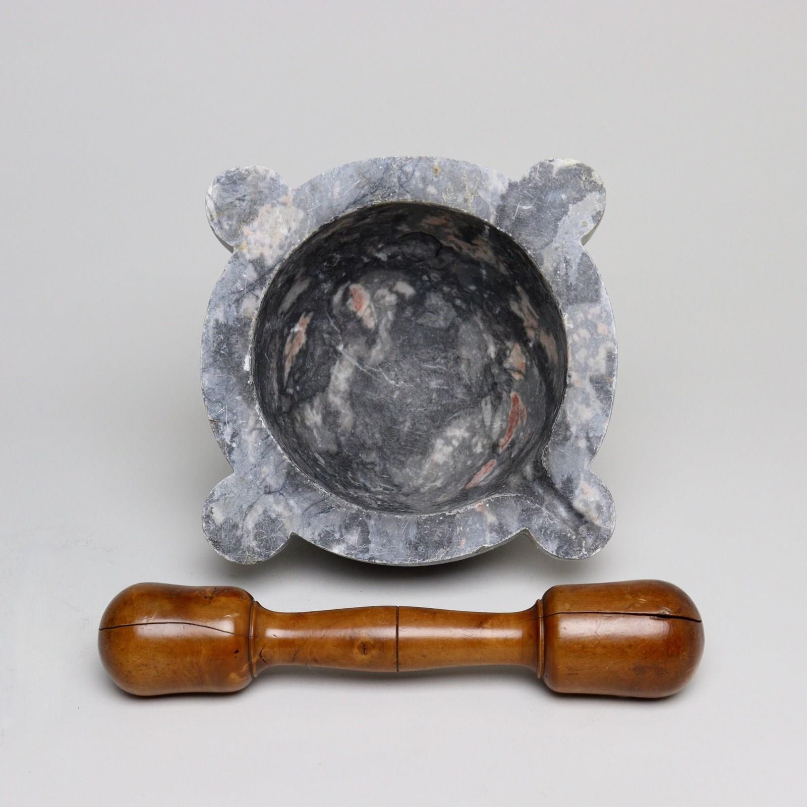 A lovely quality, small, early 19th century, grey and salmon pink marble mortar with a double ended, boxwood pestle. This is probably grey St. Laurent marble from Italy. The colours in the marble range from dark grey, through to light grey, white and salmon pink and this colour combination is very attractive. It dates from c.1820 and is in excellent condition. The boxwood pestle has cracks in both ends but the wood has a beautiful patina.