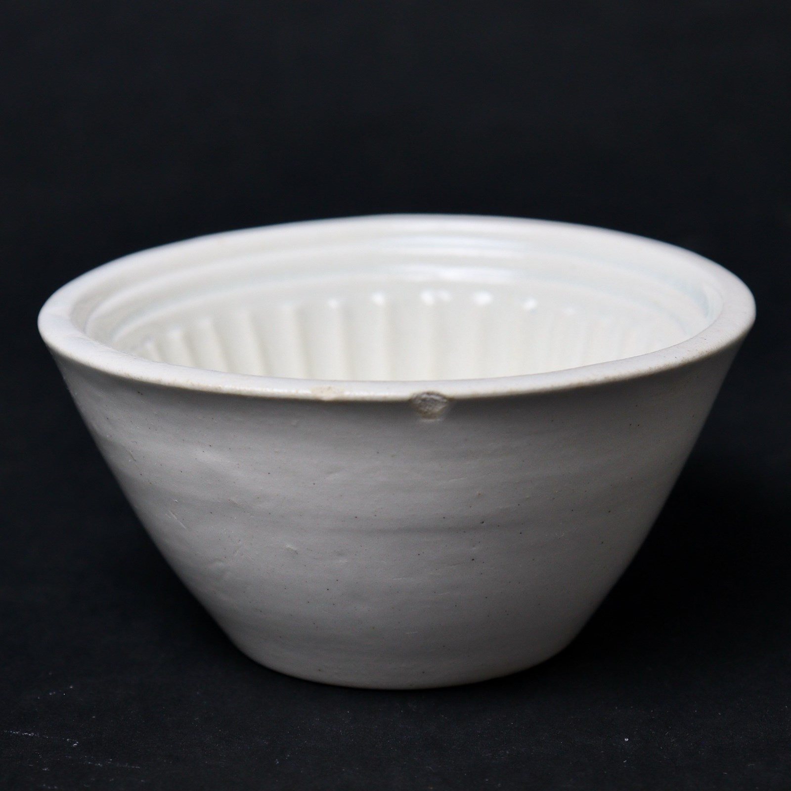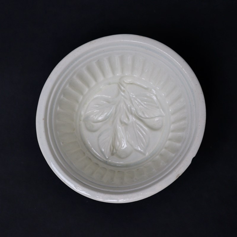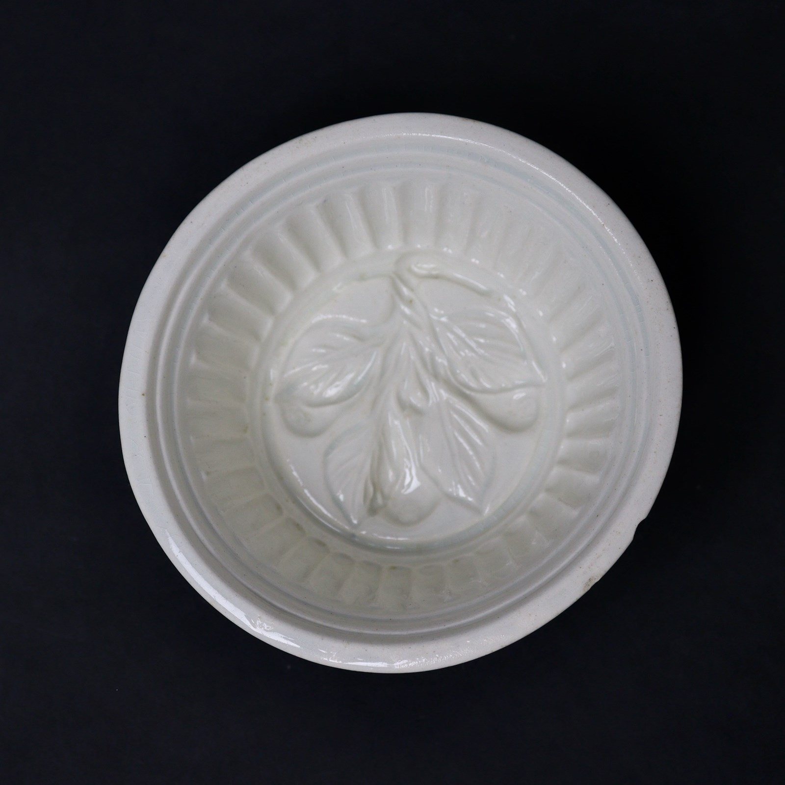 A small, 19th century ironstone mould with a bunch of fruit to the base. These are probably meant to be pears and they lay on a flat top above fluted sides. The mould is made from ironstone and has a blue glaze. It is English, and it dates from c.1860. The moulding is well detailed and it would turn out well. There is a small chip on the rim but otherwise it is in good condition.