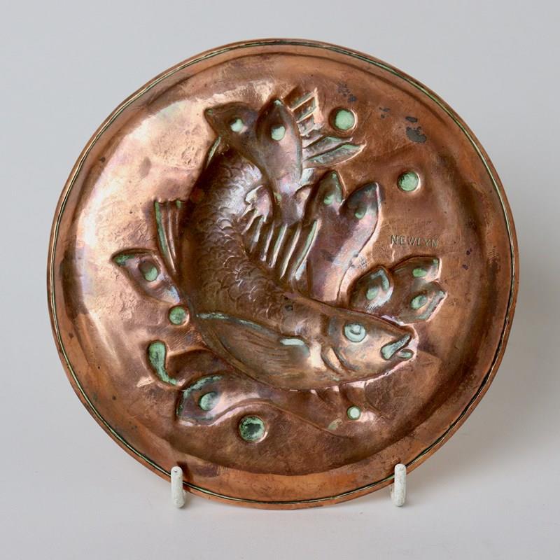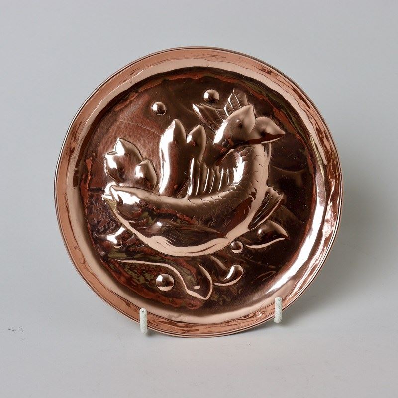 A small, Newlyn Copper tray. This is marked “NEWLYN” to the reverse of the tray, and it dates from c.1900. The design depicts a fish and is typical of the designs produced by the Newlyn Copper works from their inception in 1890 to when they closed about 30 years later. It is in excellent condition. The face has been polished but the reverse has not and it retains its original patina.