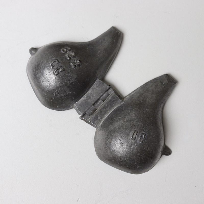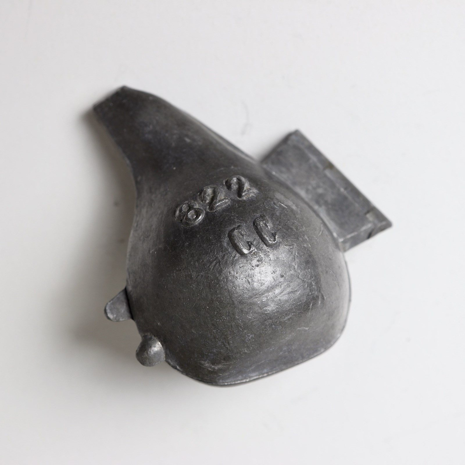 A small, French, pewter ice cream mould in the shape of a fig. This is marked, in the casting to one side, “822” above “C.C”. C.C. is the mark of the French company Cadot and 822 is the pattern number. The other side is just marked “C.C”. The mould is very well modelled and it dates from c.1880. It is in excellent condition. The interior is still in very good, bright, usable condition and the exterior has a dark patina.