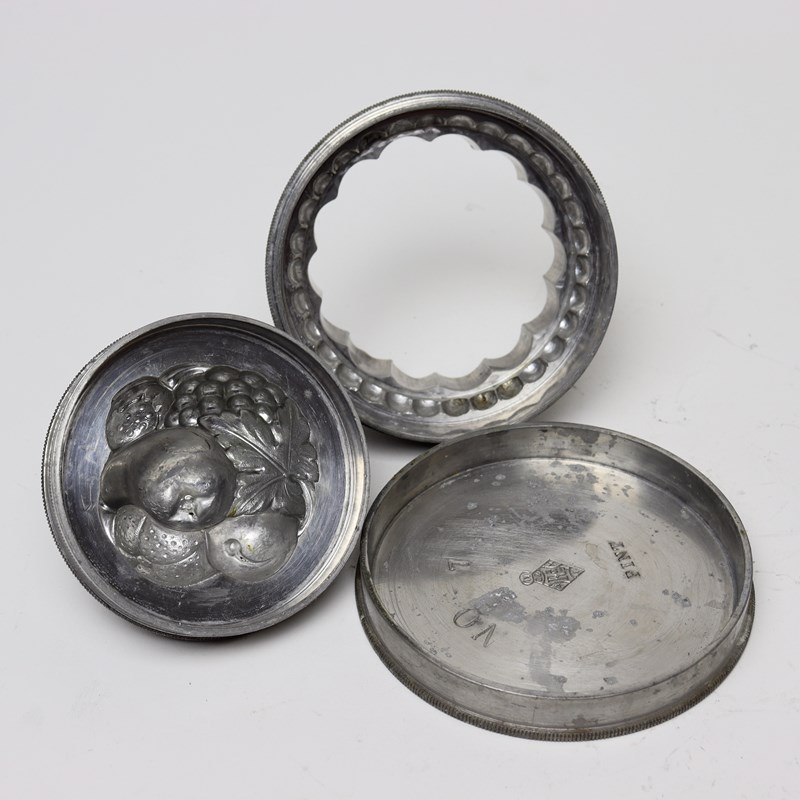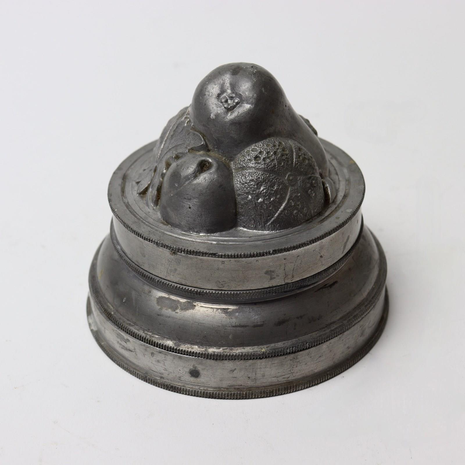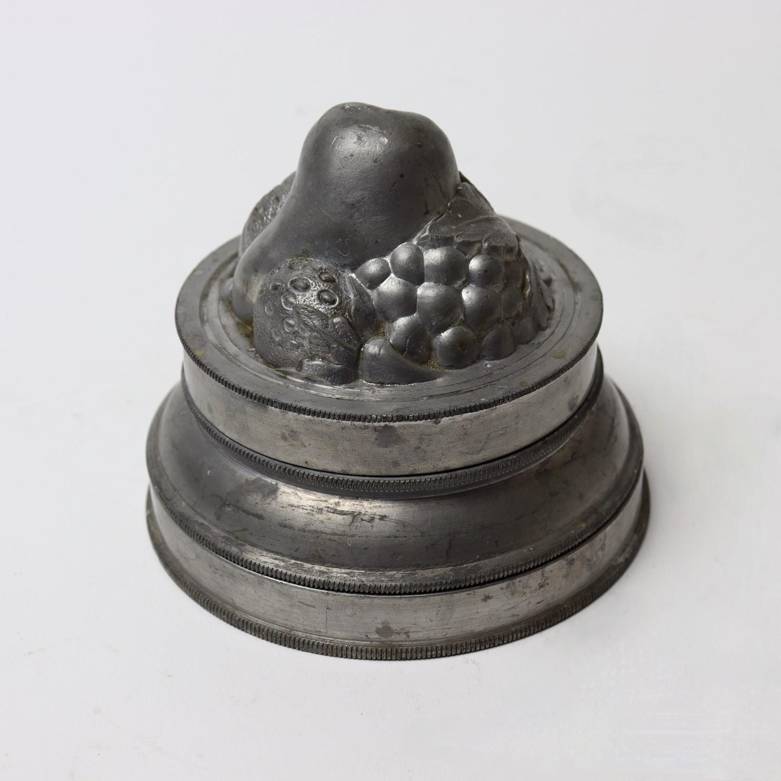 A three part, pewter ice cream mould with a group of fruits to the top. This is English and it dates from c.1880. The base is marked with the capacity “PINT” and ”No7” which is the pattern number. It is also marked with a registered design Kite Mark which would date the registration of the design to the 22nd of July 1868. The lid is beautifully moulded with a group of fruits including grapes, a pear, a plum, a strawberry and a tangerine, and this would turn out well. The mould is in excellent condition and the interior is in very good, bright, usable condition.