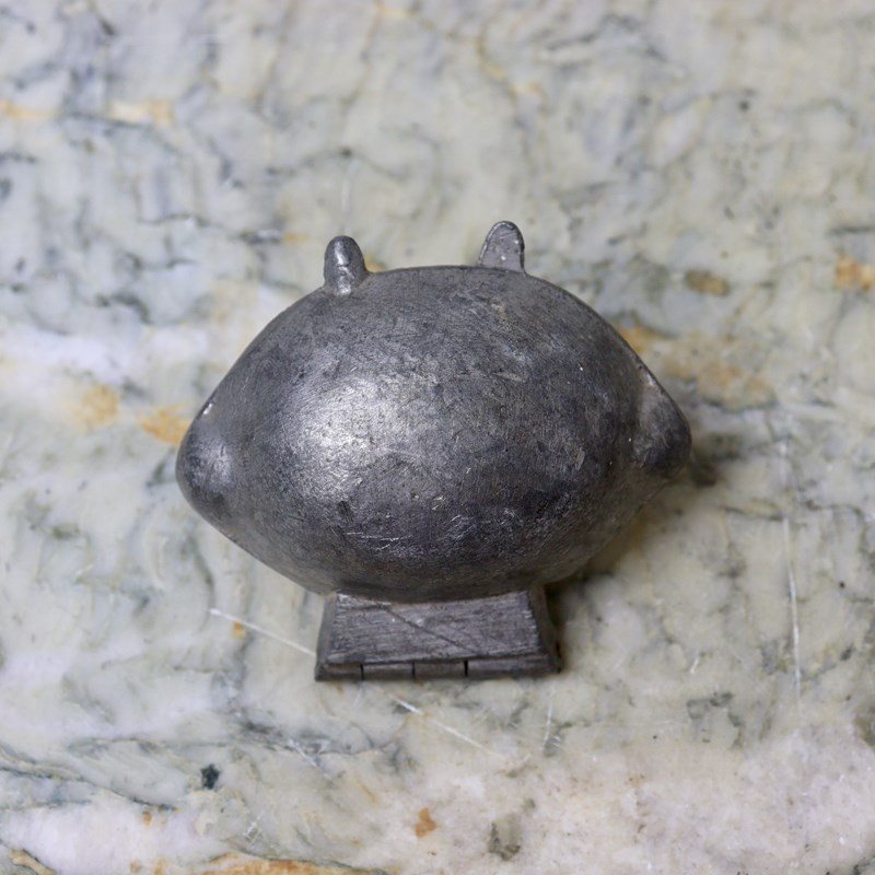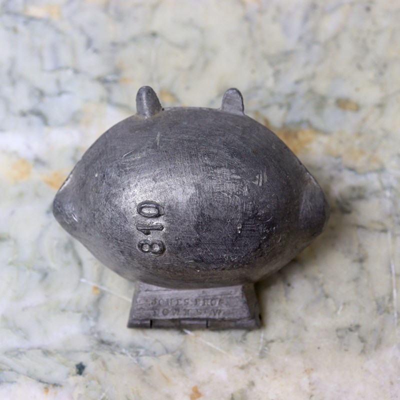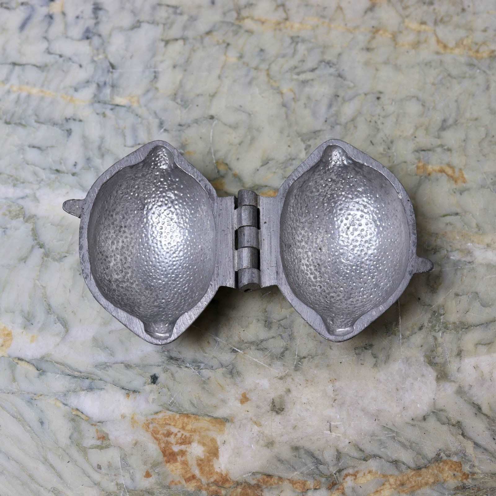A small, pewter ice cream mould in the shape of a lemon. This is marked ”JONES BROS. DOWN ST. W” on the hinge, and it dates from c.1880. It is also marked, in the casting, with the pattern number “810”. The design is very well detailed and the mould is in excellent condition. The exterior has a dark patina and the interior is in good, bright, usable condition.