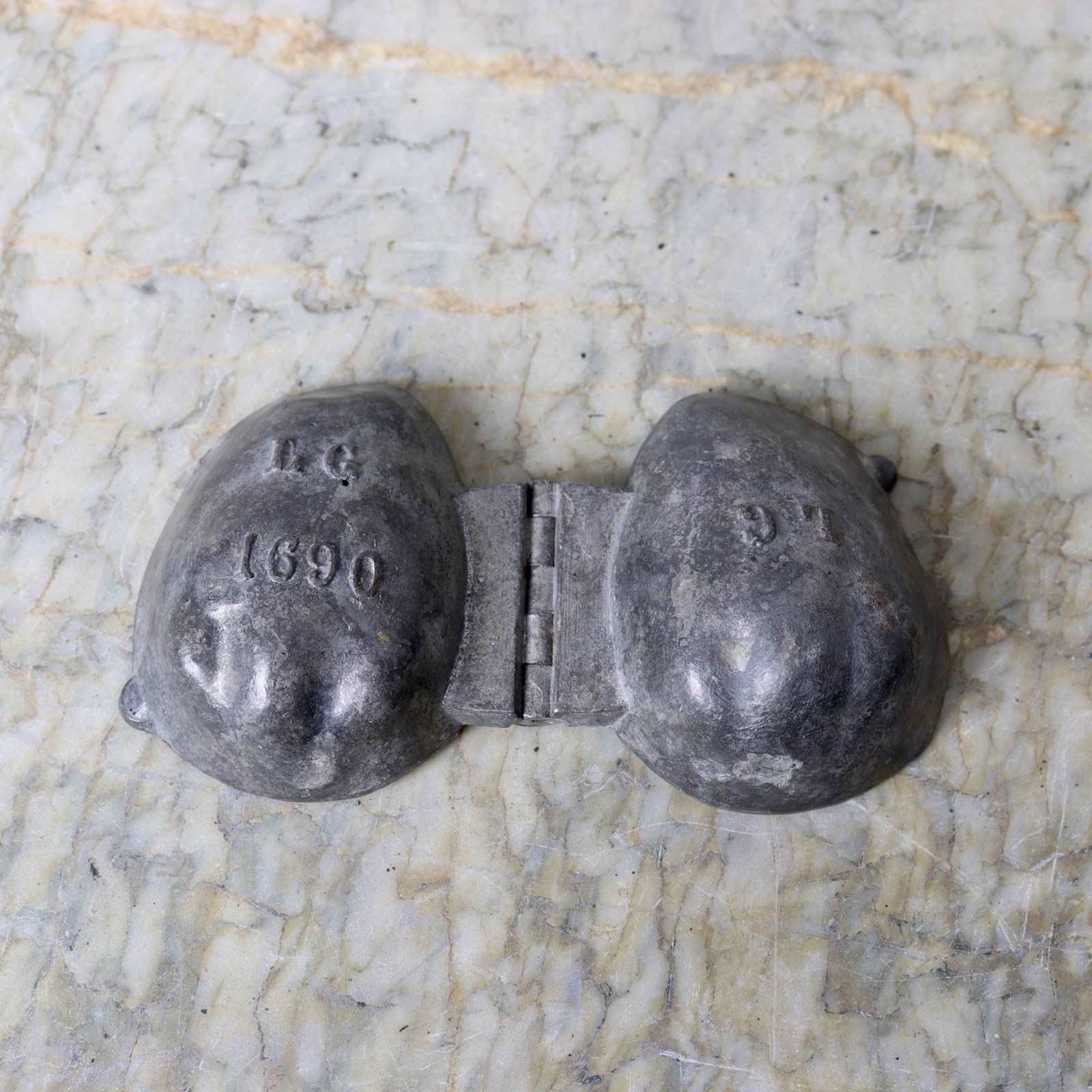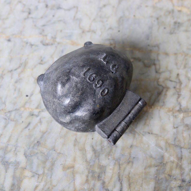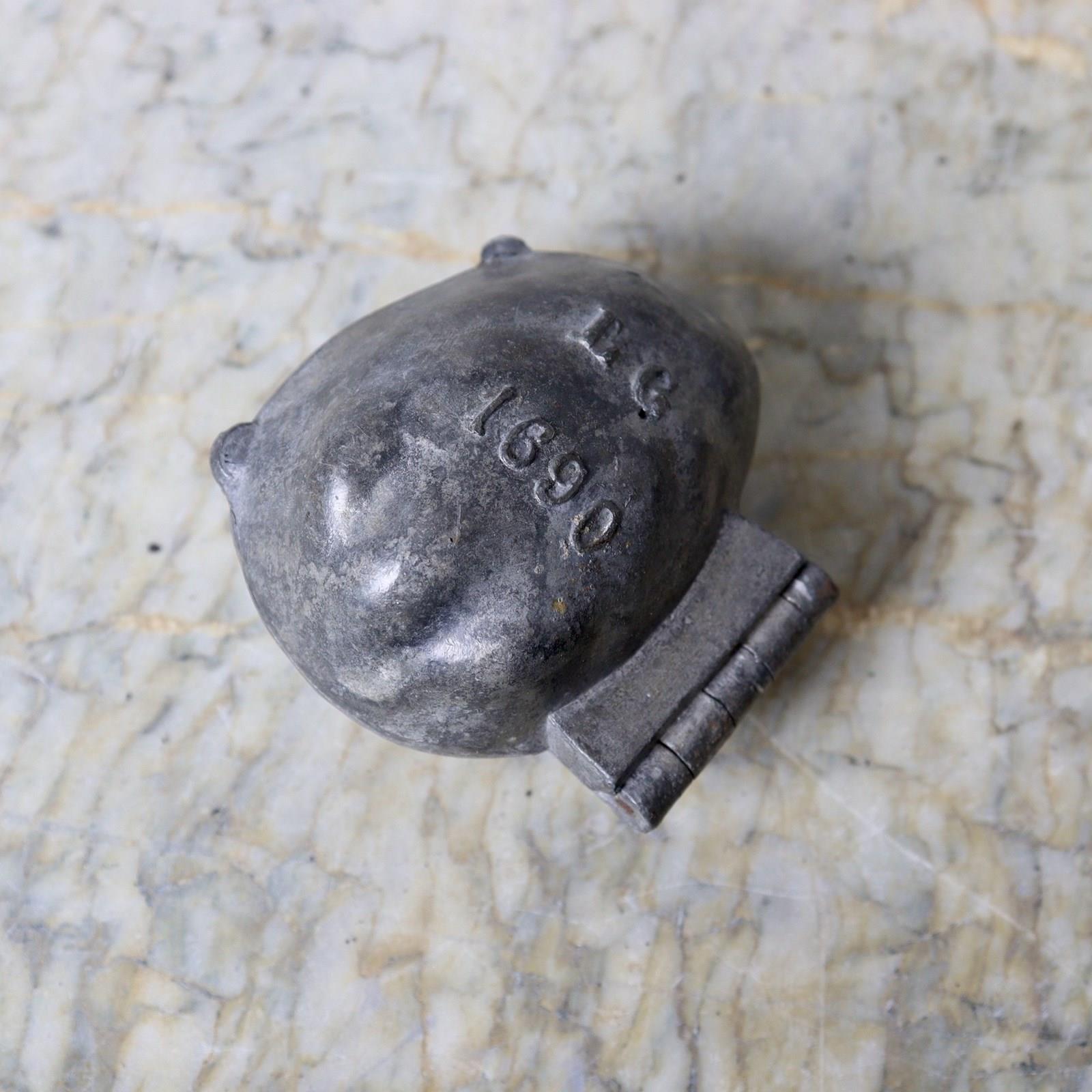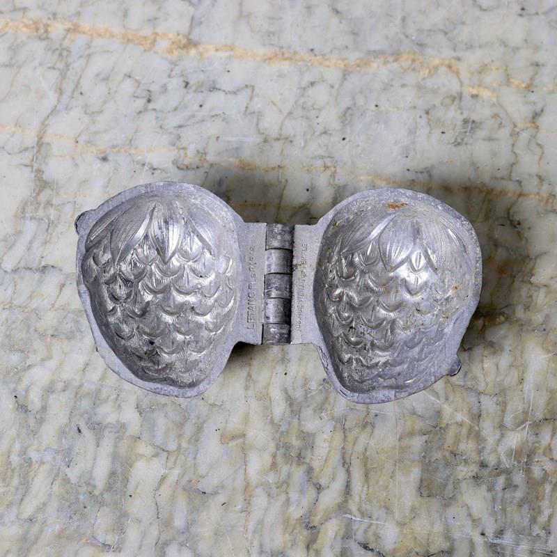 A small, 19th century, pewter ice cream mould in the shape of a strawberry. This is stamped “LETANG FILS PARIS 108 RUE VIELLE DU TEMPLE” and the exterior is marked “L.G 1690” in the casting. Letang were one of the leading French manufacturers of kitchenware in the 19th century and the mould dates from c.1880. The strawberry is well detailed and would turn out well. The mould is in excellent condition. The interior is in very good, bright, usable condition and the exterior has a dark patina.