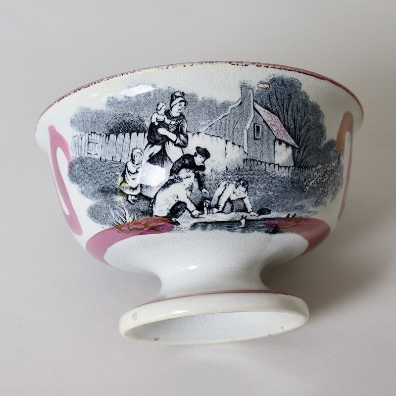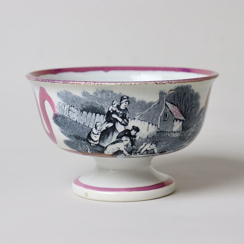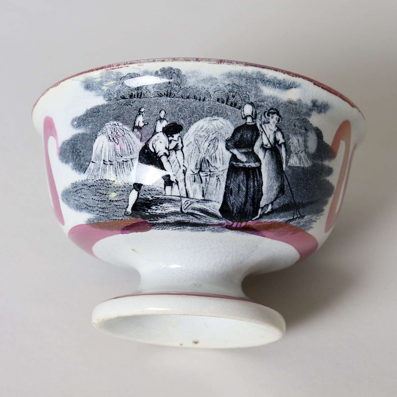 A small, 19th century, Sunderland lustre bowl. This is printed, in black, with rural scenes to either side. One shows children playing with boats, on a pond, in front of a cottage and the other show haymakers. The prints are joined by scrolling, pink lustre lines and there are bands of lustre to the rim and foot. It dates from c.1840 and is in excellent condition.