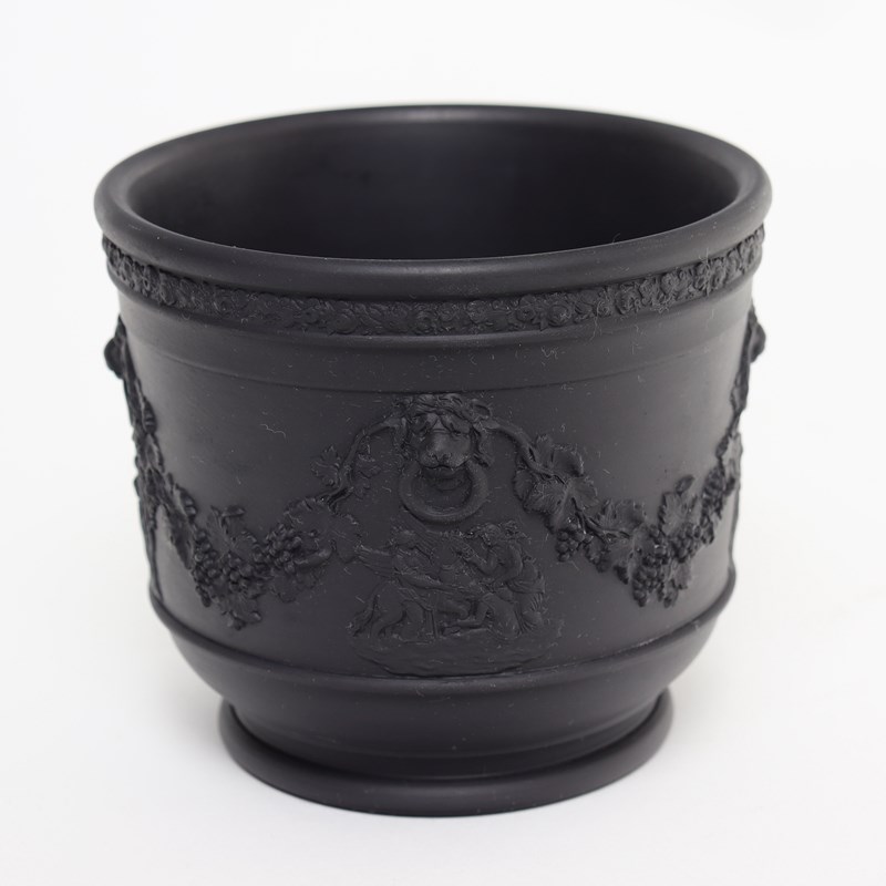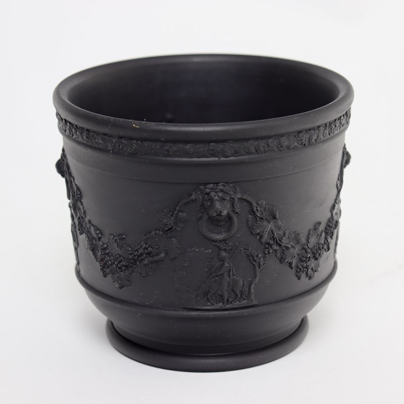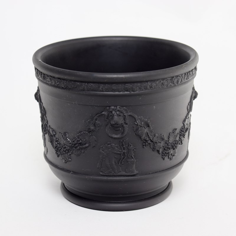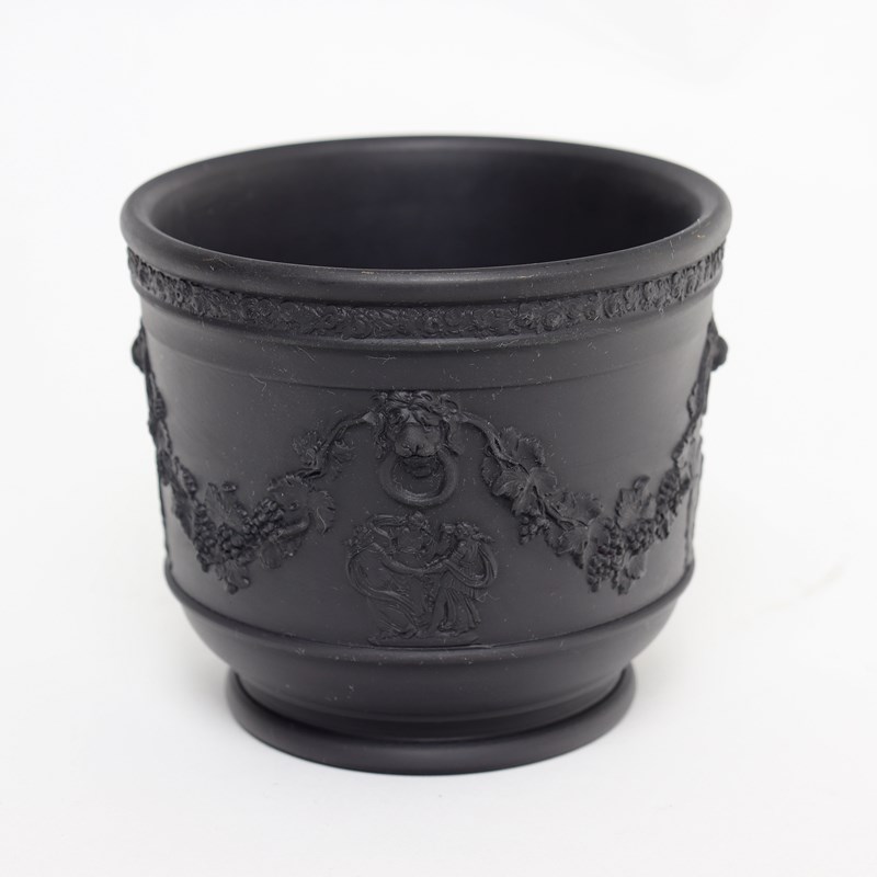 A small, Wedgwood black basalt jardiniere. This is marked “WEDGWOOD MADE IN ENGLAND” and it dates from c.1920. It is also impressed with a number “4” which relates to the diameter in inches. It is decorated, in relief, with four different classical subjects beneath garlands of grapes and vines which hang from lions head masks. The reliefs include The Three Graces and Pegasus. To the rim is a narrow border of flowers. The reliefs are all very good quality and the piece is in excellent condition.