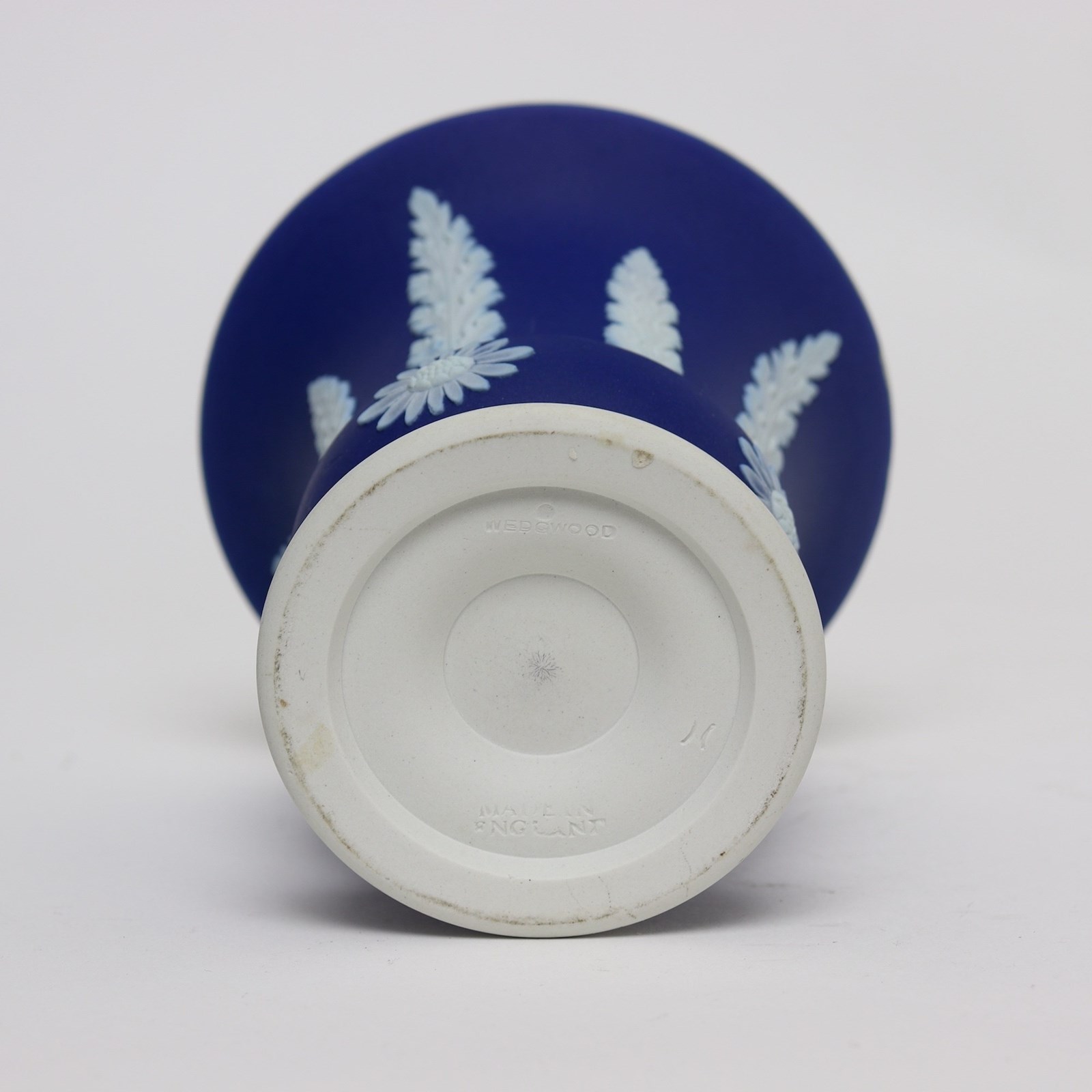 A small, Wedgwood, dark blue jasper dip vase. This is marked “WEDGWOOD MADE IN ENGLAND” and it dates from c.1920. It is decorated, in white relief, with acanthus leaves to the upper section above four stylised flowers. This is quite an unusual combination of shape and decoration. The reliefs are all good quality and the jasper dip is a good, rich shade of blue. The vase is in excellent condition.