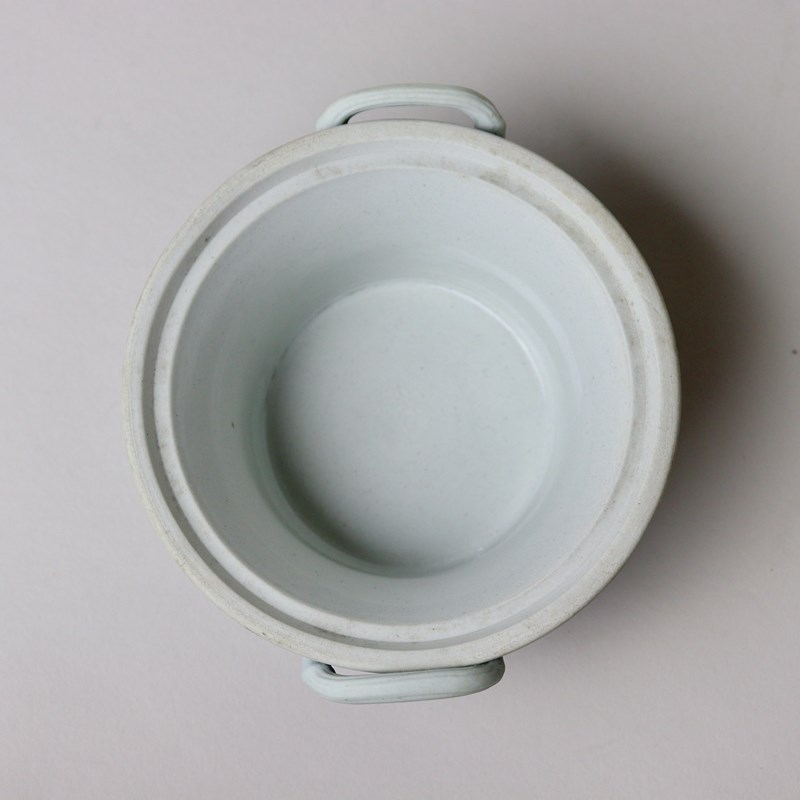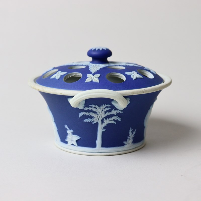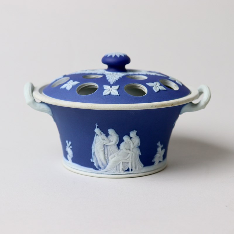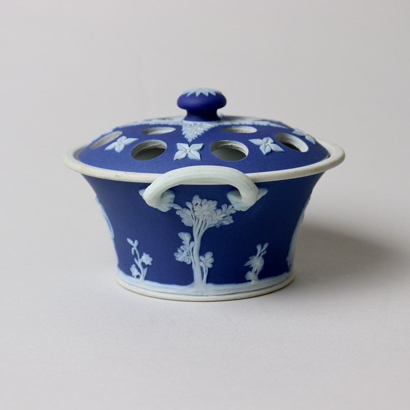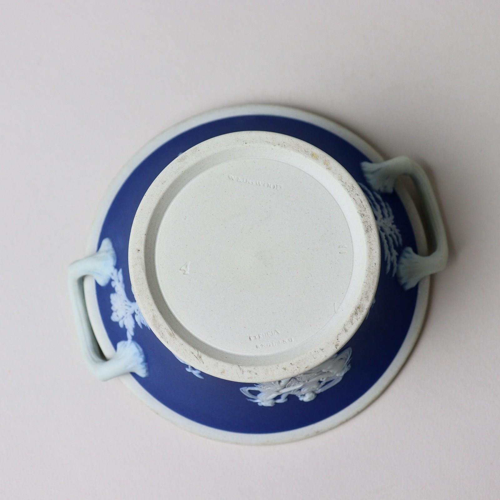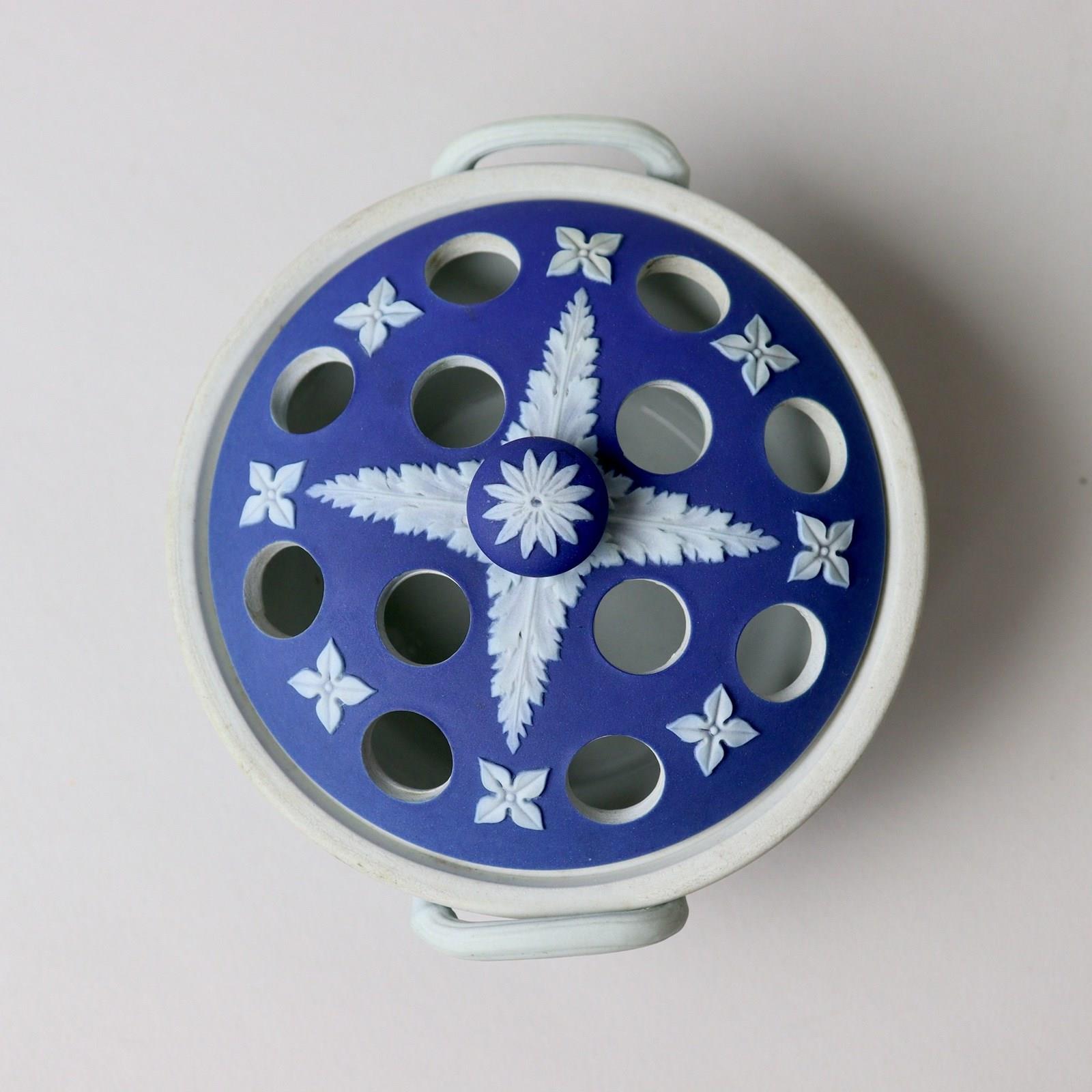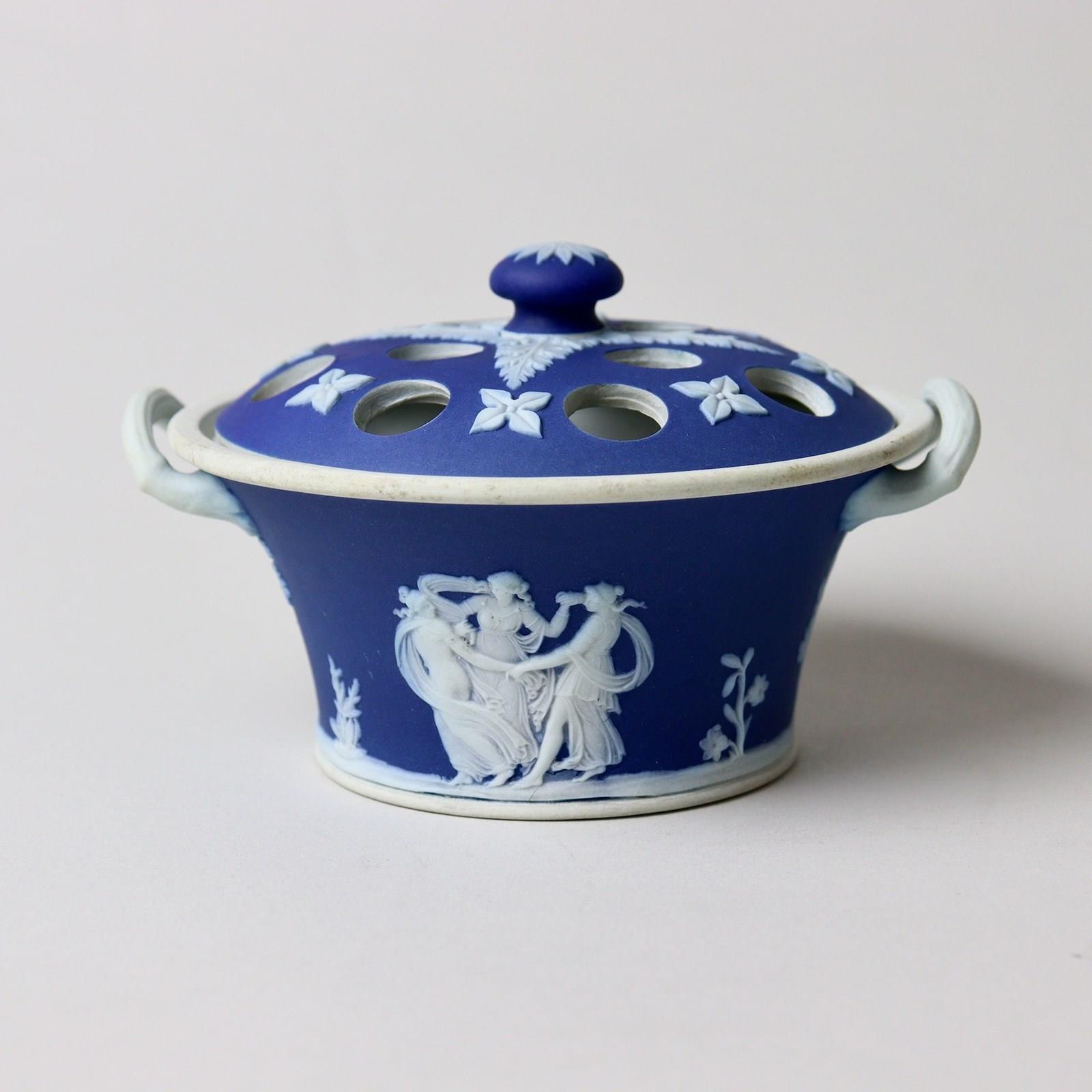 A small, late 19th century, Wedgwood, dark blue jasper dip violeteer. This is marked with”WEDGWOOD ETRURIA ENGLAND” and it dates from c.1895. It is also impressed with a number “4”, which relates to its diameter in inches, and there is a workman’s mark in the form of two dashes. It is well potted and it is decorated, in white relief, with two classical scenes, one being the Three Graces. The pierced lid is decorated with acanthus leaves and small, stylised flowers. The reliefs are all good quality and the jasper dip is a good, rich shade of blue. Both the bowl and lid are in excellent condition.