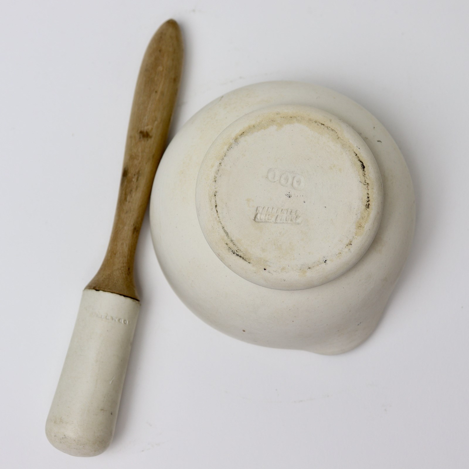 A small, 19th century, white stoneware pestle and mortar. This is made by Wedgwood although the mortar does not bear the factory mark. The pestle is marked “WEDGWOOD” and it is also impressed with a letter “T”. The mortar is impressed “GUARANTEED ACID PROOF” and it is also impressed with “000”. This was Wedgwood’s system for coding the sizes of mortars, with a triple 0 being very small. This is made from a non porous, white stoneware and it dates from c.1860. The pestle has a turned beechwood handle. Both the pestle and mortar are in excellent condition.