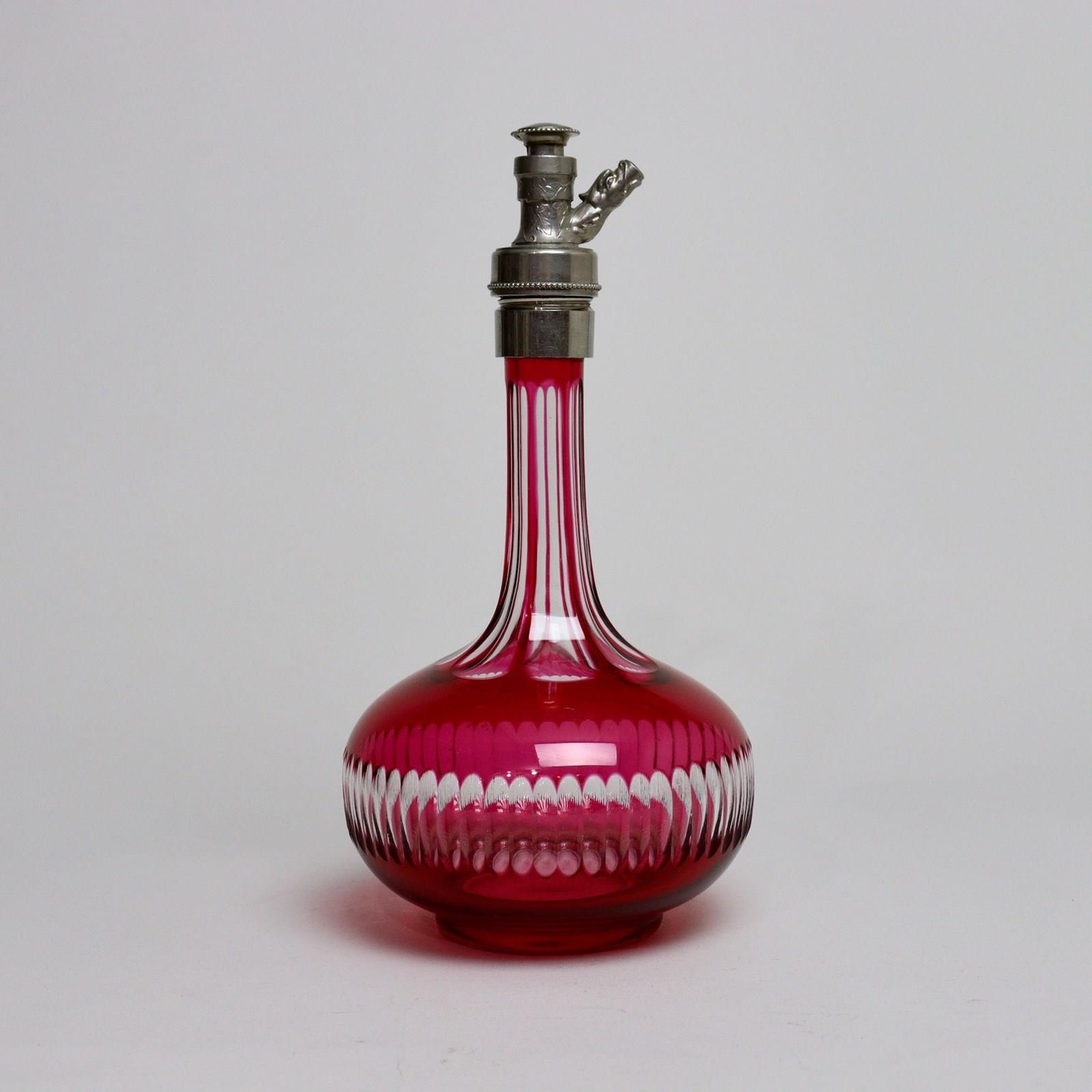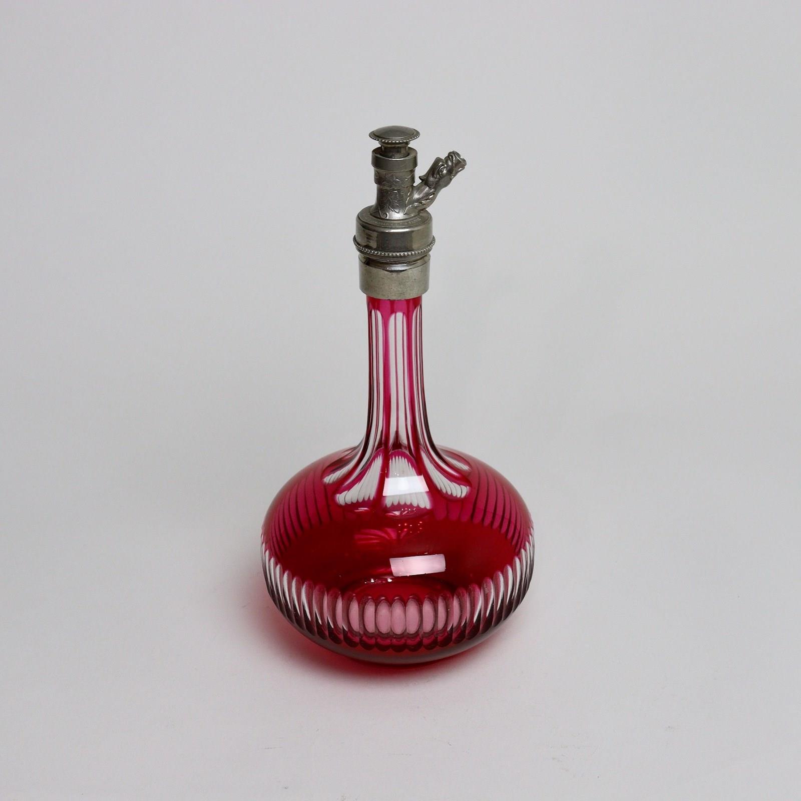 A super quality, red overlay, crystal perfume dispenser. This is made by St. Louis and it dates from c.1880. It is marked, around the top of the pewter top “NOUVEAU AINE BTE EN FRANCE ETALEIR ANGER S.G.D.G. PARIS”. It would have been sold by the perfumier in Anger and S.G.D.G. is the French equivalent of our registered design mark. It is a very unusual piece and it is in excellent condition.
