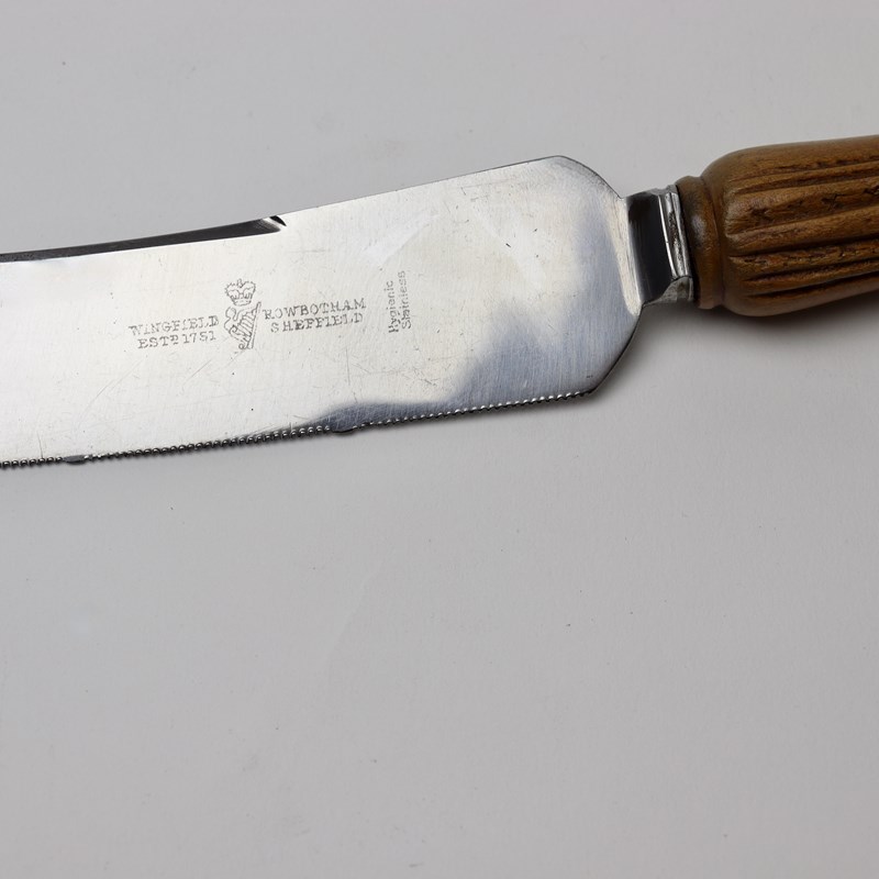 An early 20th century, stainless steel bread knife with a carved sycamore handle. The blade is marked “WINGFIELD ROWBOTHAM ESTD 1752. SHEFFIELD” to either side of a harp beneath a crown. It is also marked “Hygienic Stainless”. Stainless steel was developed in 1913, and soon in wide use in cutlery, and this knife dates from c.1920. The handle is very well carved with wheat against a stipple background. The piece is in excellent condition.