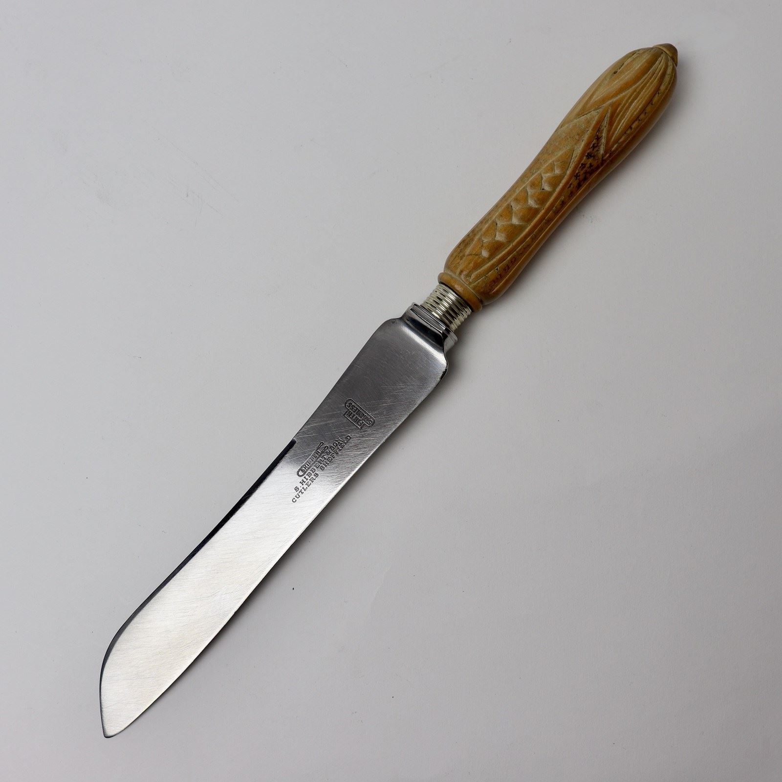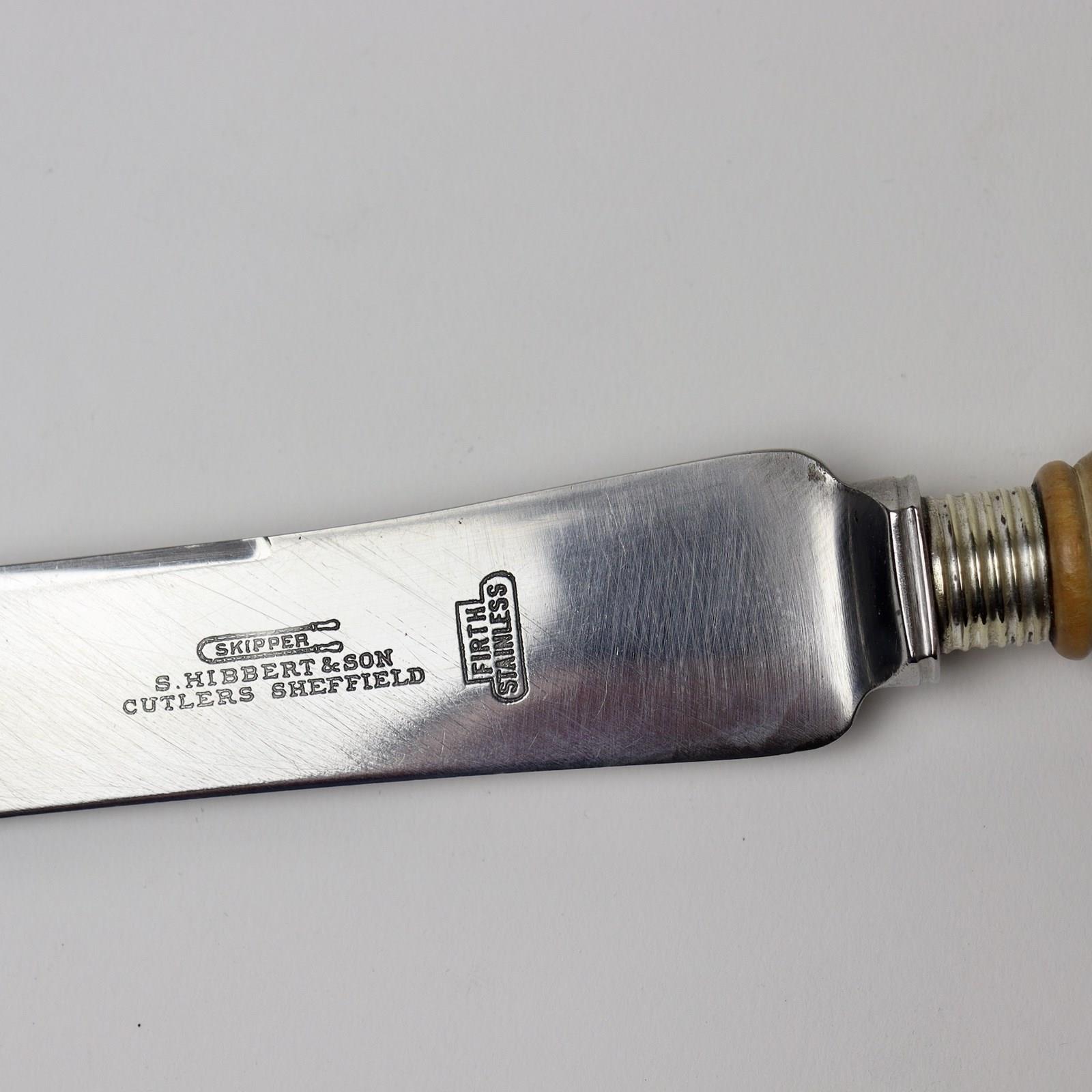 An early 20th century, stainless steel bread knife with a carved sycamore handle. The blade is marked “SKIPPER”, within a skipping rope shape, and “S HIBBERT & SON CUTLERS SHEFFIELD”. It is also marked “FIRTH STAINLESS”. S Hibbert and Son were established in 1892 and stainless steel was developed in 1913 and soon in wide use in cutlery. This knife dates from c.1920. The handle is very well carved with wheat and leaves against a stipple background. The piece is in excellent condition.