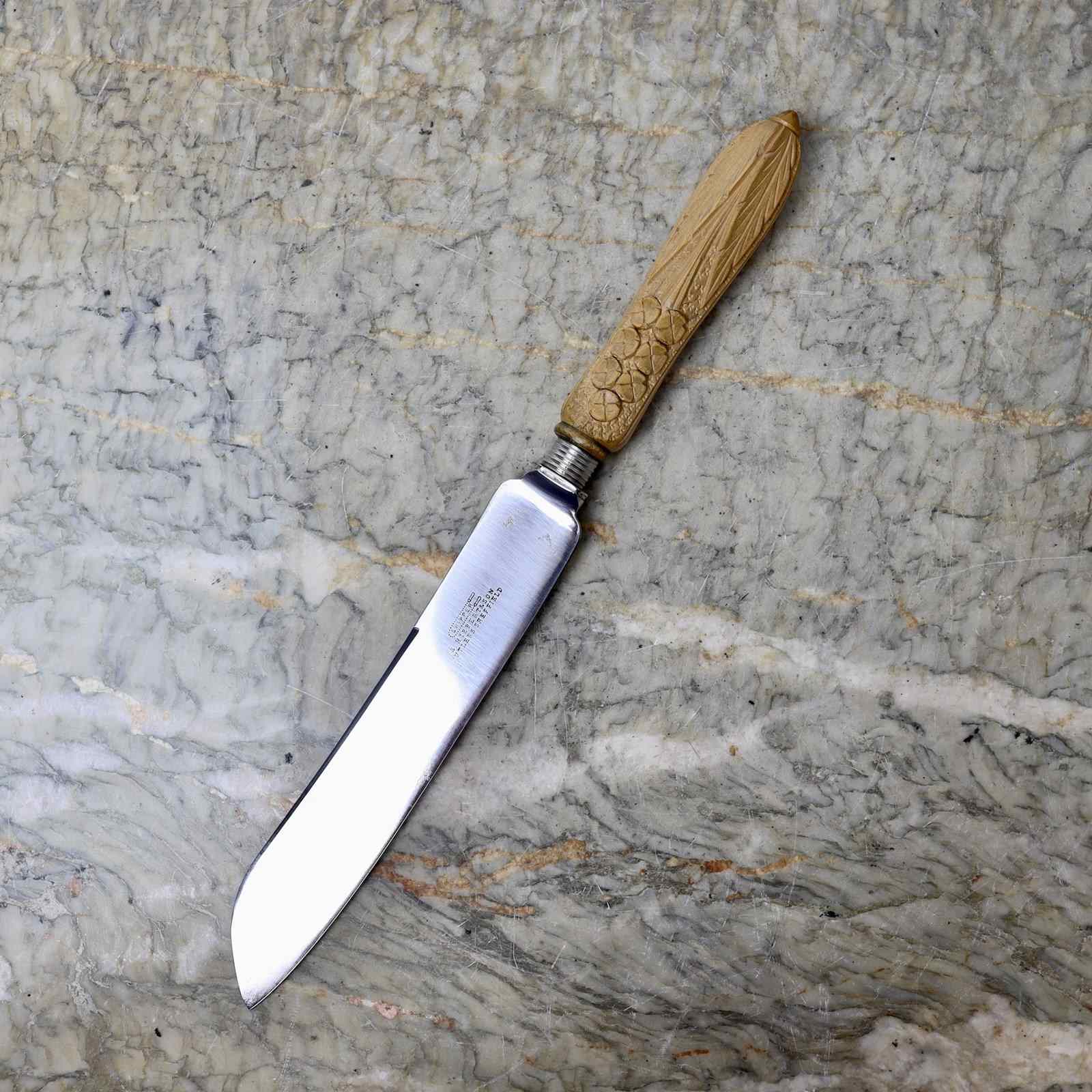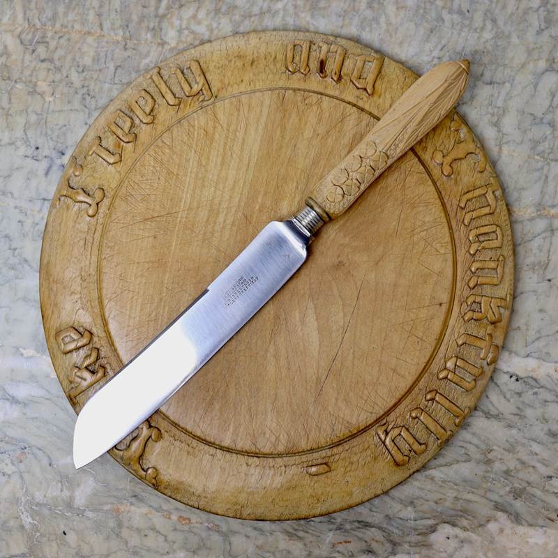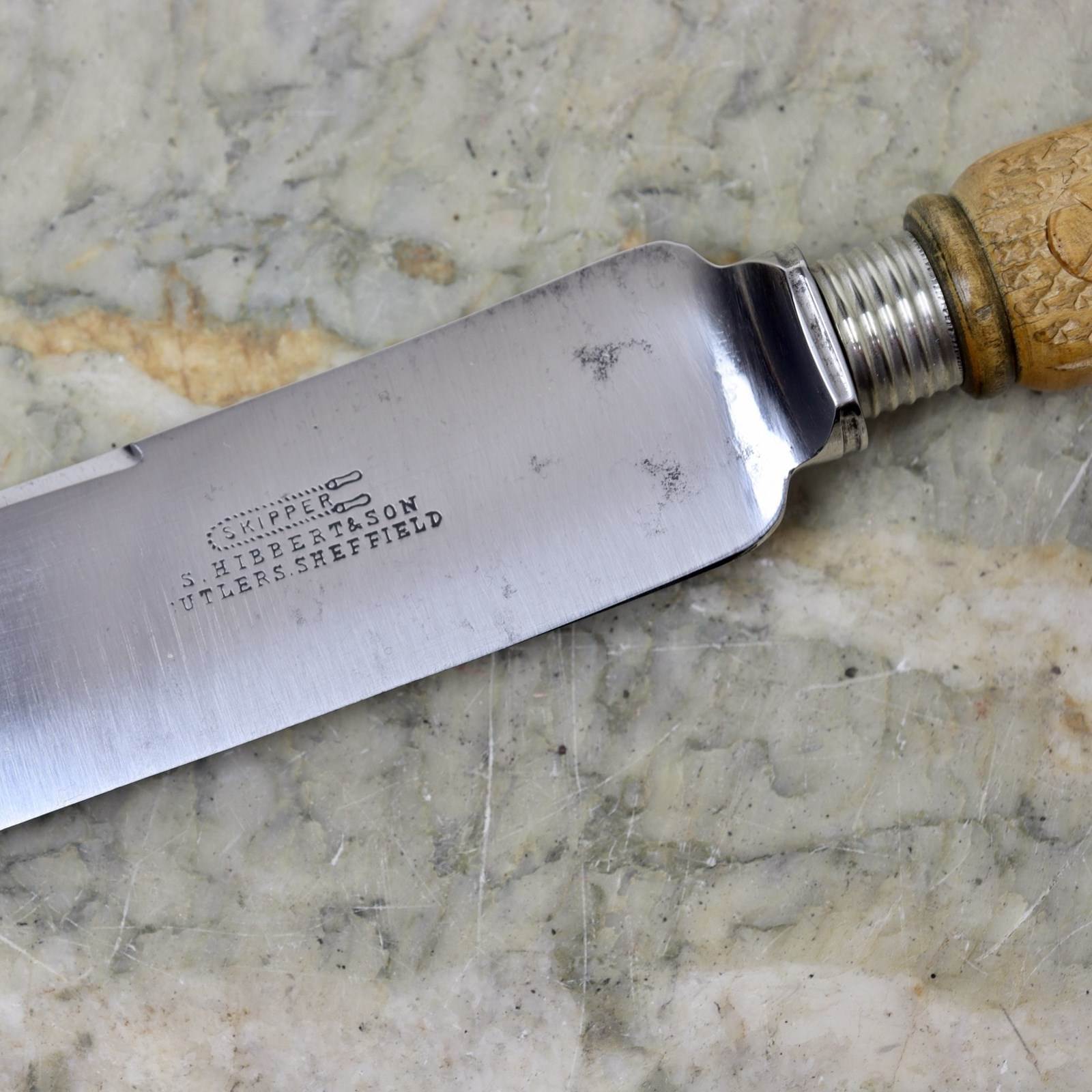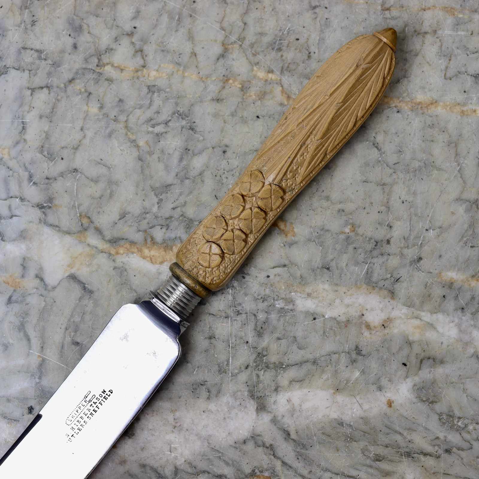 A late 19th century steel bread knife with a carved wooden handle. The blade is stamped “SKIPPER. S.HIBBERT & SON CUTLERS SHEFFIELD”. This mark was in use from 1892, when the company was established, until 1898 when S.Hibbert died. The sycamore handle is well carved with flowers and foliage against a stipple background. The piece is in excellent condition.