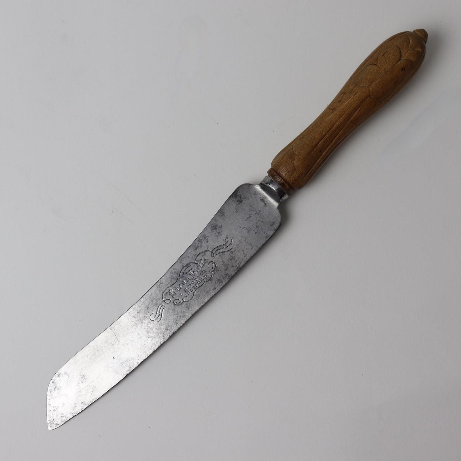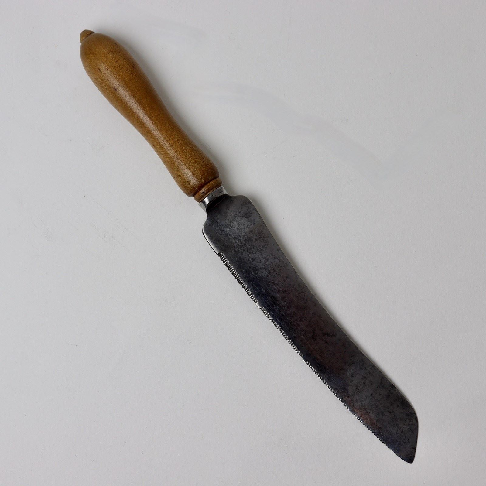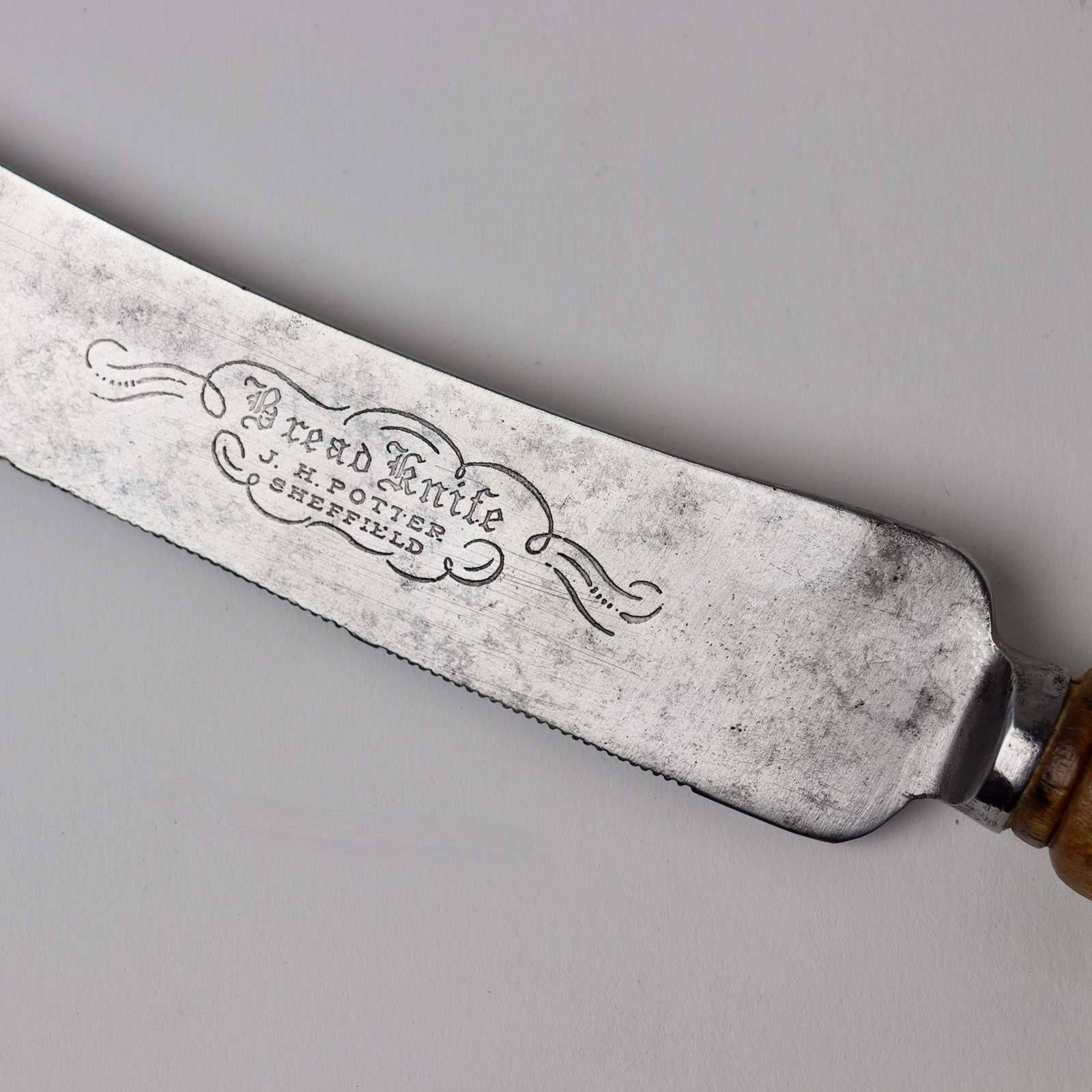 A late 19th century, steel bread knife with a carved wooden handle. The steel blade is stamped “J.H. POTTER. SHEFFIELD” and the knife dates from c.1890. It is also engraved “Bread Knife”, in an ornate script, and this is all within a shaped cartouche. The beechwood handle is carved with a flower and wheat but the knife has had plenty of use and the carving is now quite worn. The knife is in good, usable condition.