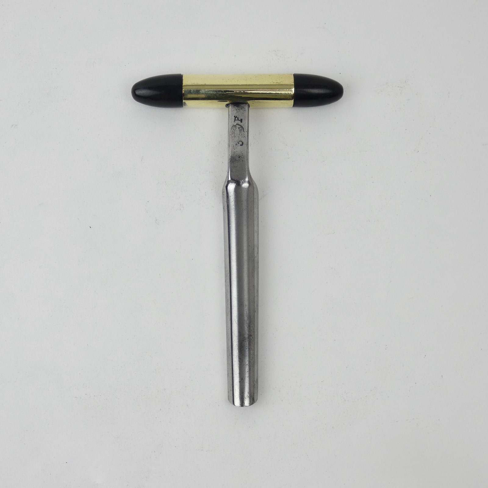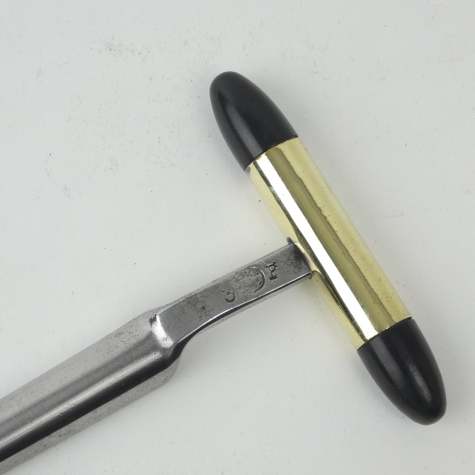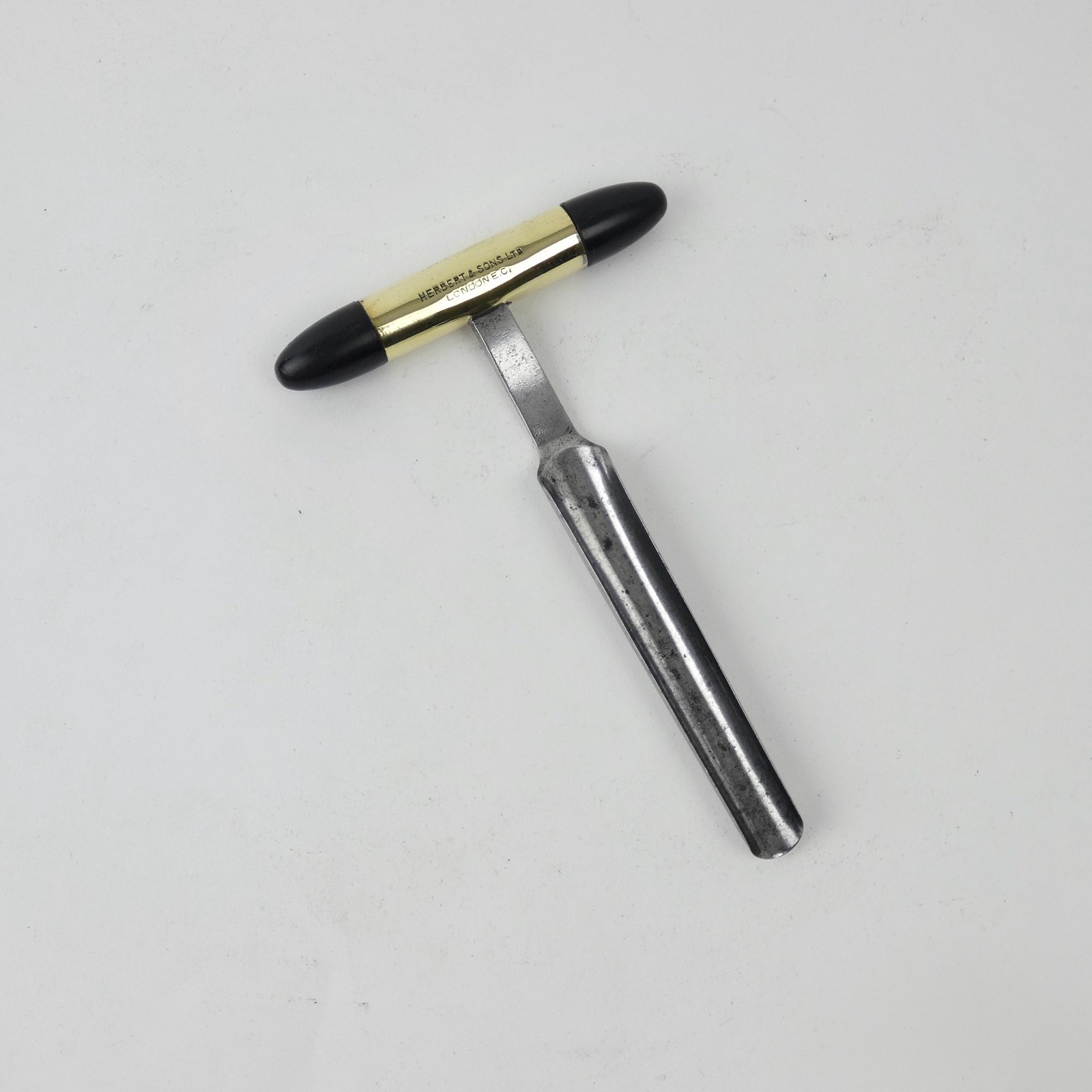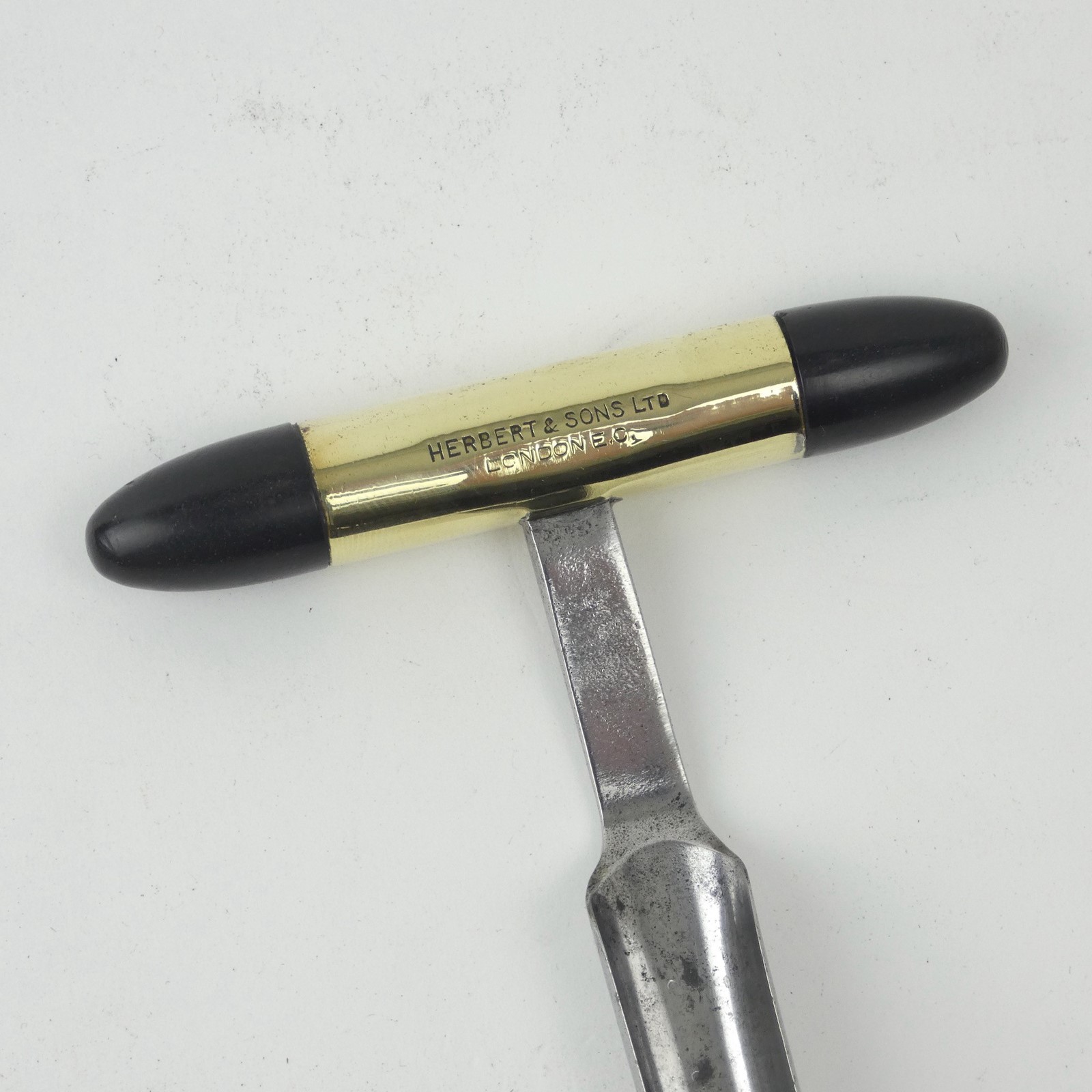 An interesting steel cheese taster with a brass and bakelite handle. The brass section of the handle is stamped “HERBERT & SONS LTD LONDON E.C.” This company was originally established in the 18th century and they were renowned for making penknives and scales but they also made many other top quality, utility items. This piece would have been used for taking a sample from a whole cheese to test whether it was well enough matured. It dates from c.1920 and is in excellent condition. Dimensions: Length 15.8cm. Width 10.2cm. Diameter of handle 1.8cm. Price includes postage within the U.K. Shipping to the U.S.A. add £15. Most of Western Europe add £8.