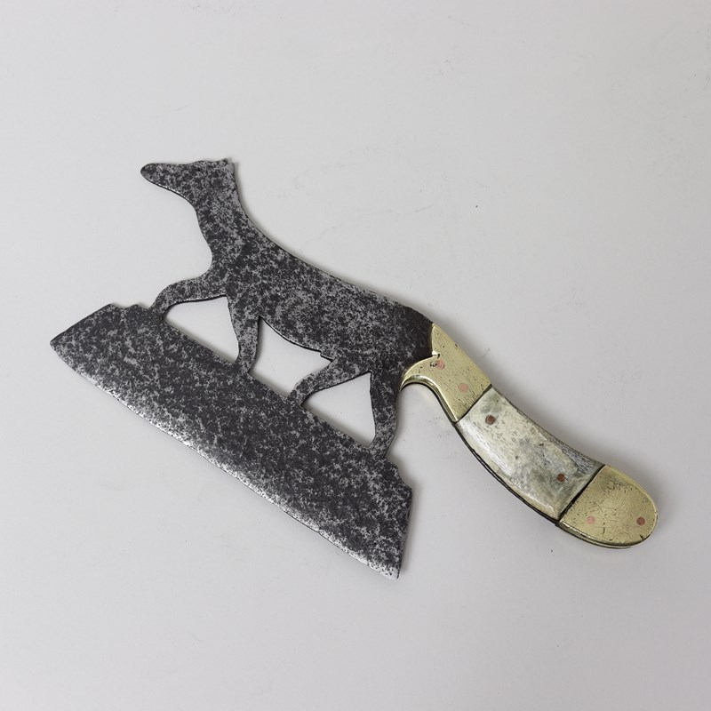 A 19th century steel ice or sugar cleaver in the shape of a fox. This is French and it dates from c.1880. The shape of the fox is quite naive in style and the handle is a combination of brass and horn. The steel blade is very heavily pitted, with use, and the horn section of the handle is also showing a lot of wear.