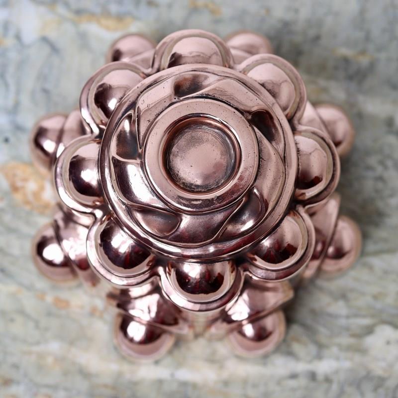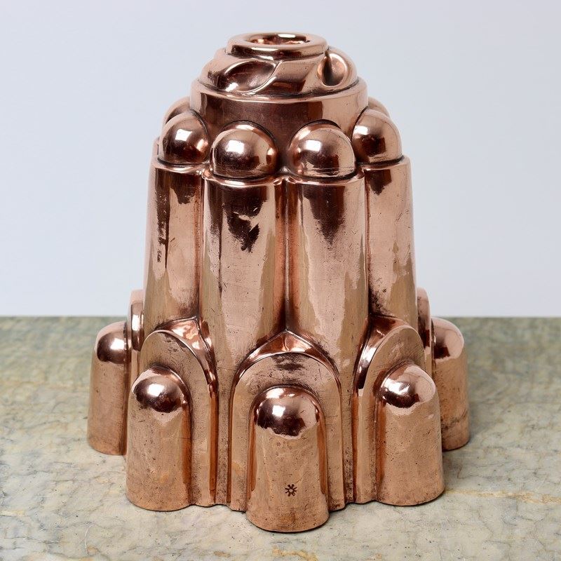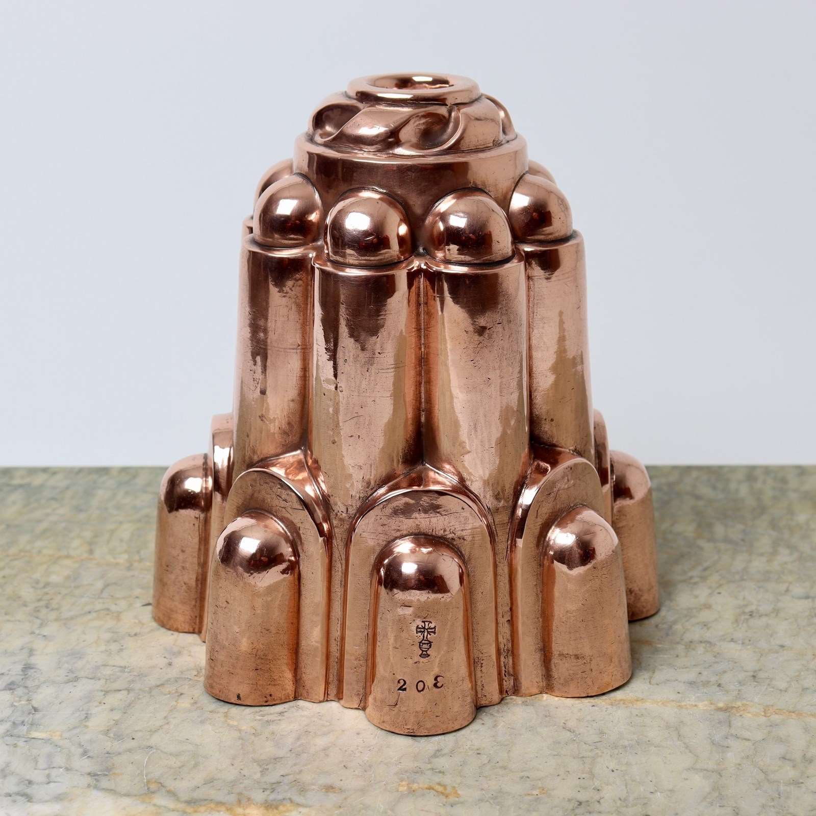 A very good quality, large, 19th century, English copper mould. This is marked with the orb and cross symbol used by Benhams above the pattern number “208”. It is made from a heavy gauge of copper and it dates from c.1870. The design is very elaborate for a large mould. It consists of a rope twist top above eight columns which have rounded tops. At the base the columns are divided by further columns and the overall effect is very pleasing. The mould is in very good condition but the tinning, to the interior, is worn.