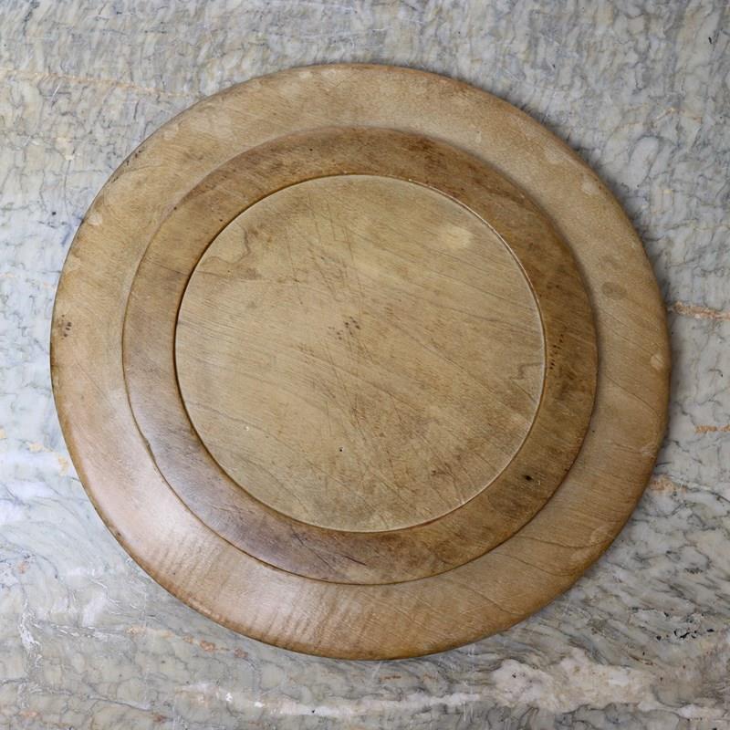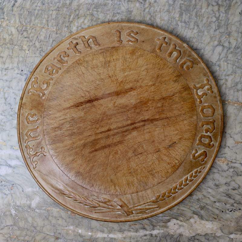An unusual, 19th century, sycamore breadboard carved with a religious motto. This is well carved, in an ornate Gothic script, with “The Earth is the Lords” and it dates from c.1880. This is a motto that we haven’t seen on a breadboard before. The remainder of the border is well carved with wheat, barley and a ribbon. There are a couple of short cracks to the rim of the board and there are the usual knife marks to the face of the board from use. The wood has quite a rich patina.