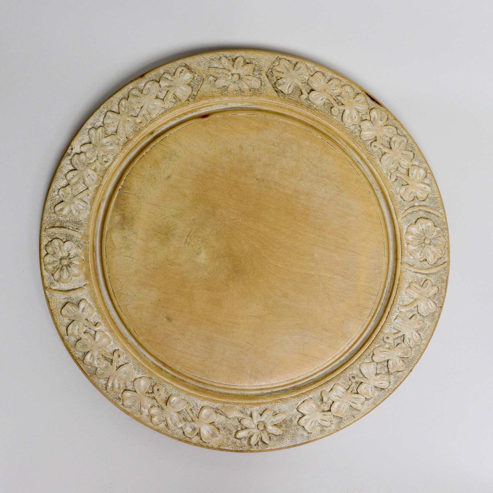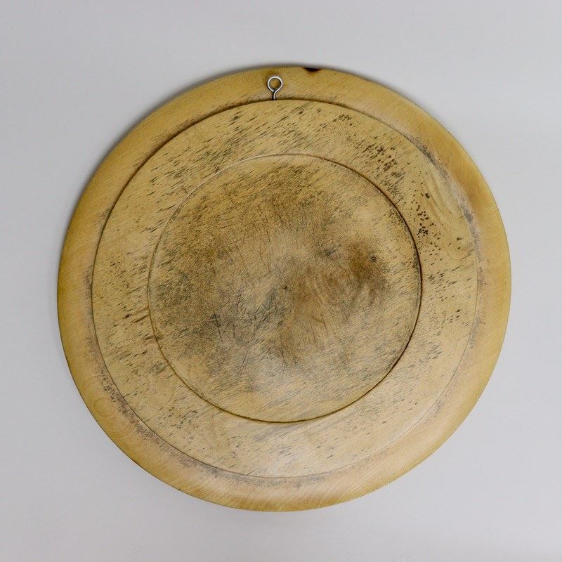 A late 19th century, sycamore breadboard. This is English and it dates from c.1890. The border is carved with shamrocks and four small flowers against a stipple background. There is some dark staining to the reverse of the board but this is not visible on the face. There is a very small burn mark on the rim and there are the usual knife marks to both sides of the board, from use. A hook has been put into the reverse so that it can hang but this does not affect its ability to lay flat on a table.