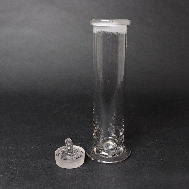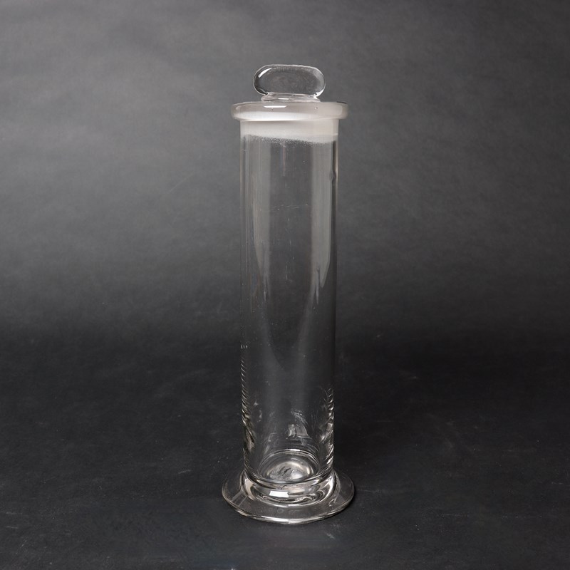 A tall, and narrow, 19th century, French glass storage jar. This was probably, originally made for use in an apothecary and it dates from c.1860. The glass has a slightly blue colour and a slightly irregular ripple. It is in excellent condition.