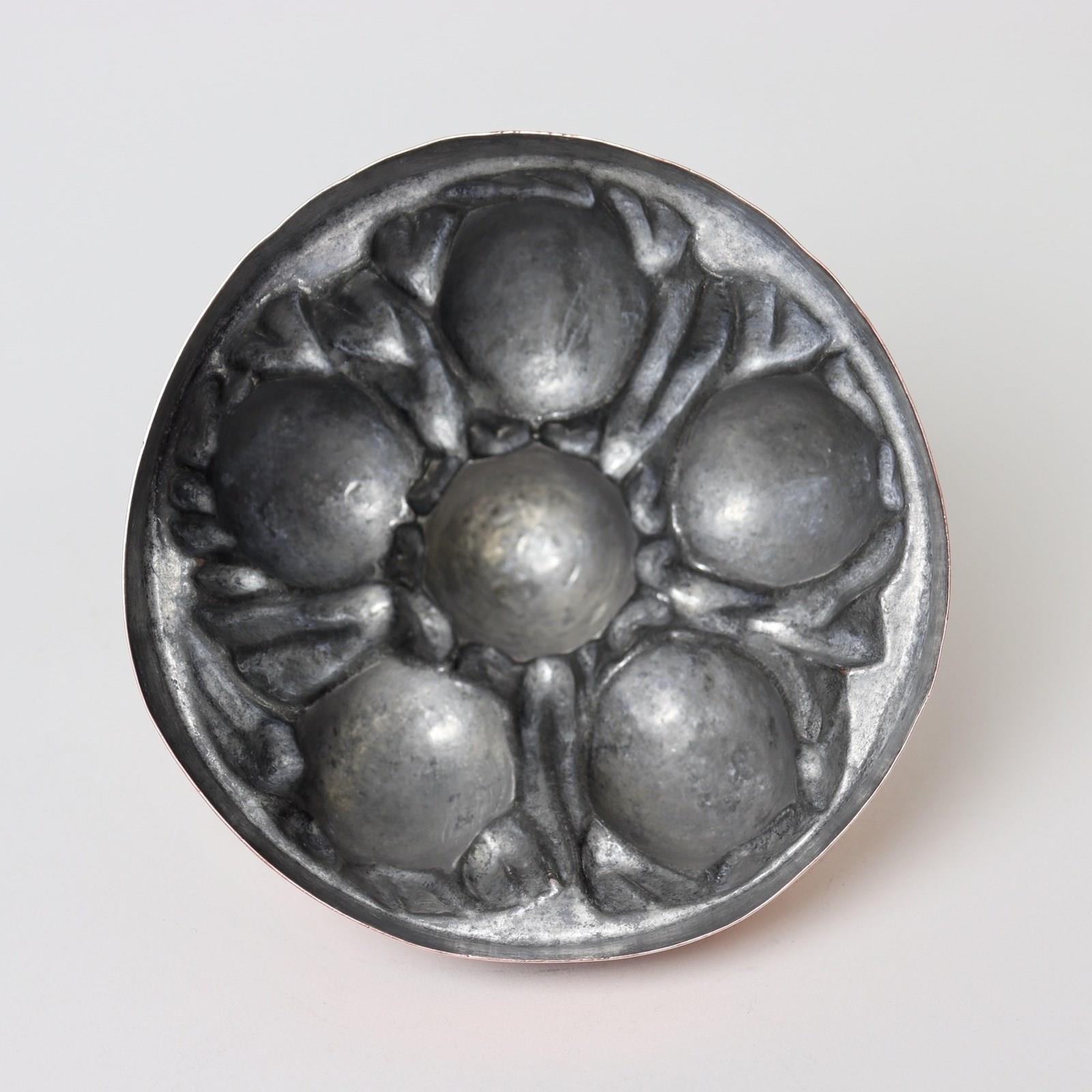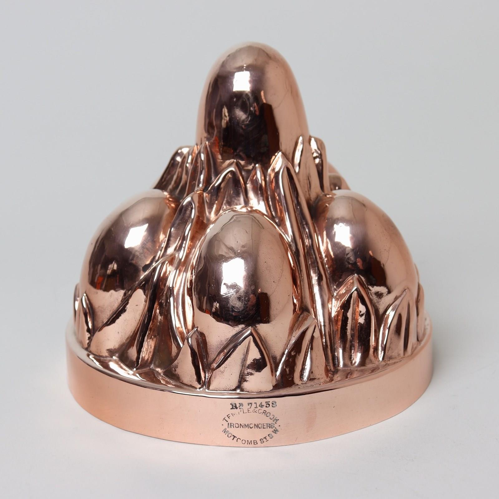 A super quality, late 19th century copper mould in the shape of eggs in a nest. This is stamped “TEMPLE & CROOK IRONMONGERS MOTCOMB ST.S.W.” and it dates from c.1890. It is also stamped with the registered design number “RD71438”. The design is very well detailed and the mould is well made, from quite a heavy gauge of copper. It is in excellent condition and the tinning, to the interior, is still in very good, usable condition.