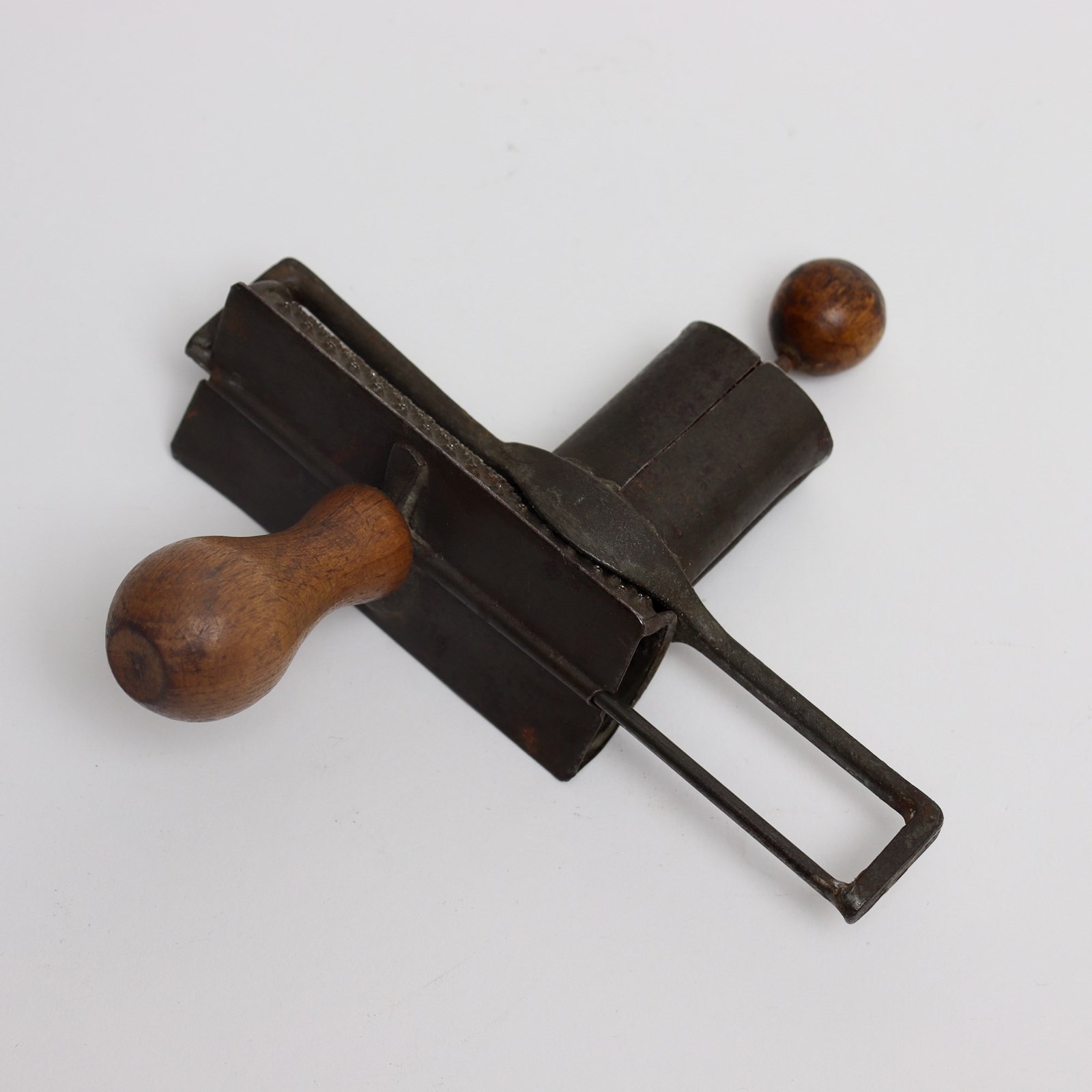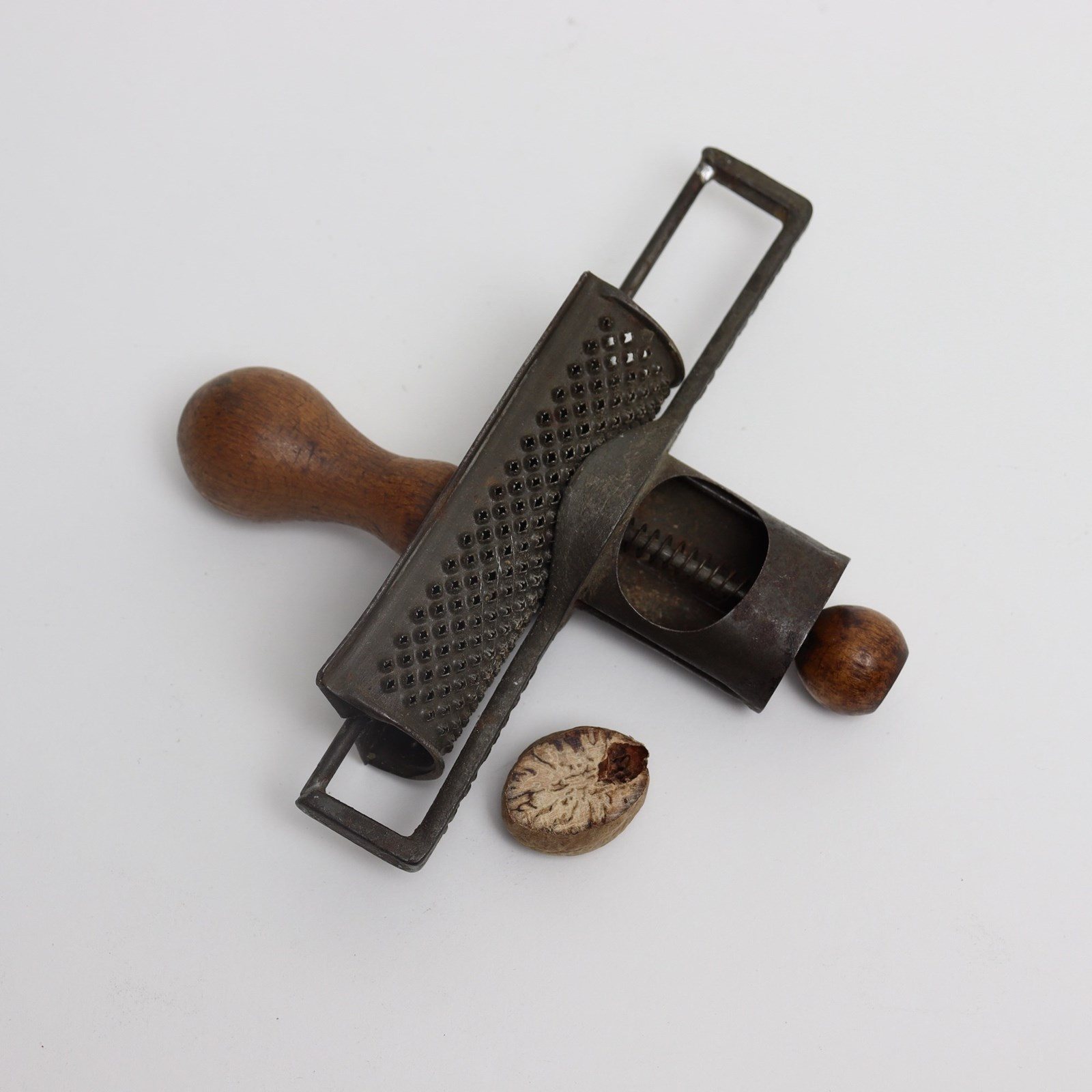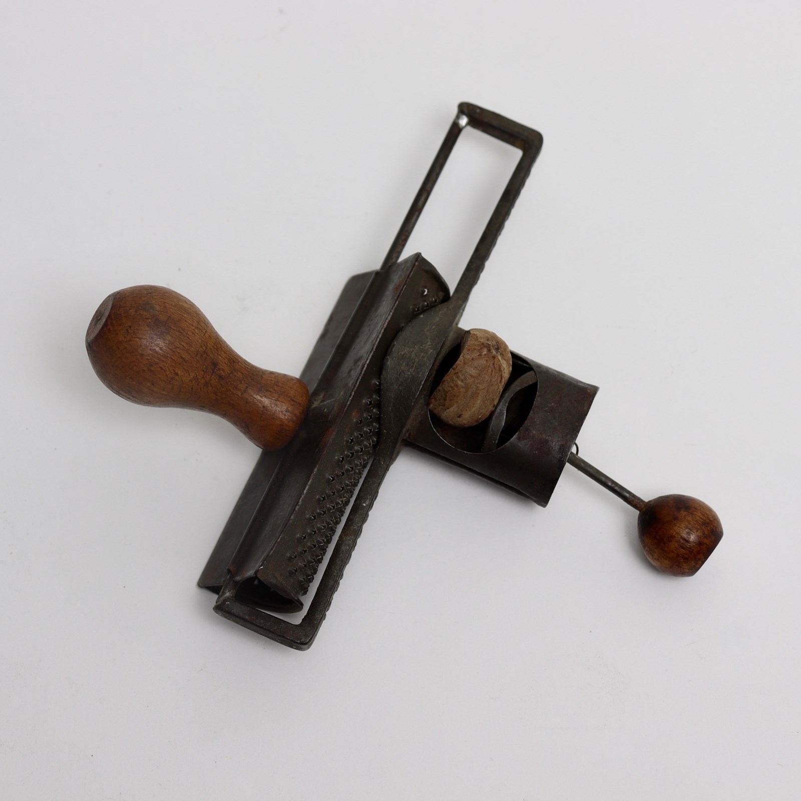 A late 19th century, tin plate nutmeg grater. This is English, the handles are turned from oak, and the piece dates from c.1890. There is currently a nutmeg in it and it is fully functional. It is in very good condition.