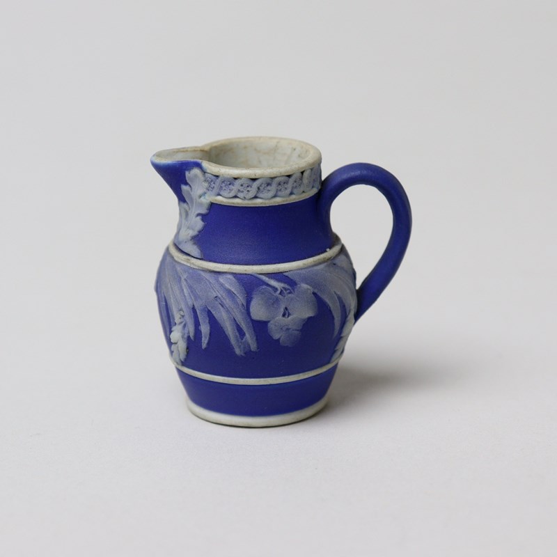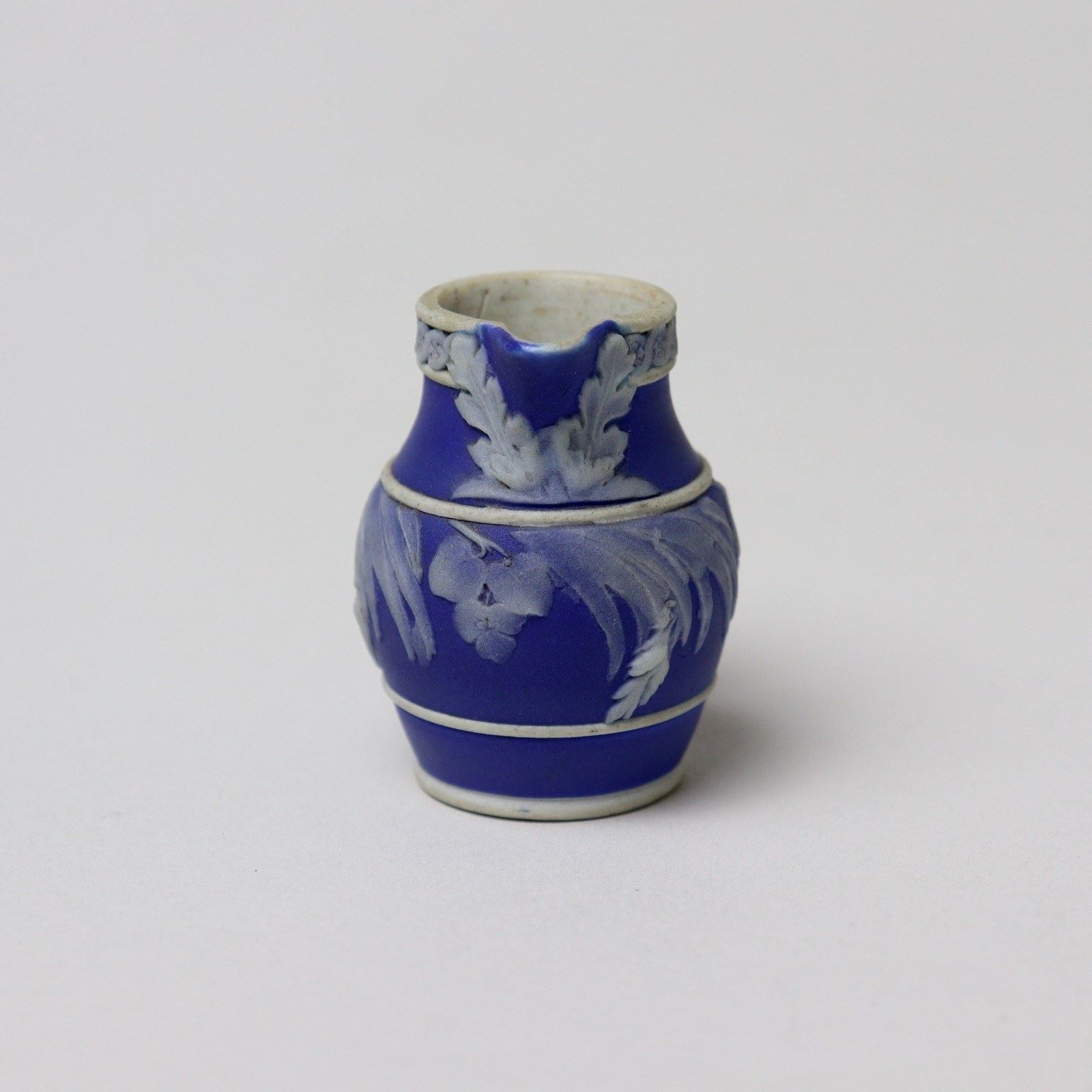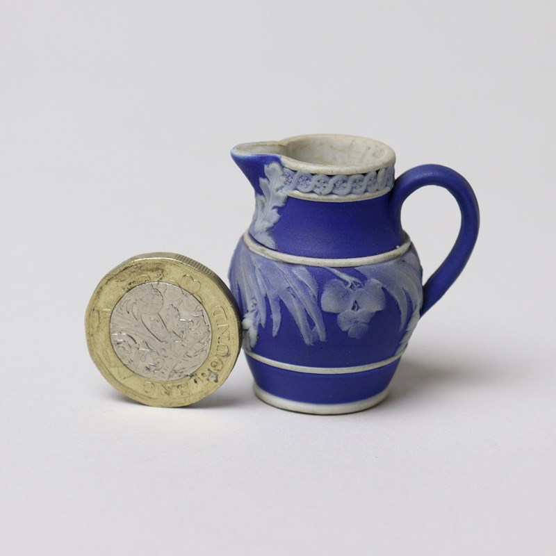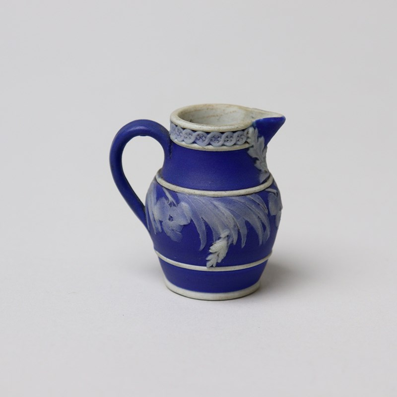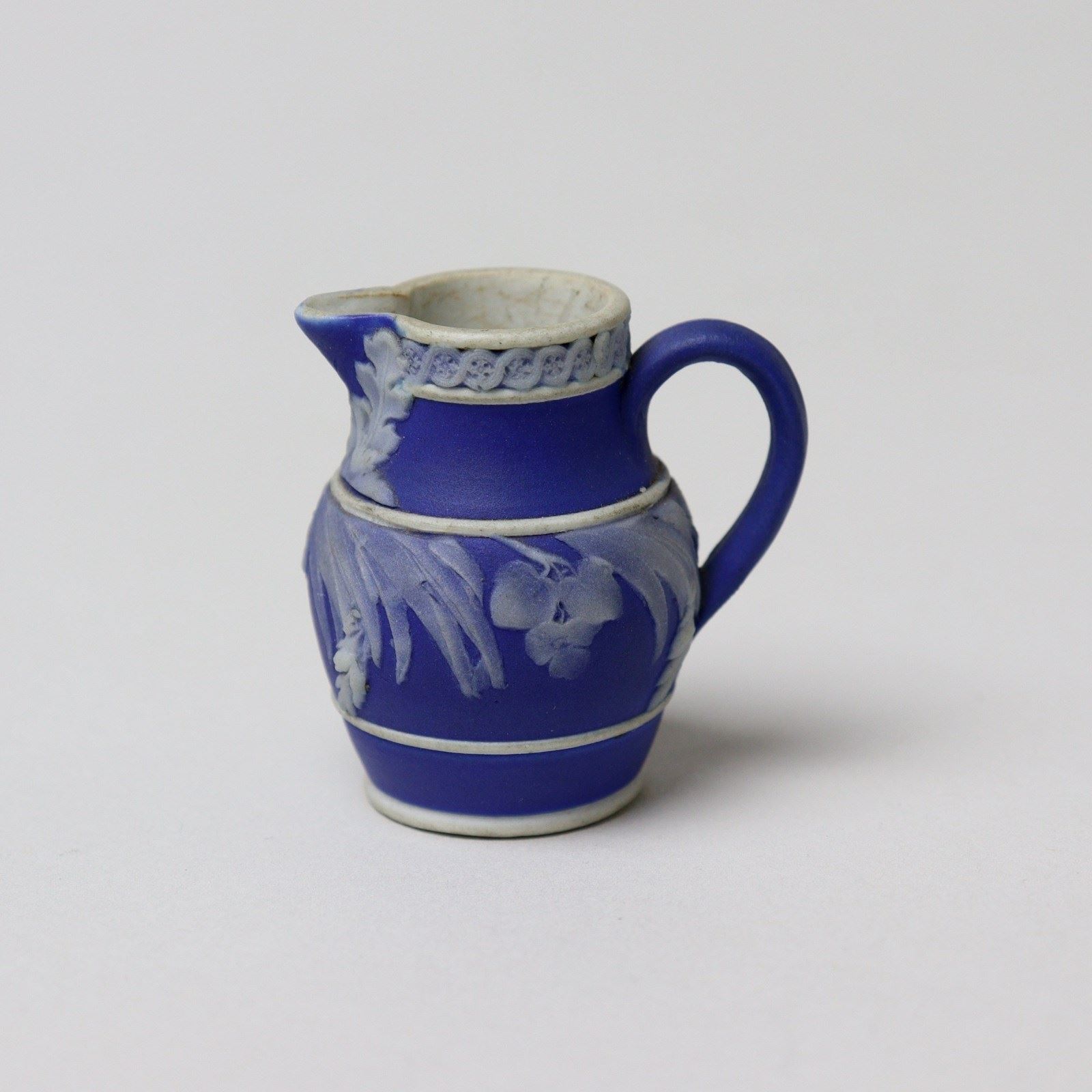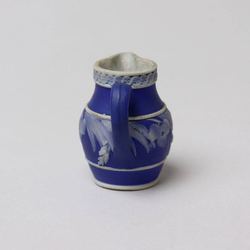 A tiny, Wedgwood, dark blue jasper, miniature jug. This is marked with the”WEDGWOOD”, although the mark is very poorly impressed, and it dates from c.1850. It is nicely decorated, in white relief, with a band of leaves, and to the rim is a narrow geometric border. It is in excellent condition.