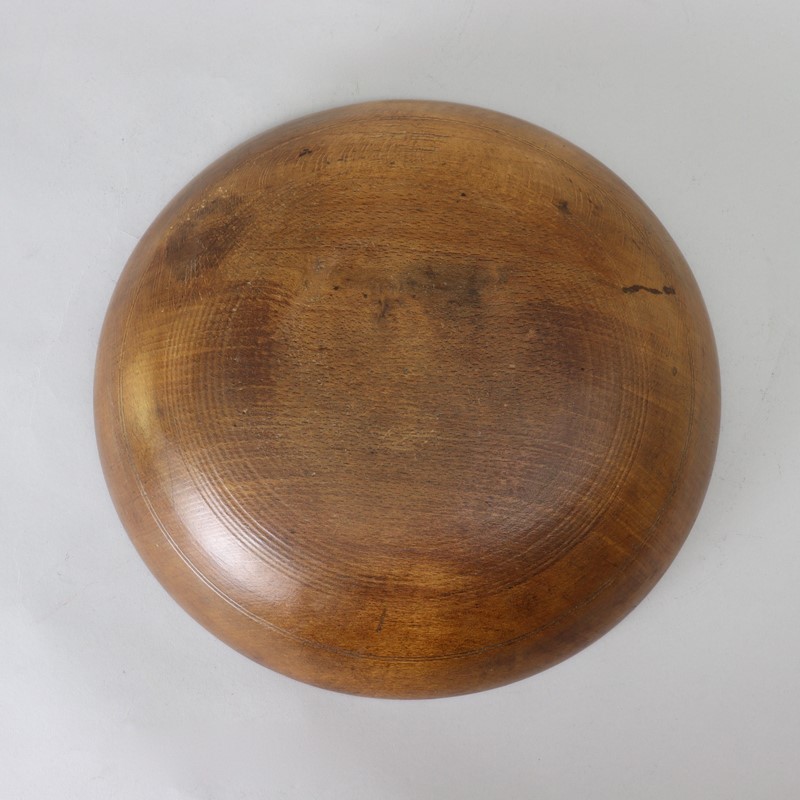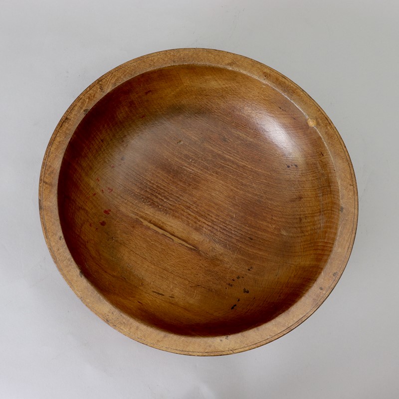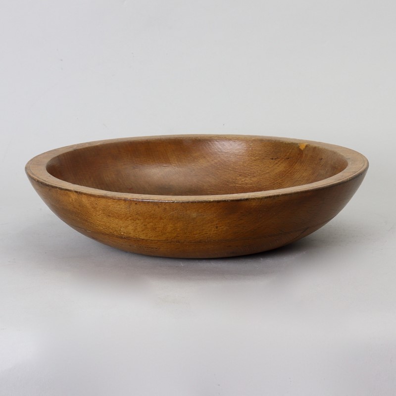 A 19th century, turned wooden dairy bowl. Wooden bowls of this open form were used in the dairies for working the butter. English examples were usually turned from sycamore but this is turned from beechwood. It is probably French and dates from c.1860. There is some staining to the wood and a small crack to the interior has been filled. Otherwise it is in good condition.