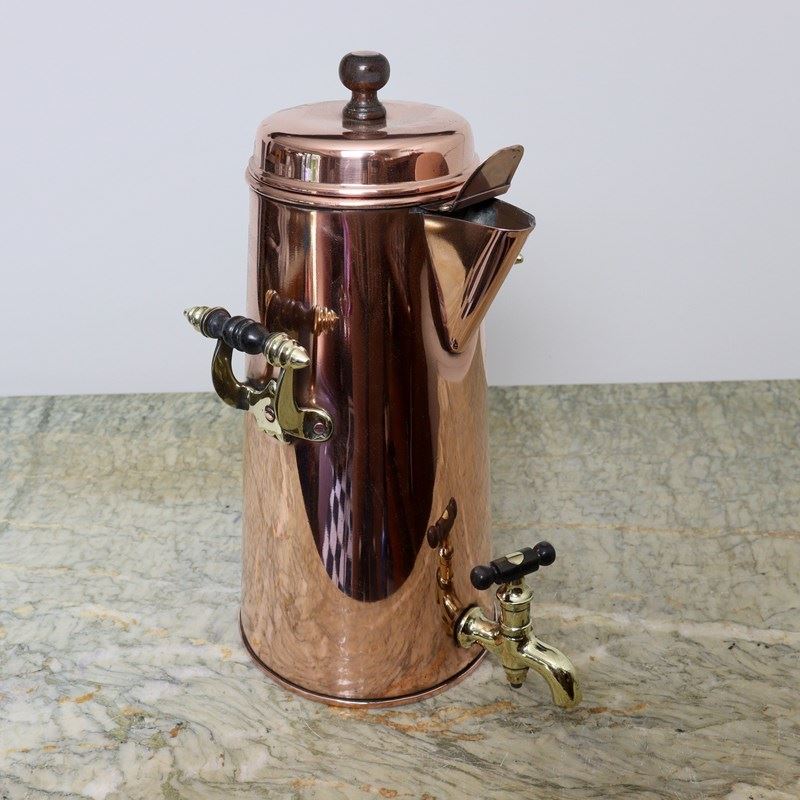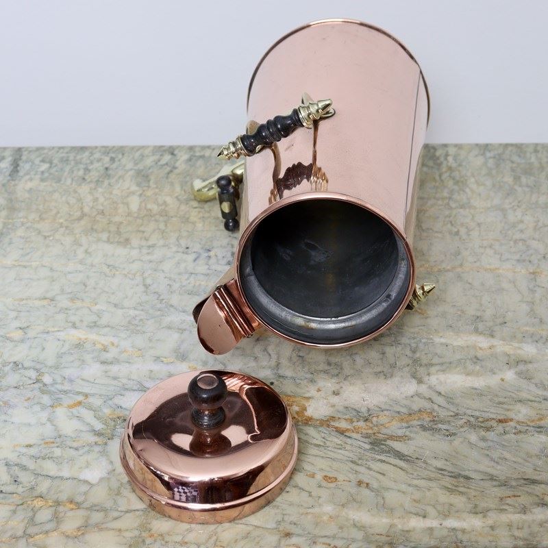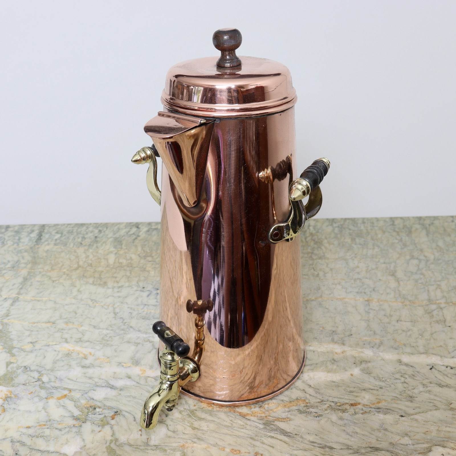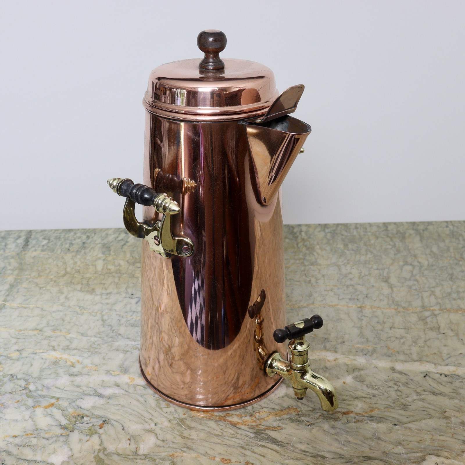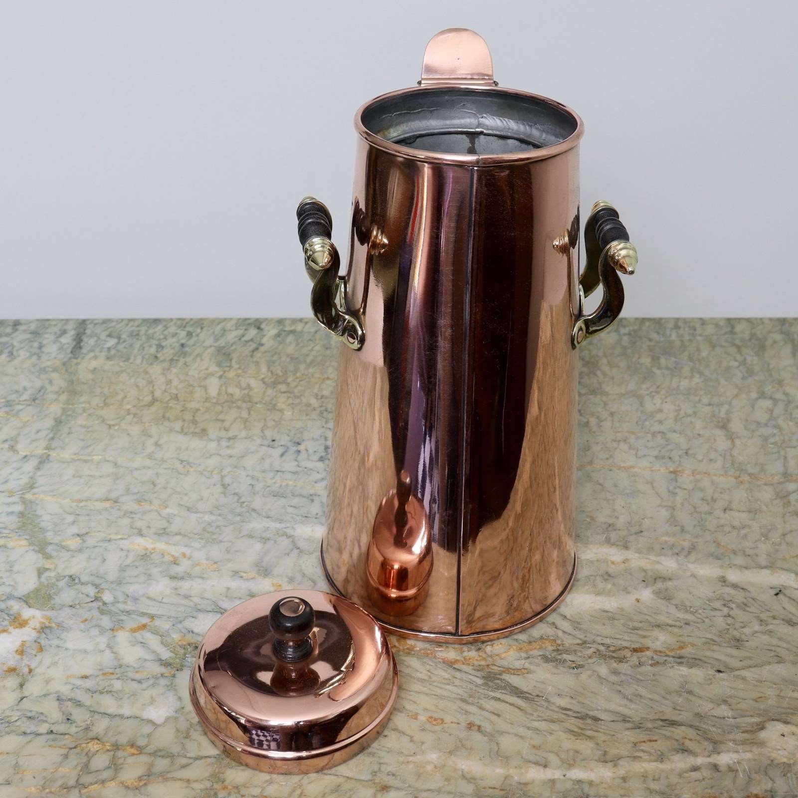 An unusual, double skinned, English copper coffee pot for keeping coffee warm. This has an inner section for the coffee and an outer section for hot water. The tapered body has nicely shaped, brass handles and tap, with turned wood fittings, and there is a turned wood finial to the lid. Under the lid is a plaque which reads: