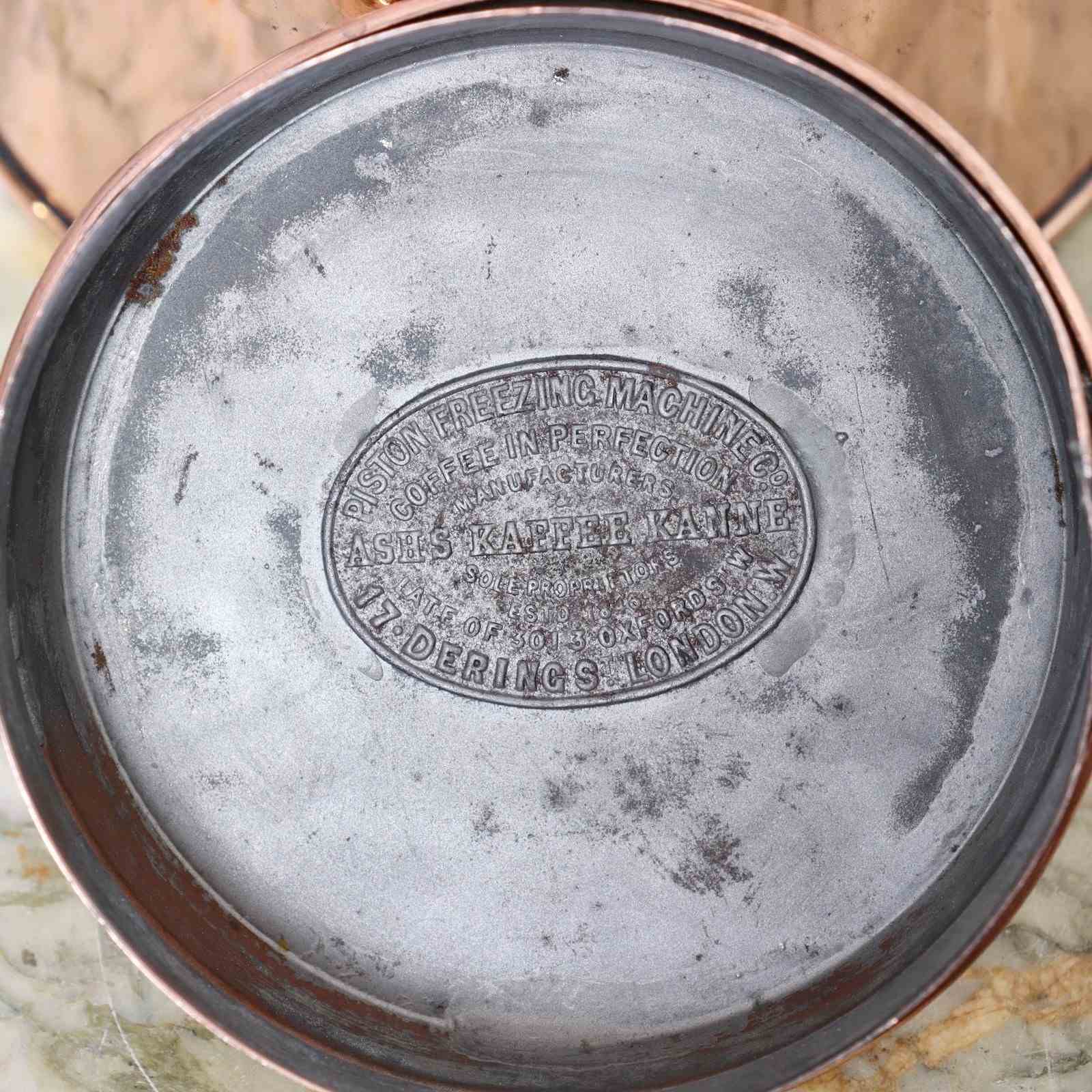 “PISTON FREEZING MACHINE Co. COFFEE IN PERFECTION. MANUFACTURERS. ASH’S KAFFEE KANNE. SOLE PROPRIETORS ESTD 1846. LATE OF 3013 OXFORD ST. W. 17 DERINGS LONDON W”.