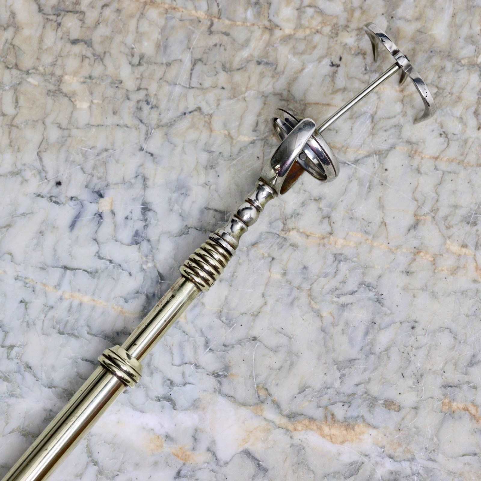 An unusual, 19th century, telescopic brass tasting fork. This would have been used for toasting bread in front of an open fire. It is English and it dates from c.1860. It has a beautifully turned wooden handle with a brass fitting on the end so that it can hang by the fire when not in use. There is a swivelling brass hook to hold the bread, and the arm extends from 22cm. to 44cm. It is in excellent condition.