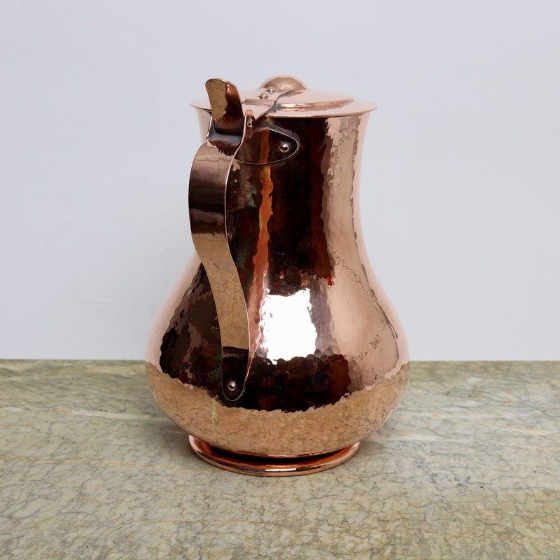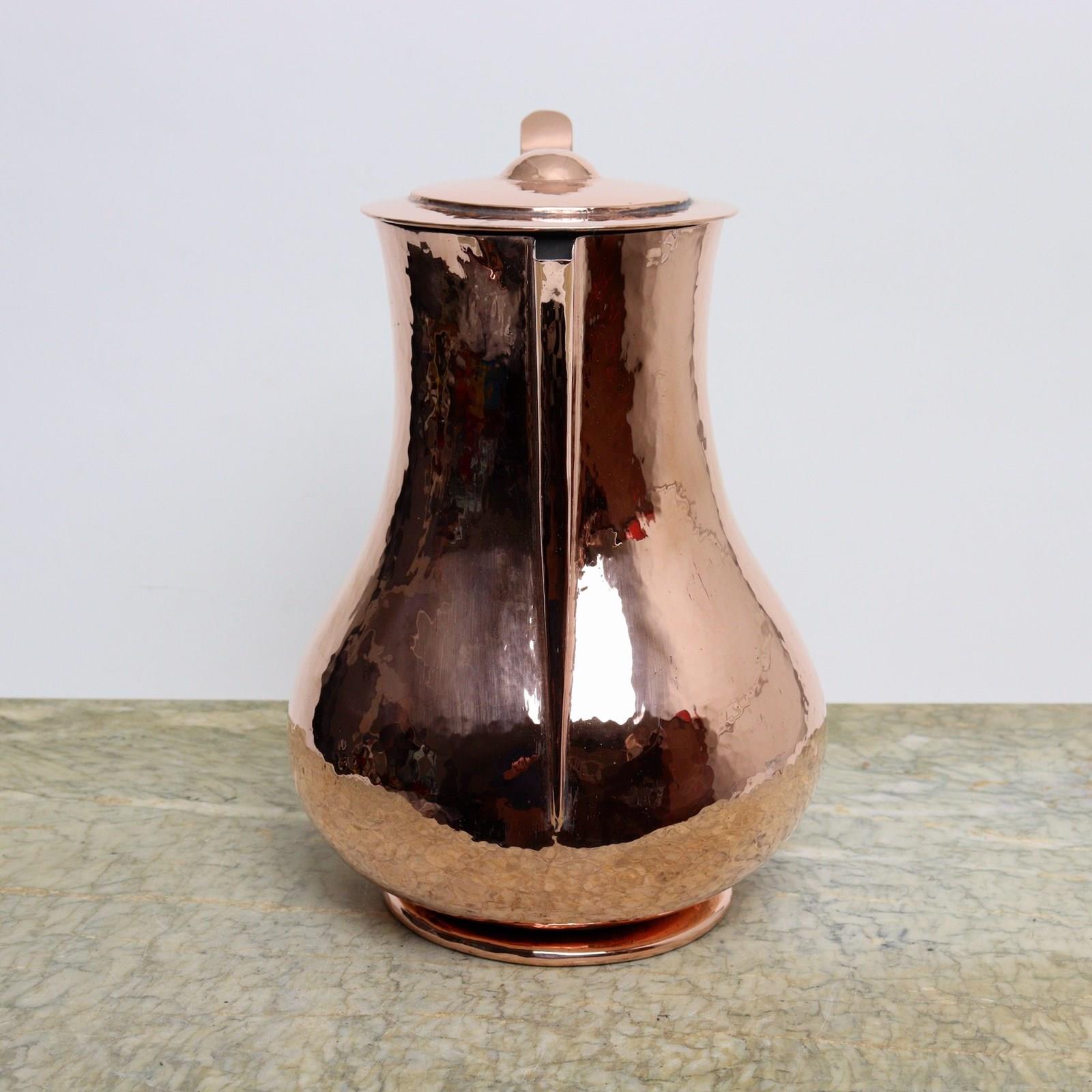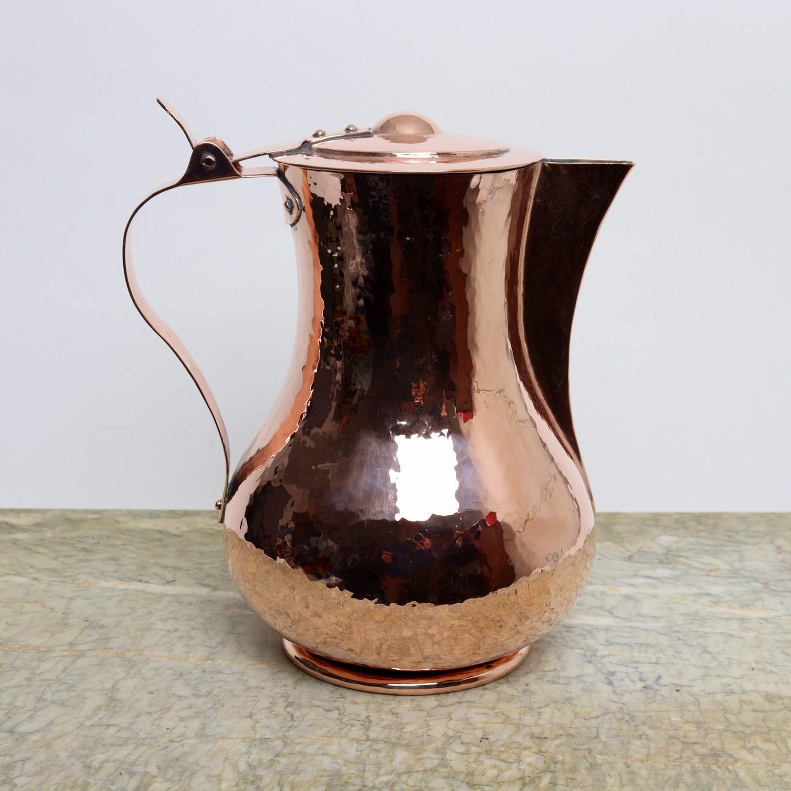 An unusual, 19th century, French copper jug with a hinged lid. This is well made, from a heavy gauge of copper, and it dates from c.1840. The jug has castellated seams and the copper has a planished finish. The spout is a very unusual, narrow form and the flat, strap handle has a thumb plate hinge attached to the nicely shaped lid. This is a very attractive piece and it is in excellent condition. The tinning, to the interior, is slightly worn.