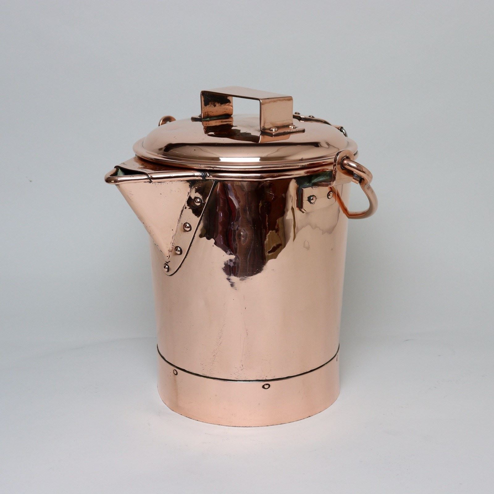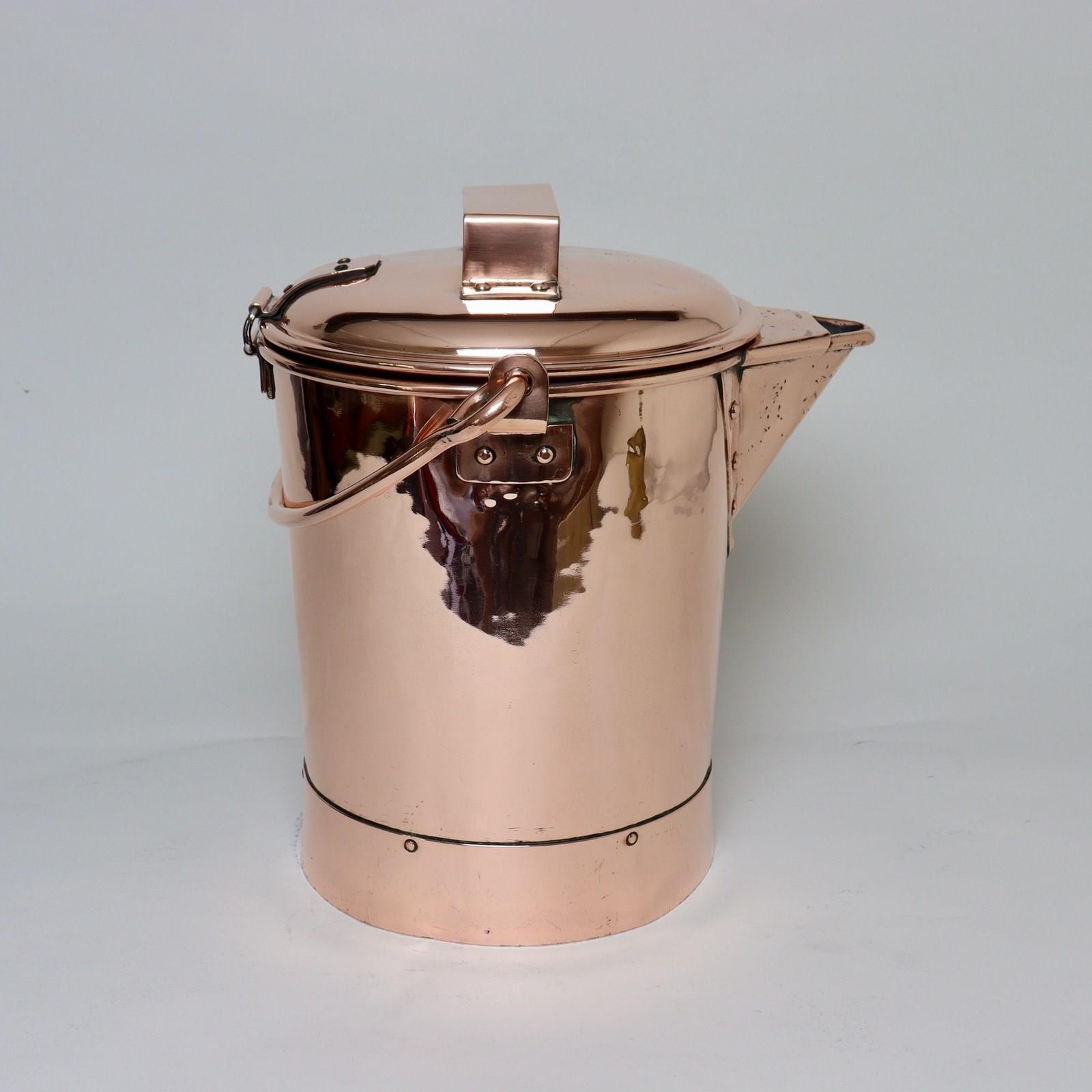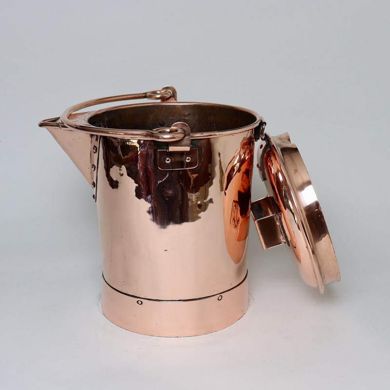 A very unusual, 19th century, lidded copper bucket. This is well made, from an exceptionally heavy gauge of copper, and it dates from c.1880. It was possibly, originally, made for use as a water carrier on a train, as it is very stable, but it was not made for food use as it has never been tinned. The lid is hinged, and attached by flat, strap fittings, and there is a flat, strap form handle to the lid. Both the base, and the wide spout, are riveted on and the piece has a heavy, copper, folding handle. There is minor denting to the sides but otherwise it is in very good condition.