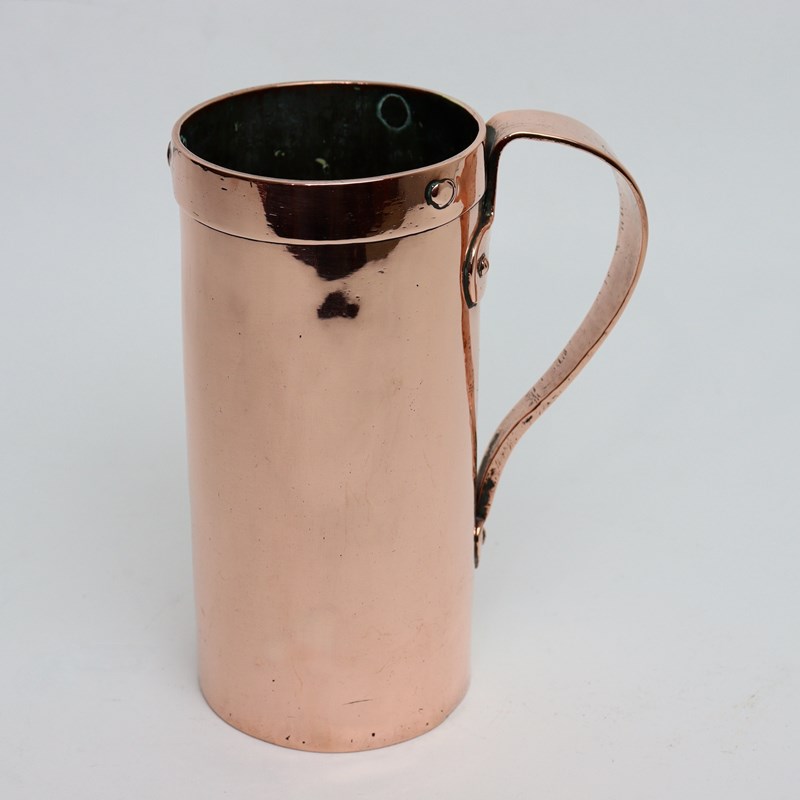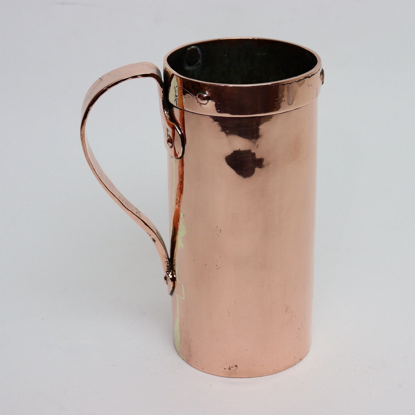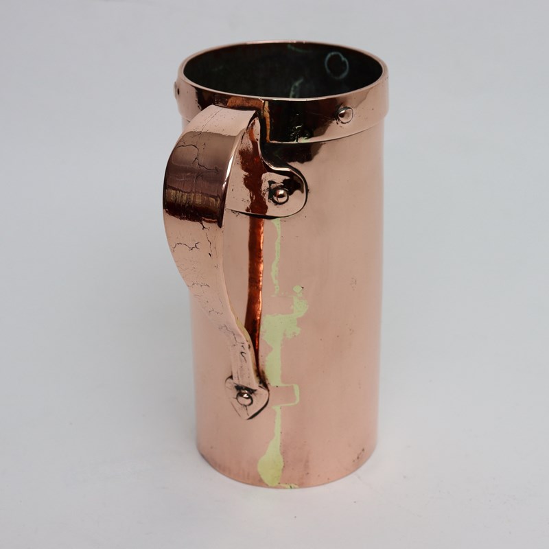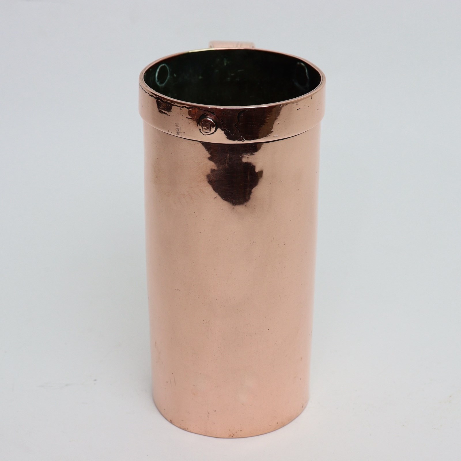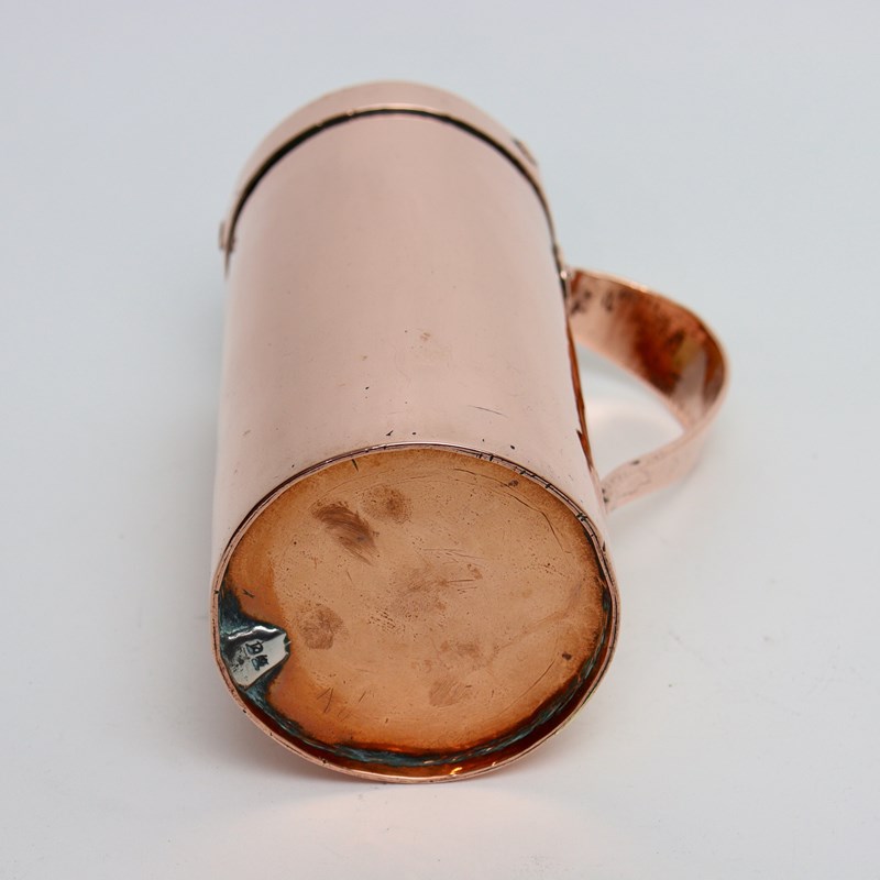 An unusual, straight sided, French copper measure. This is well made, from a heavy gauge of copper, and it has castellated seams. It has a flat, strap handle, with nicely shaped terminals, and there is a band around the top for reinforcement. To the base is an assay mark which is impressed with the measure size but this has been over stamped and is no longer legible. The piece is in very good condition but the tinning, to the interior is worn. As the interior was tinned the measure must have been for some type of foodstuff.