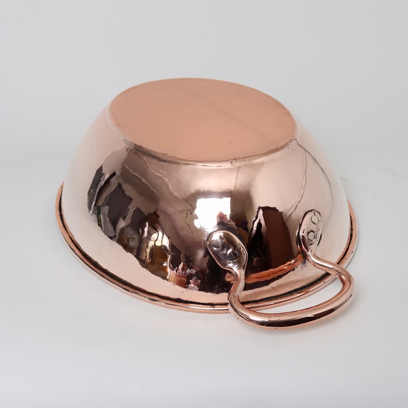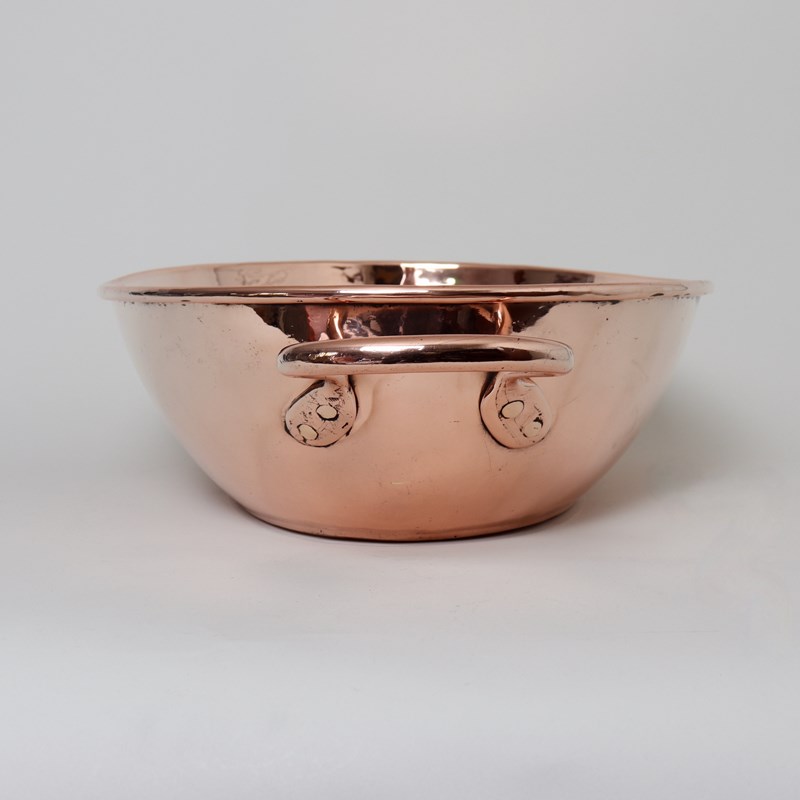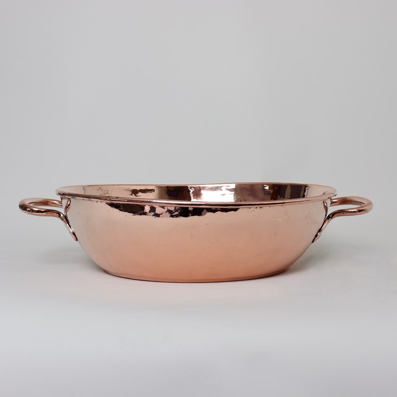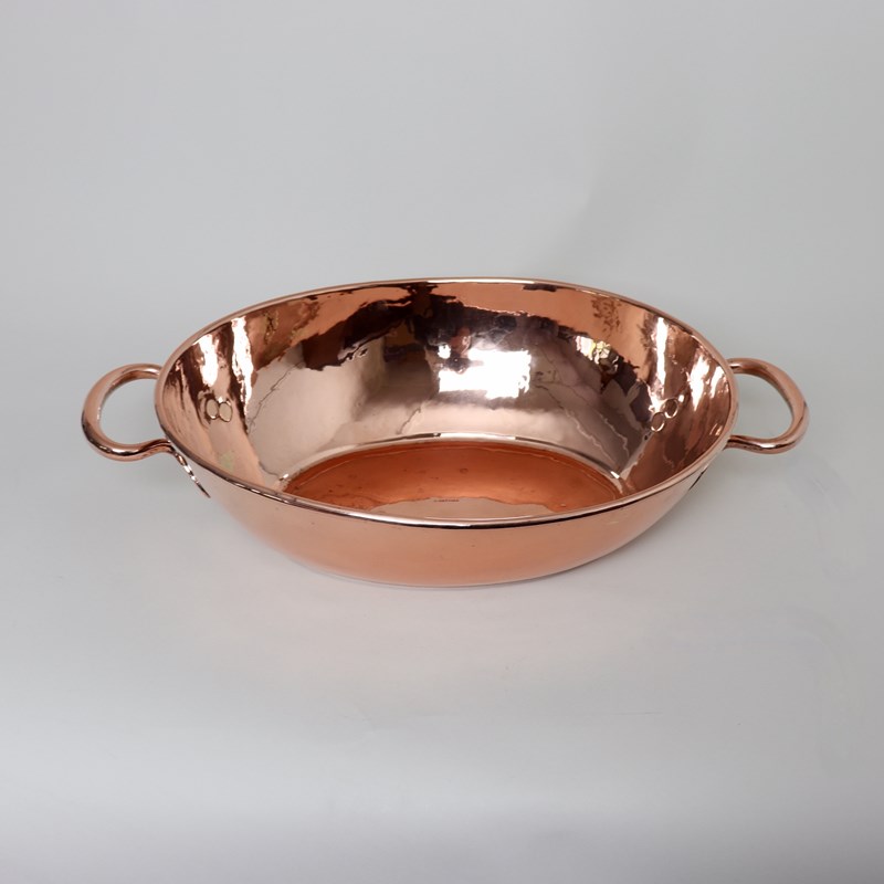 An unusual, 19th century, English copper bowl. This is stamped, to the interior of the base “G. RESTALL”. I do not know of a copper manufacturer by this name so it is more likely to be the name of a previous owner. This was probably, originally made as a preserve pan but it is very unusual to find an oval example. It is made from a heavy gauge of copper and has fairly simple copper handles to the ends. There is slight pitting to the copper, on the interior of the base, but otherwise the piece is in very good condition.