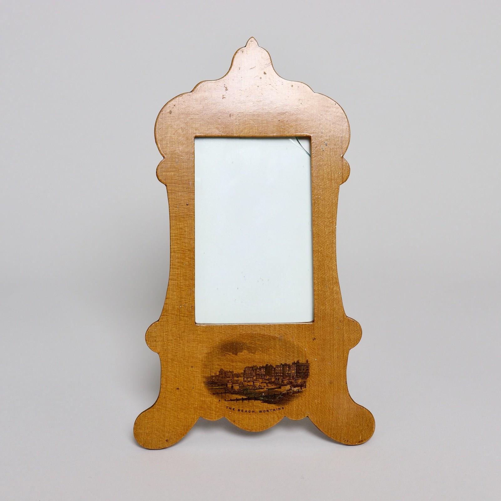 Unusual shaped, 19th Century, Mauchline Ware frame. Transfer printed with The Beach Worthing. Date c.1880. Corner of glass broken, otherwise in good condition.