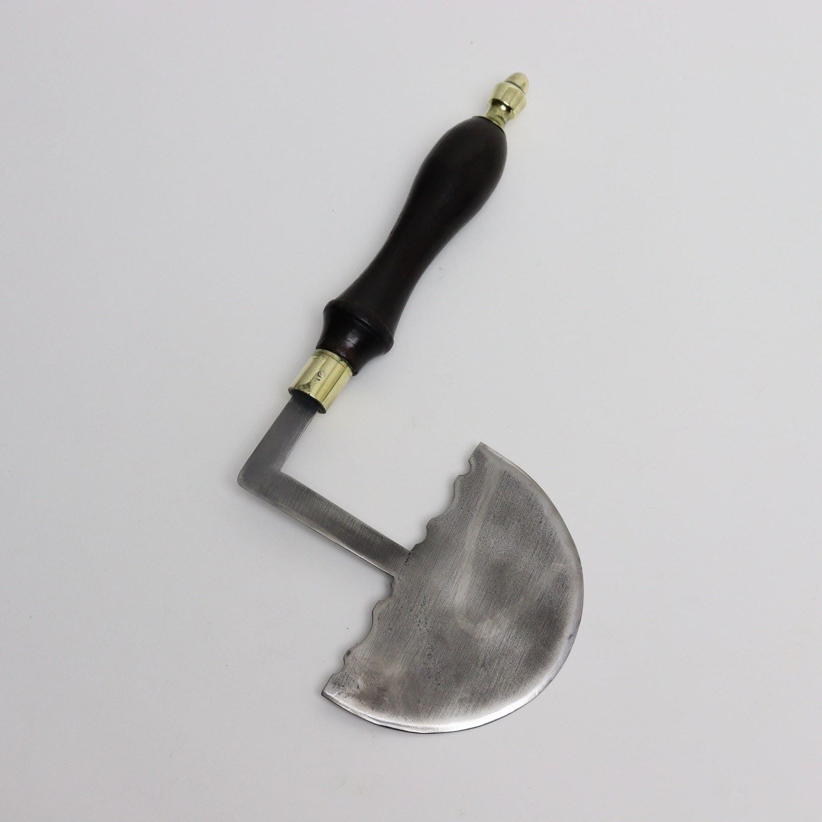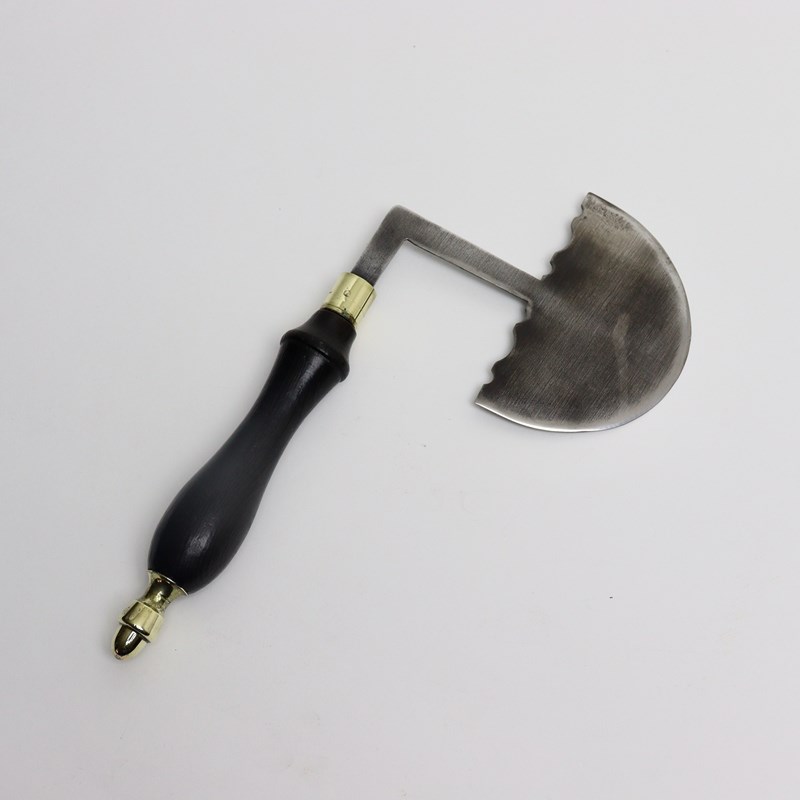 An unusual shaped, 19th century, steel herb or vegetable chopper. This is English and it dates from c.1860. It would most likely have been used for chopping in a bowl, due to the small, semi circular cutting edge on the blade and the extended leg to the handle. The handle is turned from oak and is attached by well made, brass fittings. The piece is in excellent condition and is still very sharp.