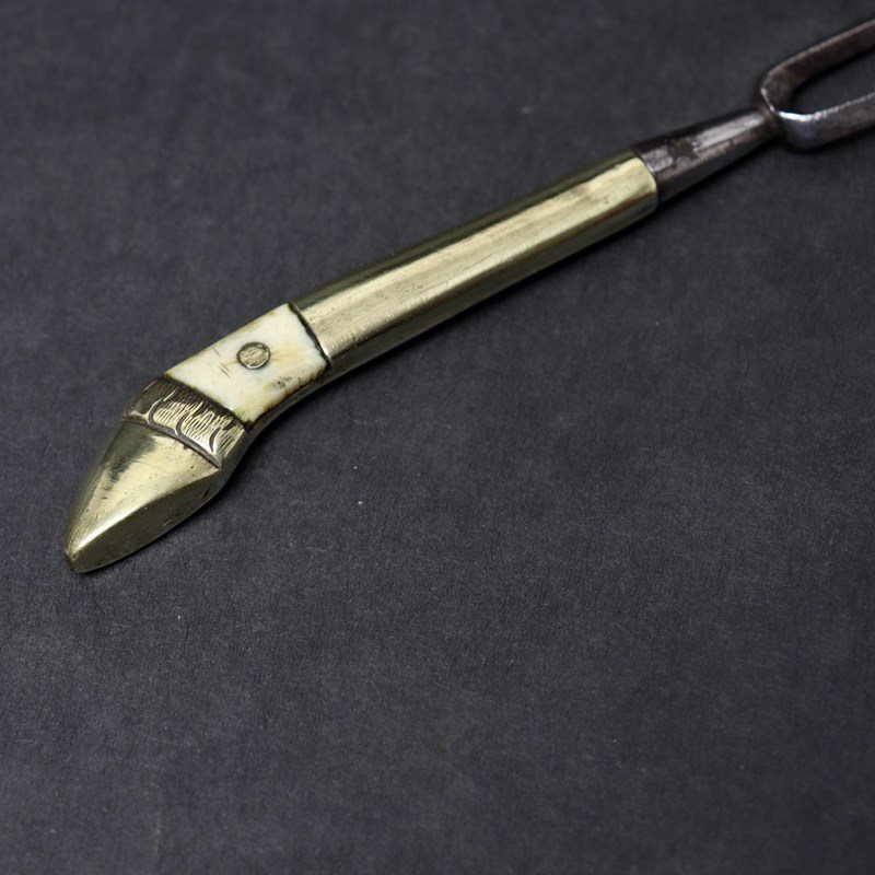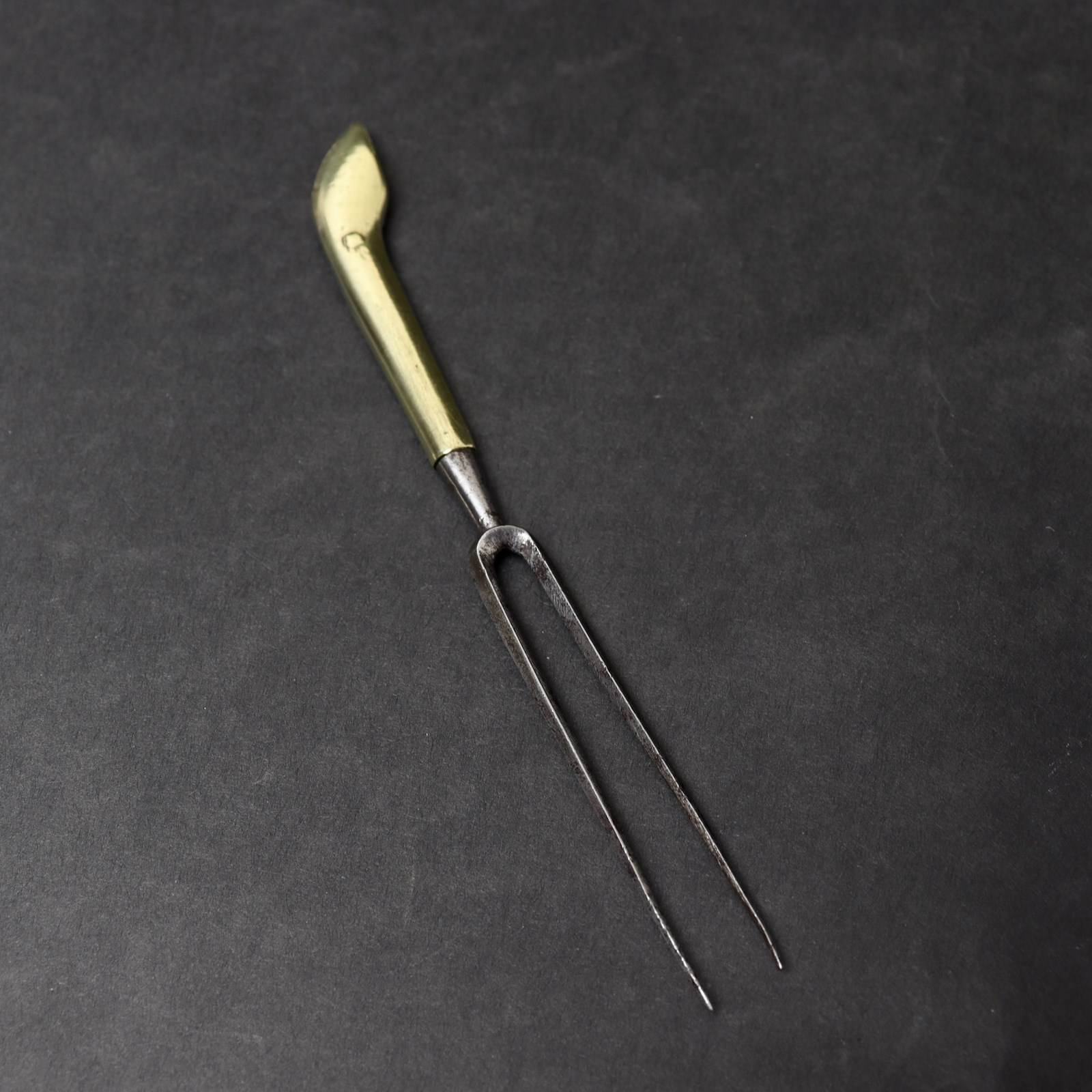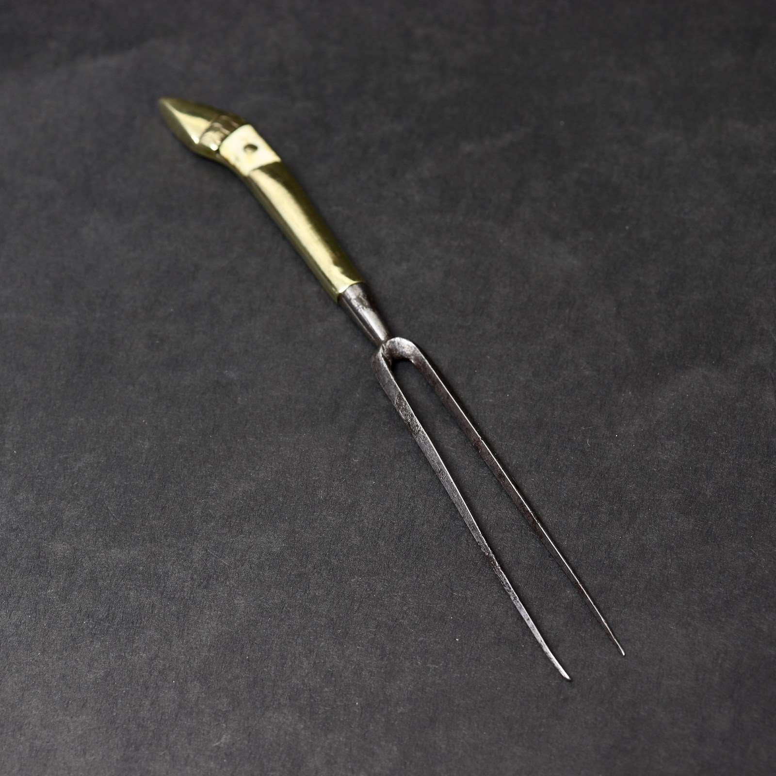 A very unusual, small, two pronged steel fork with a brass and horn handle in the shape of a hoof. This is French and it dates from c.1860. The handle is beautifully made, with good detail in the hoof. The piece is in good condition, with just slight pitting to the steel, from use.