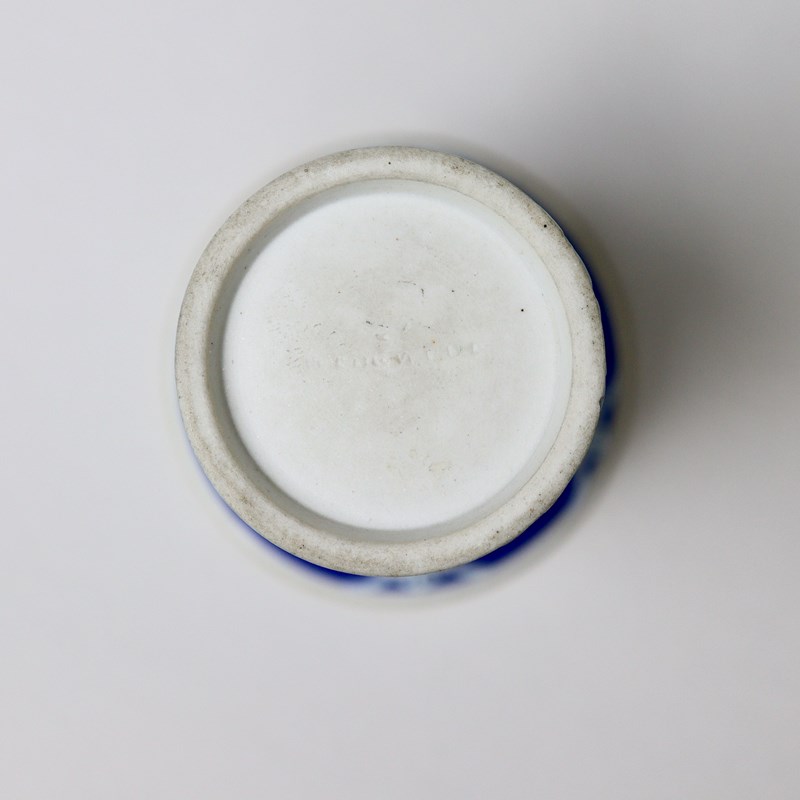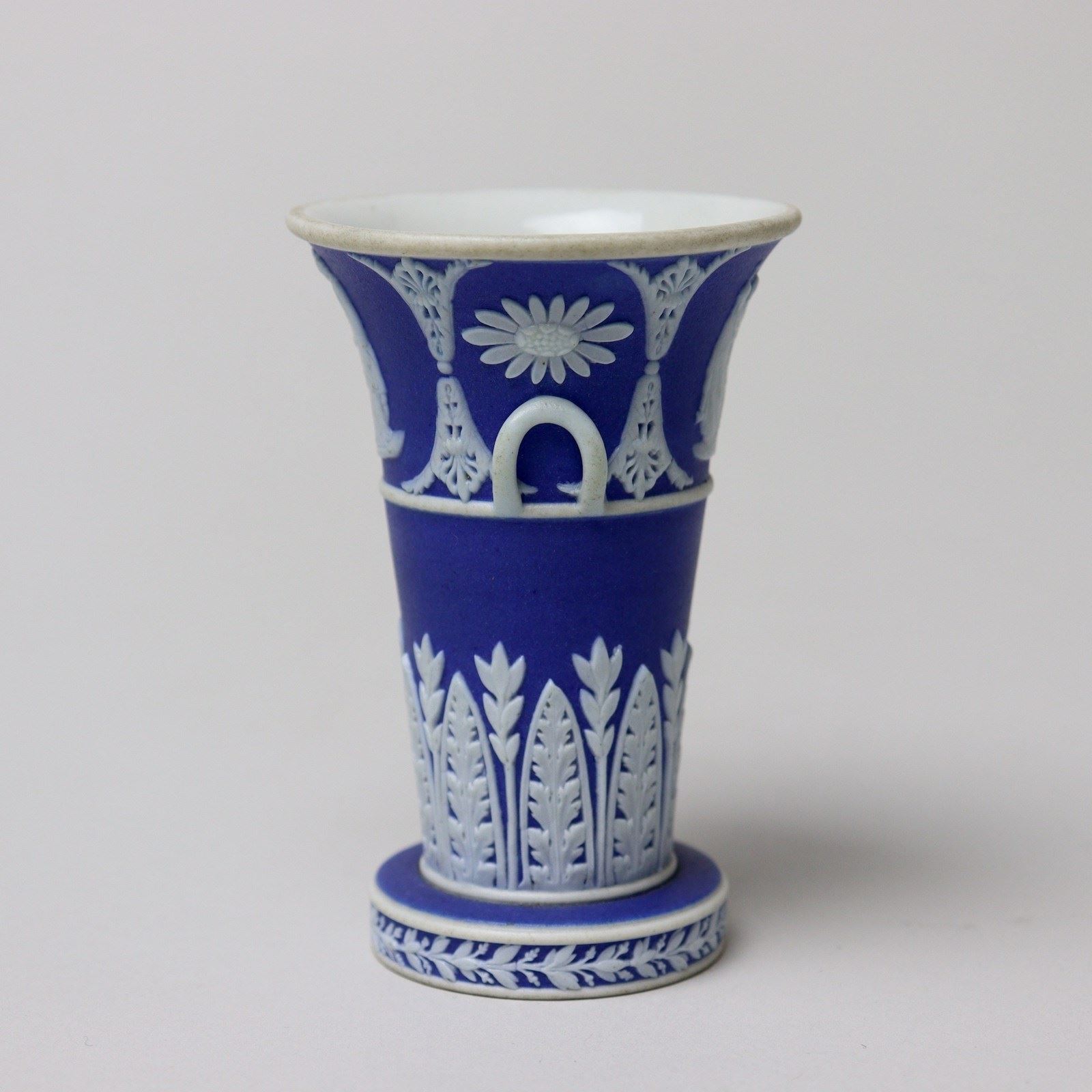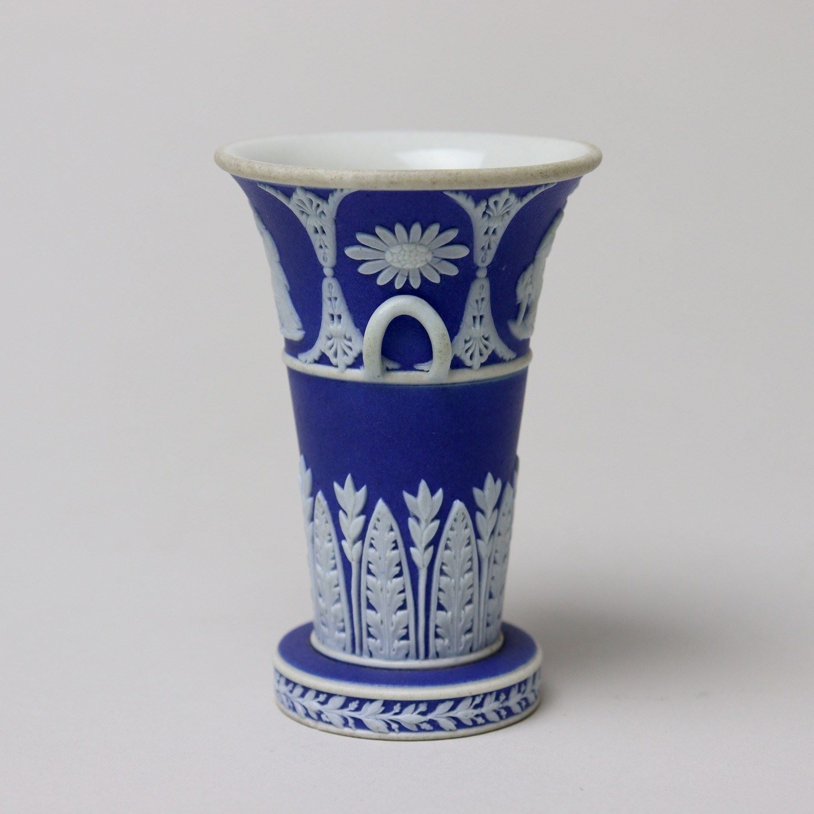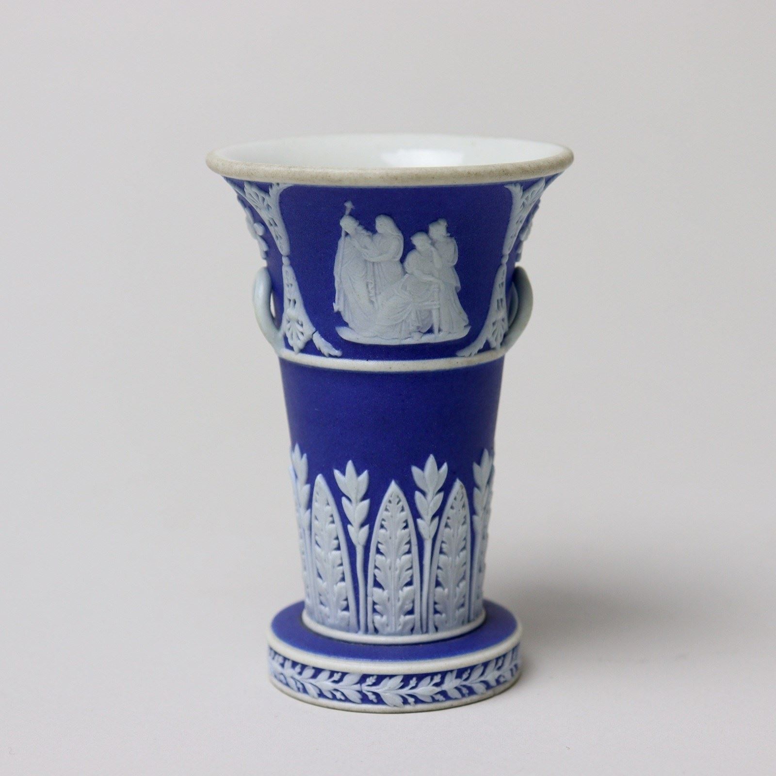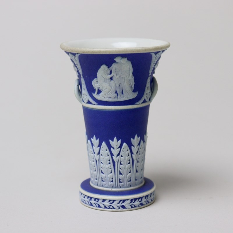 A very unusual, miniature, Wedgwood, dark blue jasper dip, two handled vase. This is marked “WEDGWOOD” and it dates from c.1820. Miniature pieces of this period are very hard to find. It is decorated to the rim, in white relief, with two classical subjects which are divided by anthemion and stylised flowers. Beneath this is a wide band of acanthus and there is a narrow laurel and berry border to the foot. The reliefs are very good quality and the piece is in excellent condition.